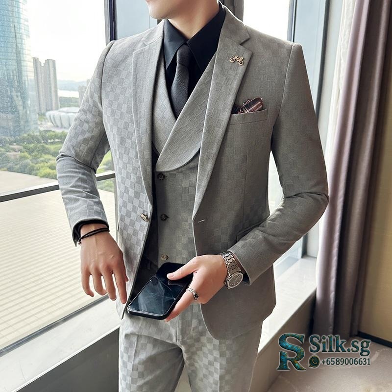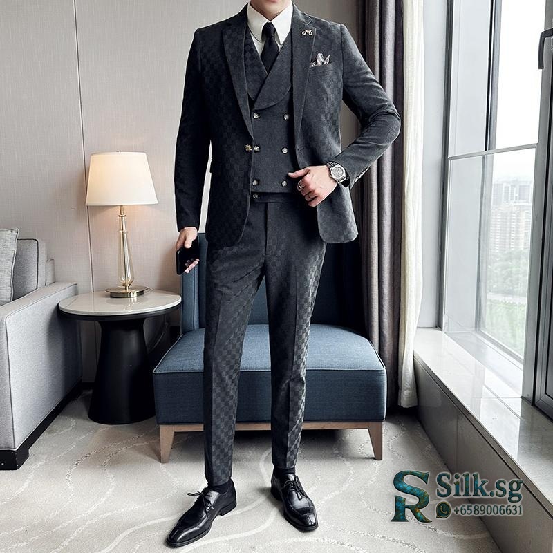 Hanfanxi – Men’s Slim Fit Check Blazer Suit Set with Vest & Trousers,