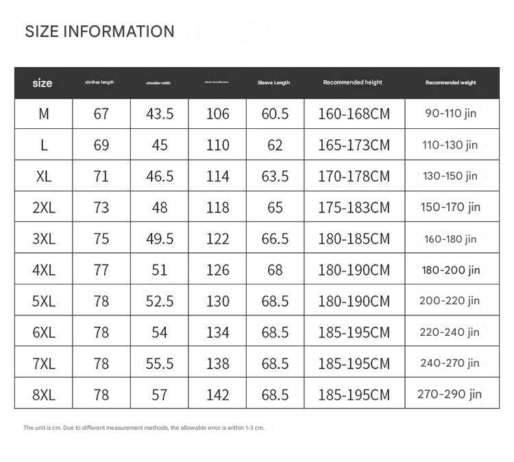 | Size | 2XL 140-77.5kg, 3XL 155-85kg, 4XL 170-95kg, 5XL 190-105kg, 6XL 210-115kg, 7XL 230-125kg, 8XL 250-135kg, L 110-62.5kg, M 90-55kg, XL 125-70kg |