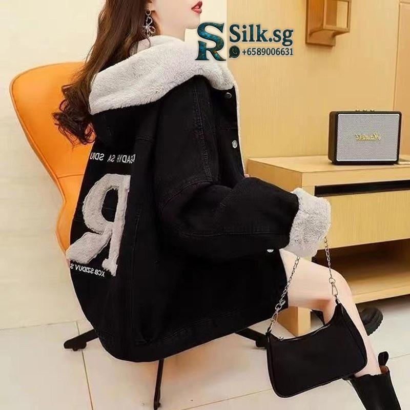 Stay cozy and stylish with this fleece-lined denim jacket, featuring a warm quilted design and versatile loose fit. Perfect for casual winter days, its unique shearling-style hood and batwing sleeves offer effortless comfort. Discover your new favorite layer for a relaxed, chic look.
