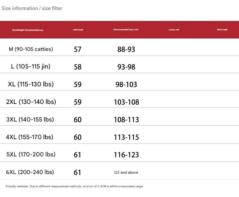| Size | 2XL (130-70 kg), 3XL (140-77.5 kg), 4XL (155-85 kg), 5XL (170-100 kg), 6XL (200-120 kg), L (105-57.5 kg), M (90-52.5 kg), XL (115-65 kg) |