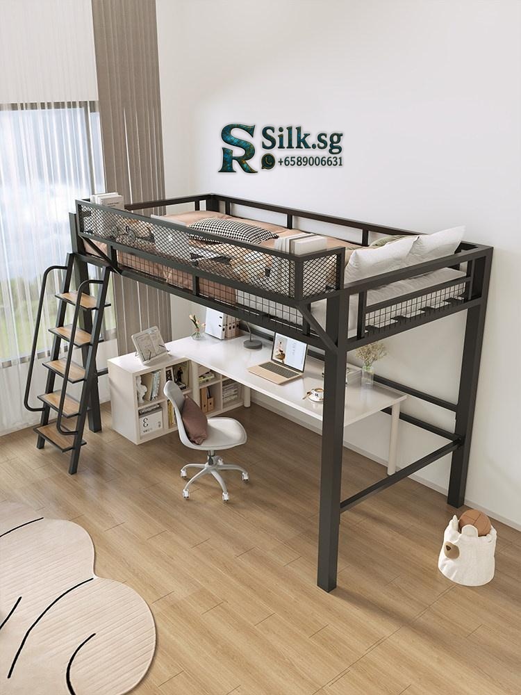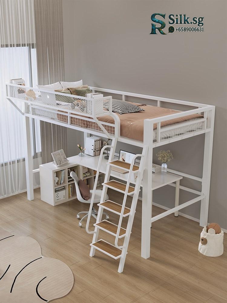 This iron loft bed offers clever space-saving with a double-level design, a spacious under-desk area, and stylish safety guardrails. Perfect for small bedrooms, it combines durability with a modern look while providing ample storage. Make your space functional and inviting today.