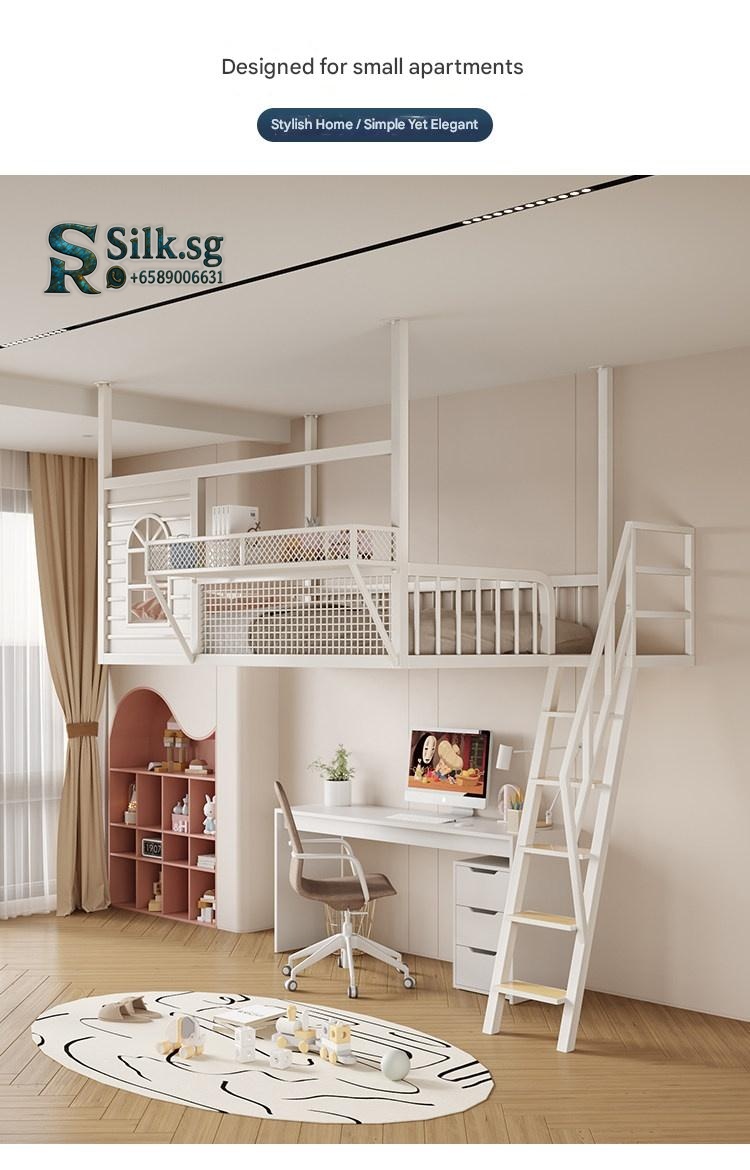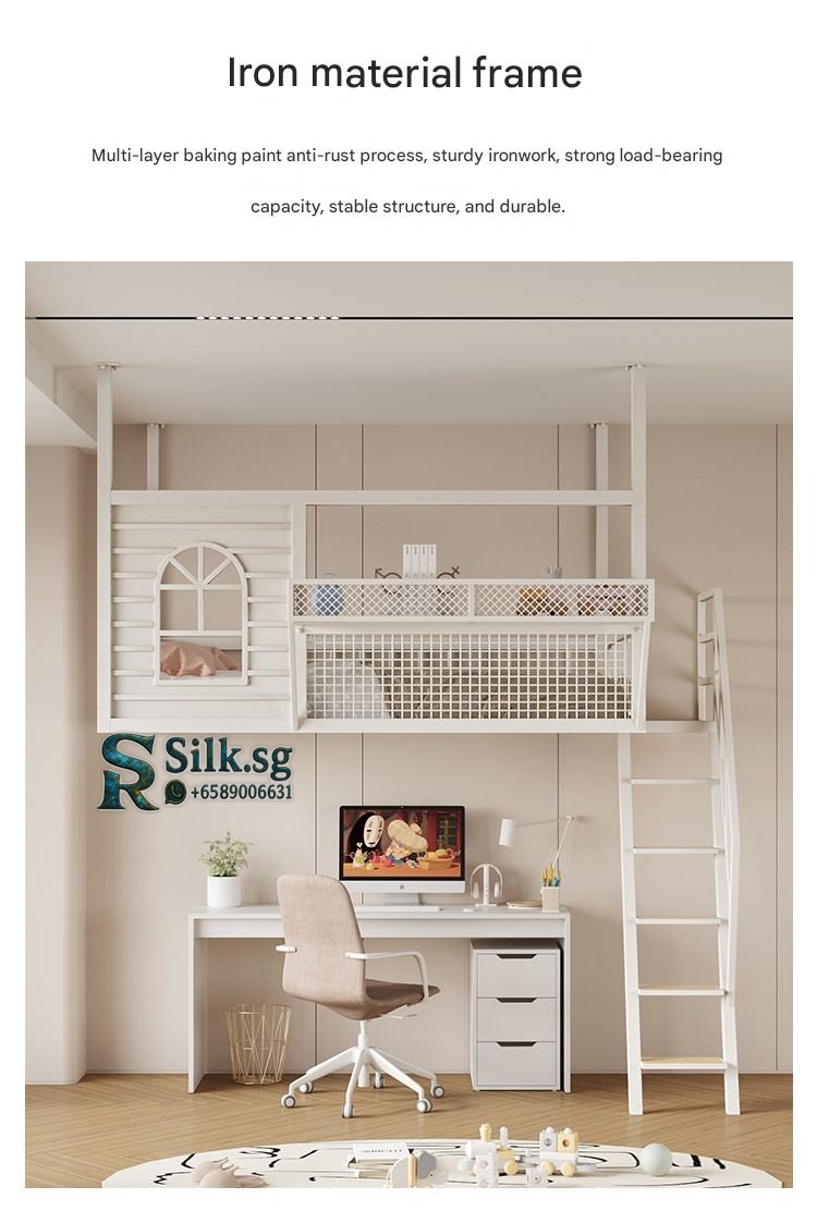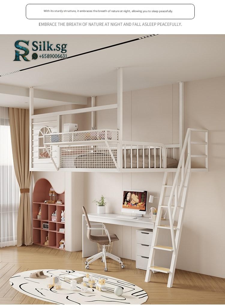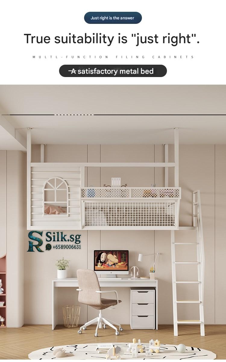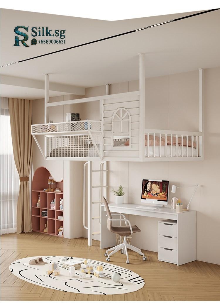 Create efficient space with this Nordic iron loft bed featuring a cozy upper sleeping area, integrated storage, and a playful cartoon design. Perfect for kids rooms or shared spaces, its durable metal frame ensures safety and style. Make bedtime fun and clutter-free today.