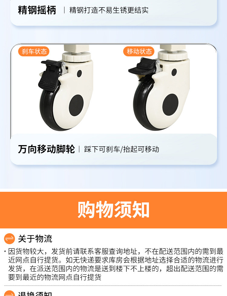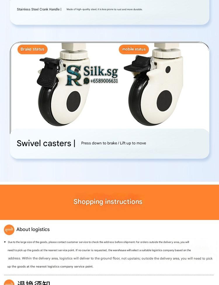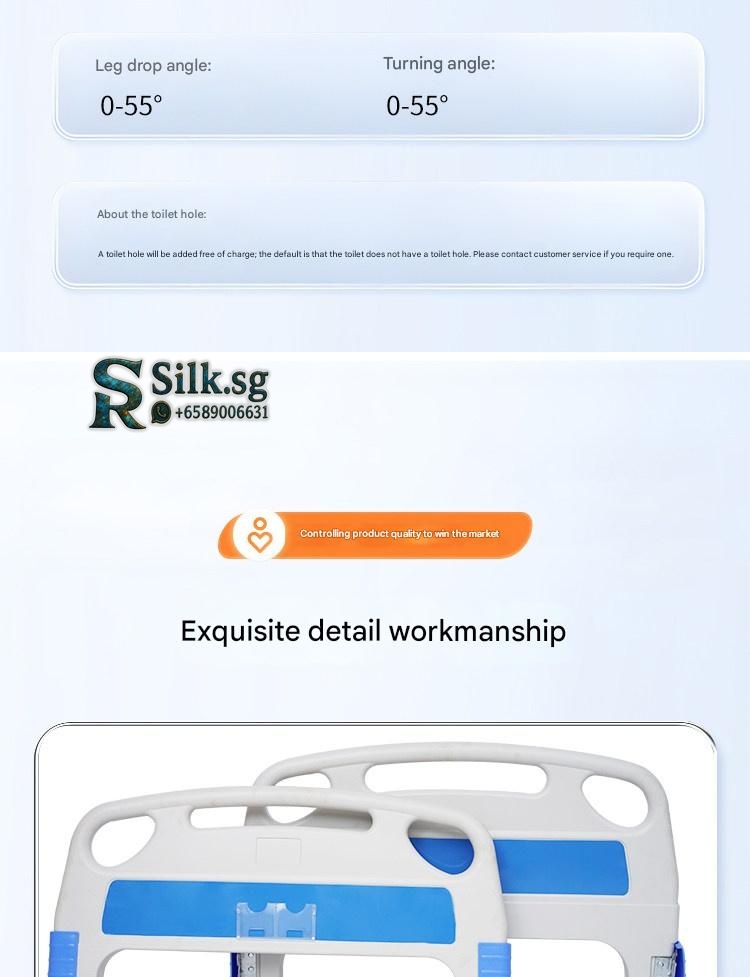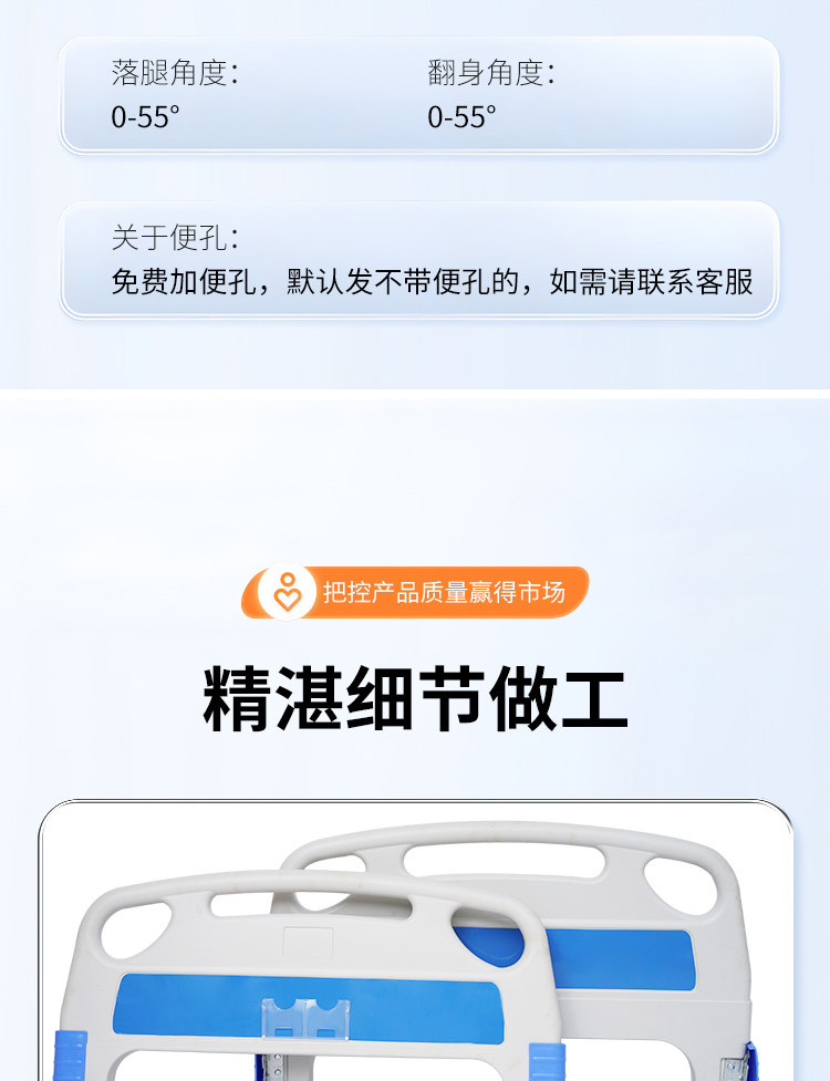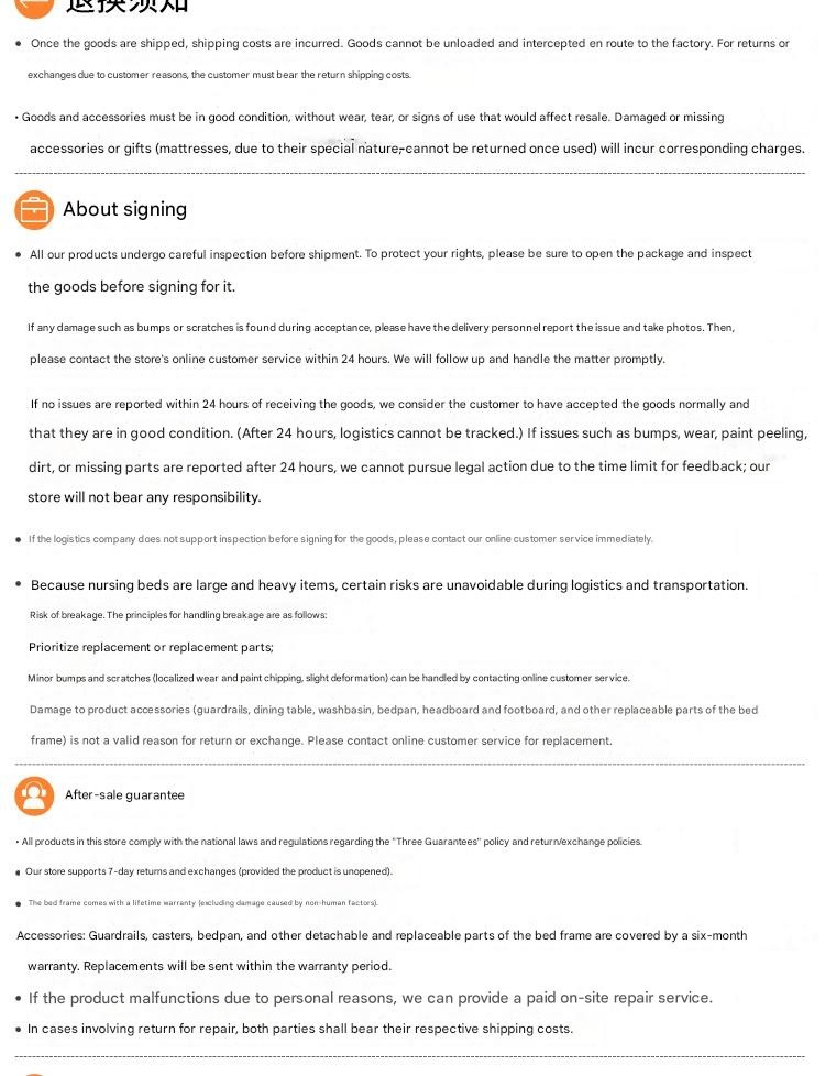 | Type | Double Rocking B1 Bed with ABS Head & Footboards, Double Rocking B2 Bed with ABS Head & Footboards + Guardrail + Mattress, Double Rocking B3 Bed with ABS Head & Footboards + Guardrail + Mattress + Dining Table, Double Rocking B4 Bed with ABS Head & Footboards + Guardrail + Mattress + Casters, Double Rocking B5 Bed with ABS Head & Footboards + Guardrail + Mattress + Dining Table + Casters + IV Stand, Double Rocking B6 Bed with ABS Head & Footboards + Guardrail + Mattress + Dining Table + Casters + IV Stand + Thick Massage Air Cushion, Full Curve Anti-Slip, Full Curve Full Turning Anti-Slip, Full Curve Full Turning Anti-Slip + Thick Massage Air Cushion, Full Curve Standard, Middle Curved Leg Z1 Backrest + Turning + Protection + Assistance + Leg Lift, Middle Curved Leg Z2 Backrest + Turning + Protection + Assistance + Leg Lift + Head & Foot Washing + Casters + IV + Dining Table, Middle Curved Leg Z3 Backrest + Turning + Protection + Assistance + Leg Lift + Head & Foot Washing + Casters + IV + Dining Table + Anti-Slip Side, Middle Curved Leg Z4 Backrest + Turning + Protection + Assistance + Leg Lift + Head & Foot Washing + Casters + IV + Dining Table + Anti-Slip + Reinforced Bar, Middle Curved Leg Z5 Backrest + Turning + Protection + Assistance + Leg Lift + Head & Foot Washing + Casters + IV + Dining Table + Anti-Slip + Thick Massage Air Cushion, Single Rocking A1 Bed with ABS Head & Footboards, Single Rocking A2 Bed with ABS Head & Footboards + Mattress, Single Rocking A3 Bed with ABS Head & Footboards + Guardrail + Mattress, Single Rocking A4 Bed with ABS Head & Footboards + Guardrail + Mattress + Dining Table, Single Rocking A5 Bed with ABS Head & Footboards + Guardrail + Mattress + Casters, Single Rocking A6 Bed with ABS Head & Footboards + Guardrail + Mattress + Dining Table + Casters + IV Stand, Single Rocking A7 Bed with ABS Head & Footboards + Guardrail + Mattress + Dining Table + Casters + IV Stand + Thick Massage Air Cushion, Sprayed Flat Bed |