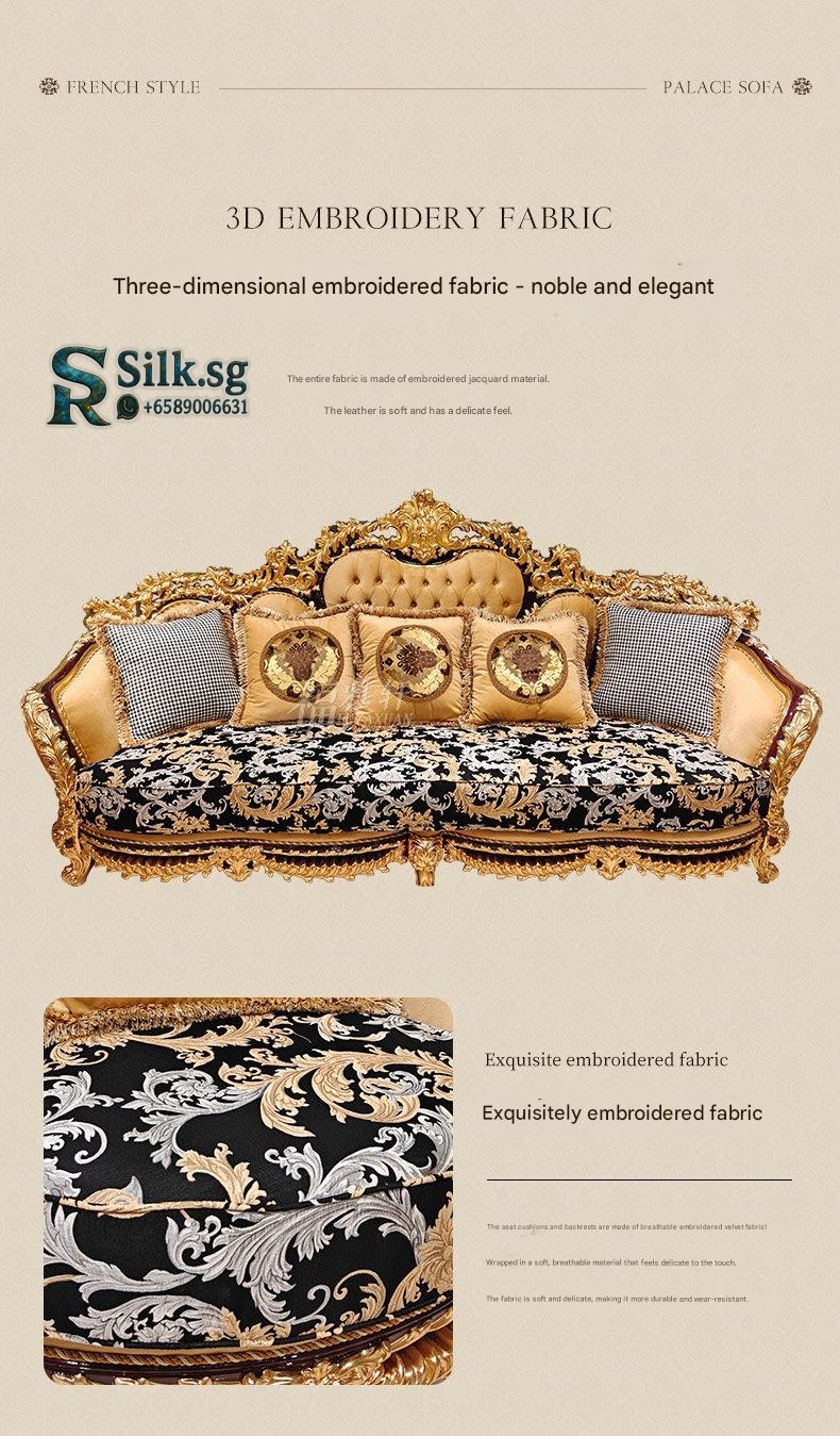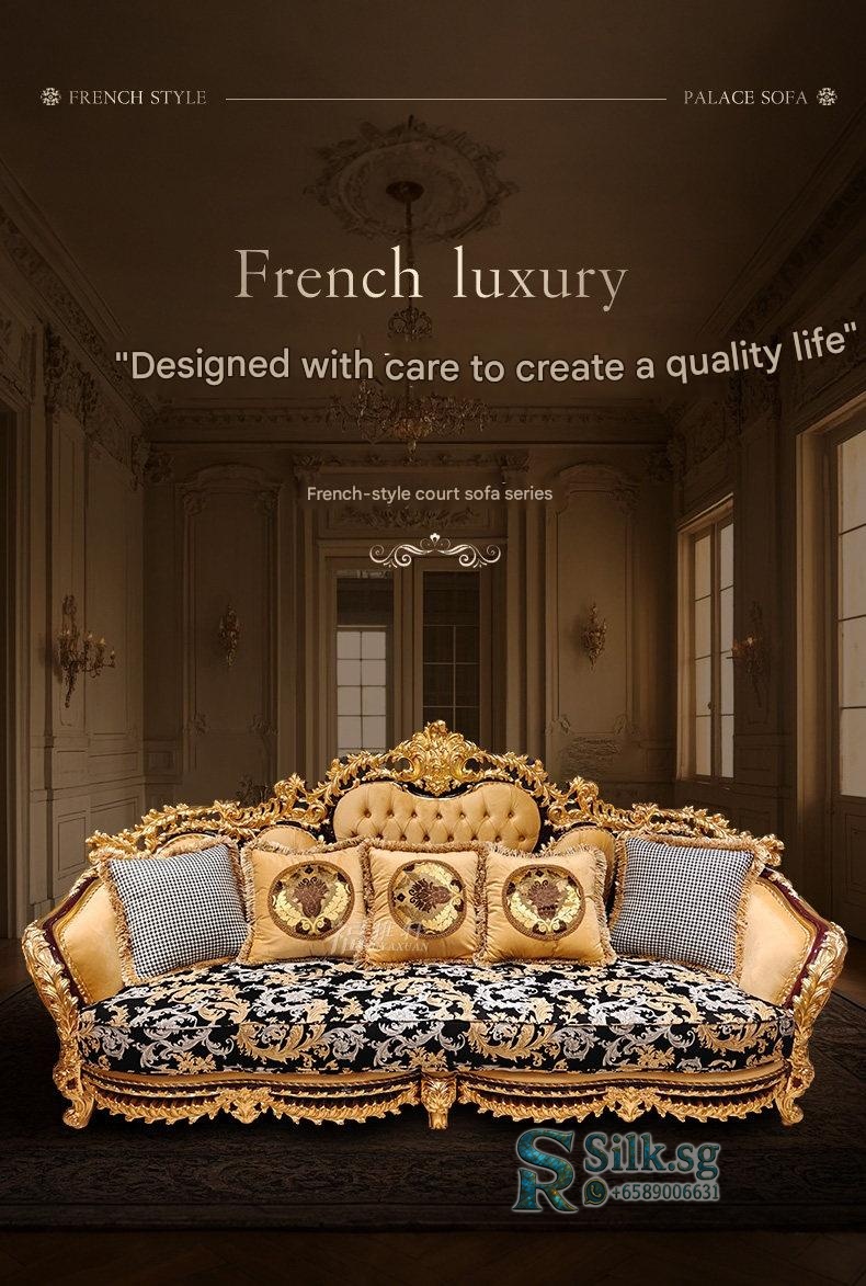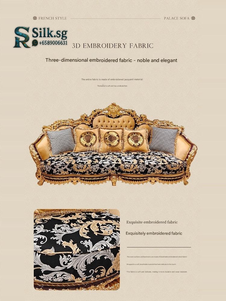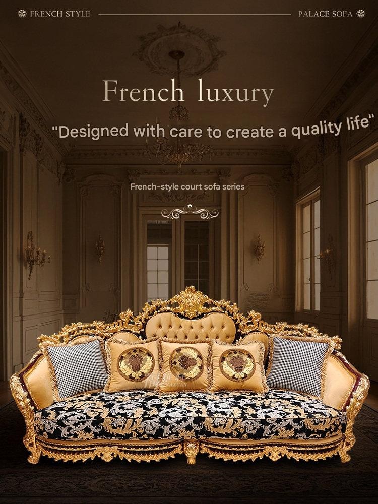 Experience timeless elegance with this French palace-style sofa, crafted from high-quality cotton and linen for luxurious comfort. Perfect for large living rooms or villas, its artistic design adds sophistication. A true centerpiece that invites relaxation and style.