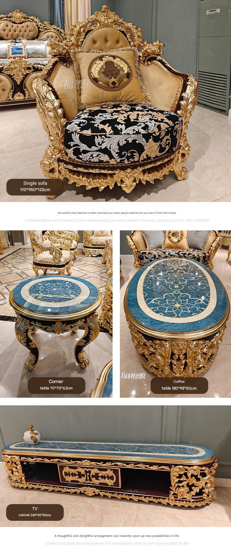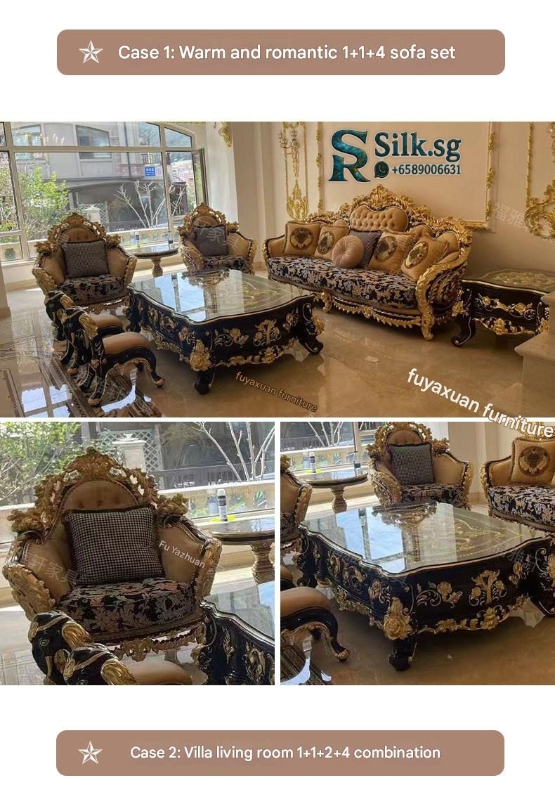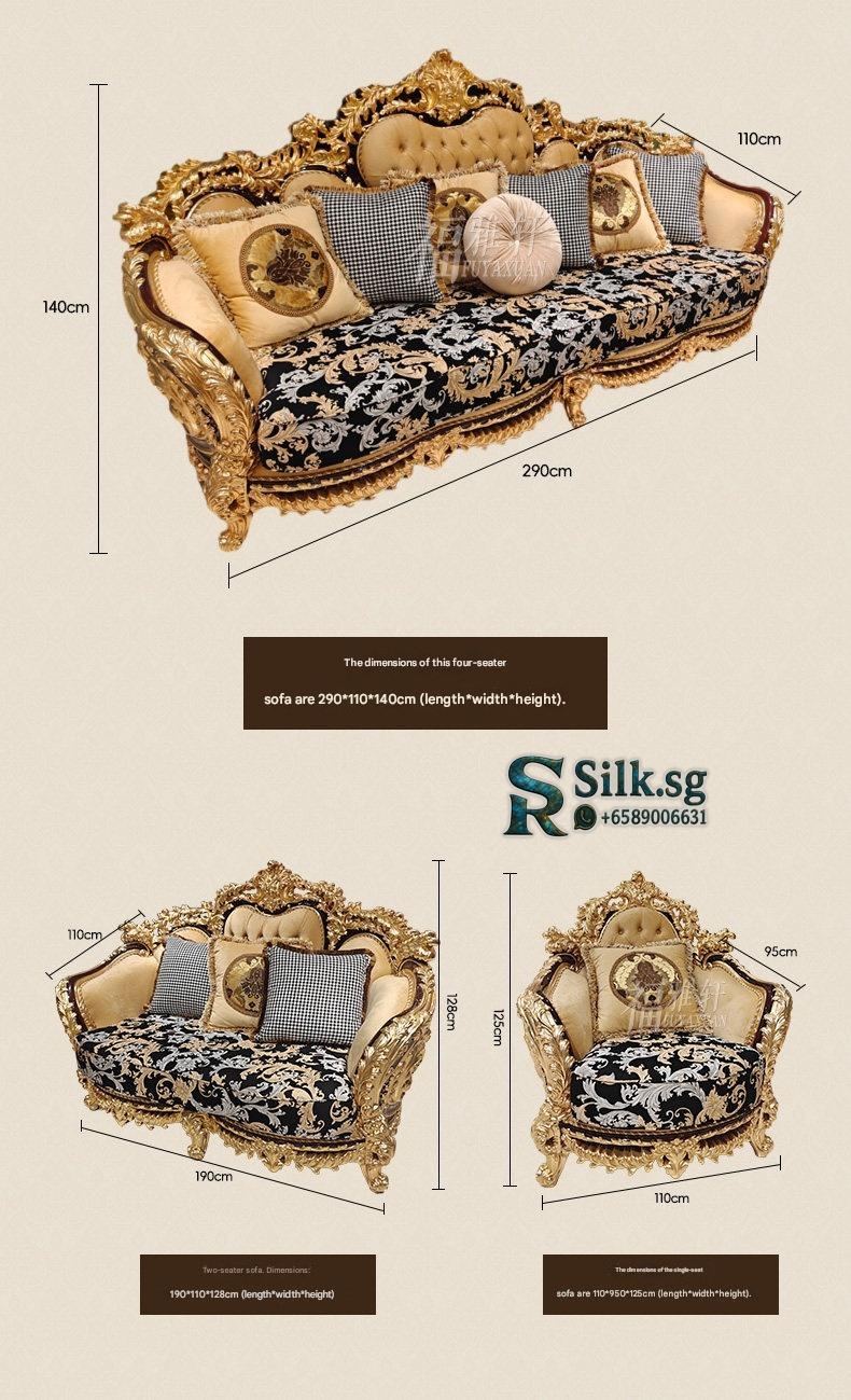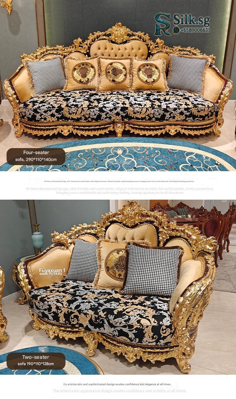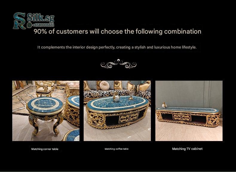 | Style | 2-Seat Sofa with Gold Leaf & Velvet, 3-Seat Sofa with Gold Leaf & Velvet, 4-Seat Sofa with Gold Leaf & Velvet, French Luxury Coffee Table with Gold Leaf & Shell Inlay, French Luxury TV Cabinet with Gold Leaf & Shell Inlay, French Palace Style Sofa Set 1+2+3, French Palace Style Sofa Set 1+2+4, French Round Corner Table with Gold Leaf & Shell Inlay, Single Seat Sofa with Gold Leaf & Velvet |