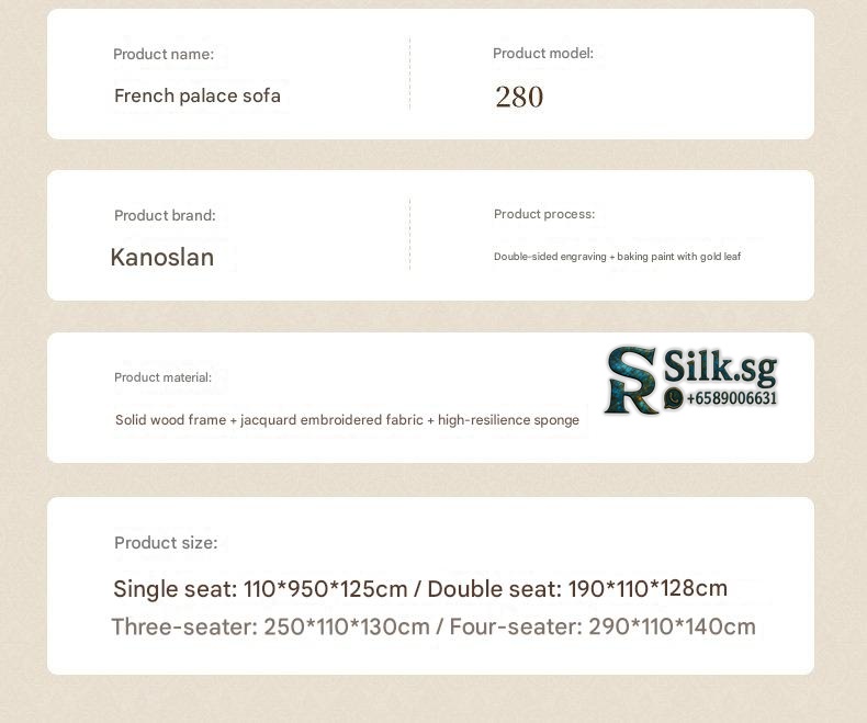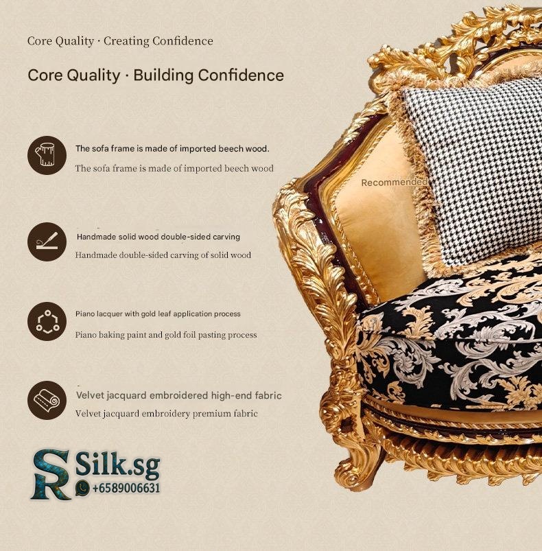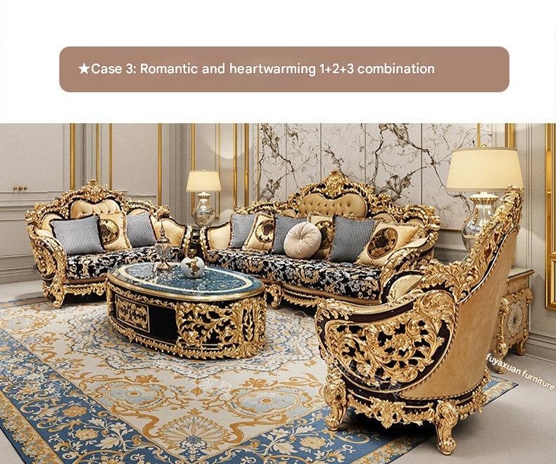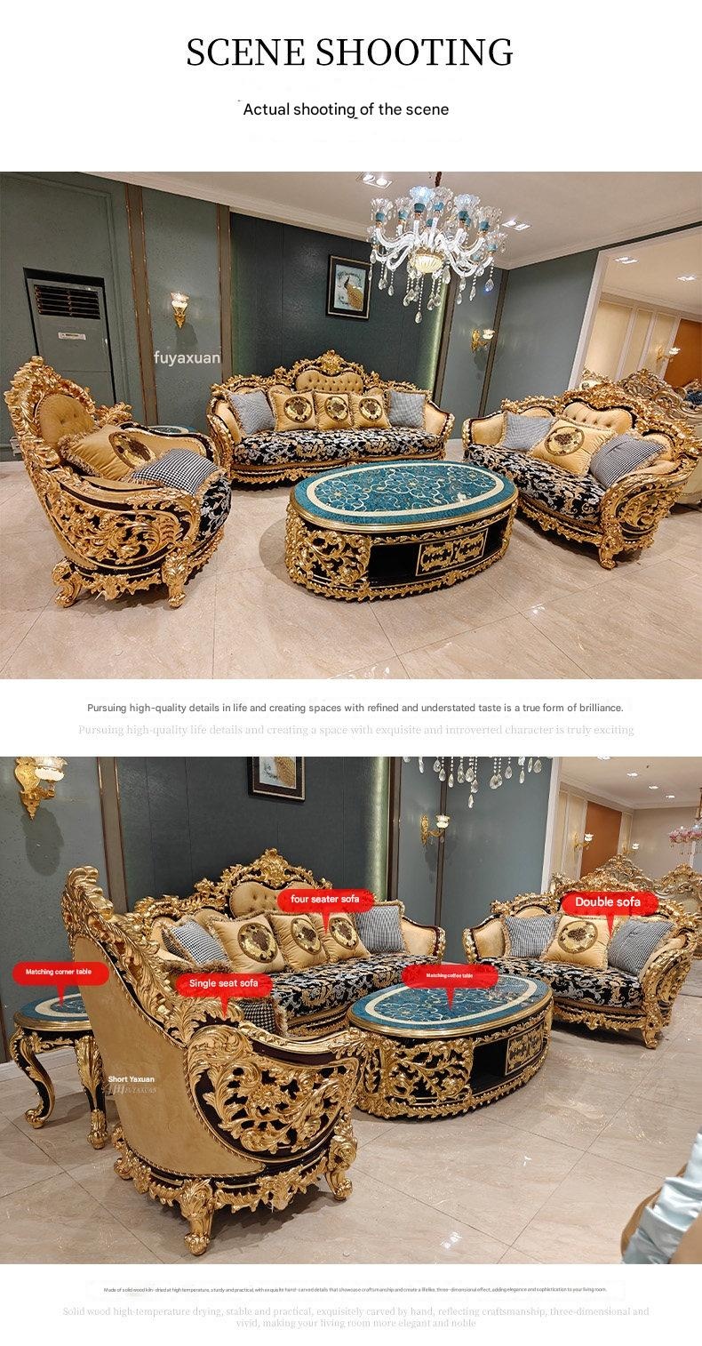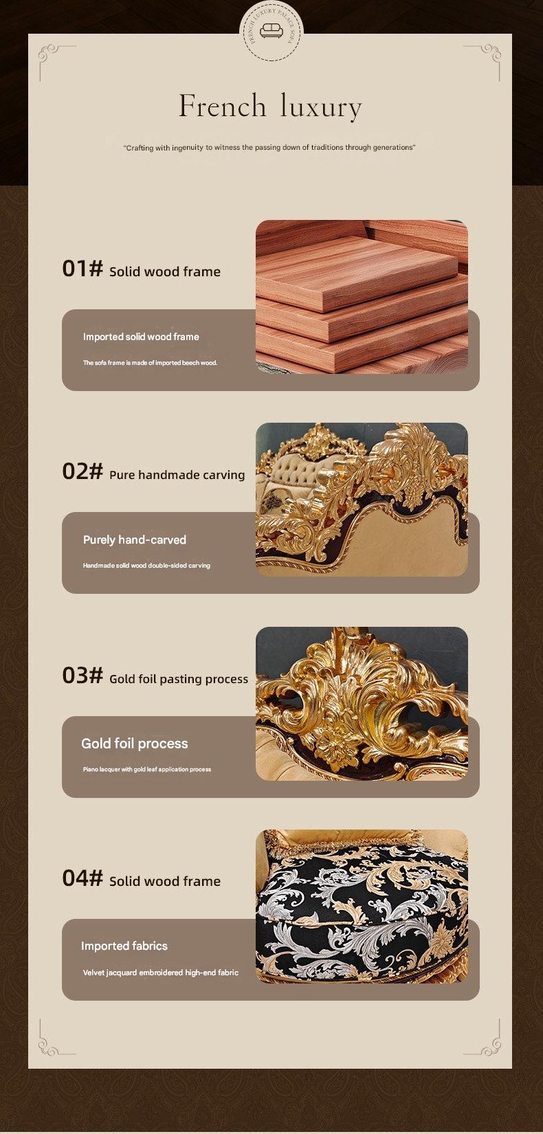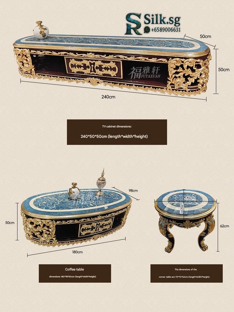 | Style | 2-Seat Sofa with Gold Leaf & Velvet, 3-Seat Sofa with Gold Leaf & Velvet, 4-Seat Sofa with Gold Leaf & Velvet, French Luxury Coffee Table with Gold Leaf & Shell Inlay, French Luxury TV Cabinet with Gold Leaf & Shell Inlay, French Palace Style Sofa Set 1+2+3, French Palace Style Sofa Set 1+2+4, French Round Corner Table with Gold Leaf & Shell Inlay, Single Seat Sofa with Gold Leaf & Velvet |