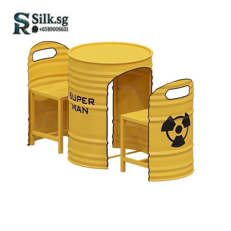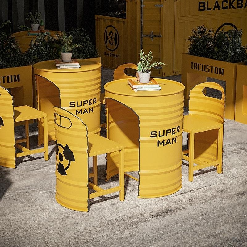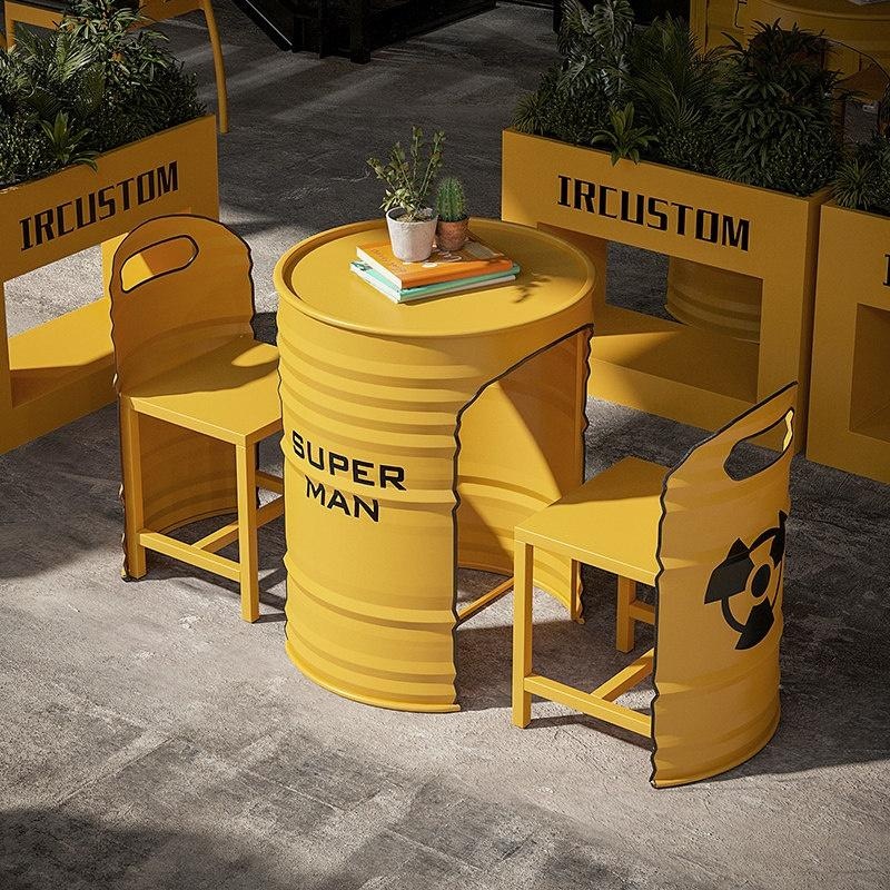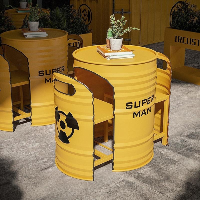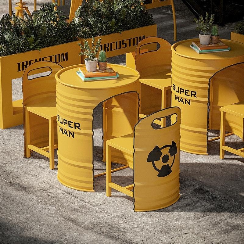 Industrial-style yellow barrel furniture set featuring a table and chairs made from repurposed metal. Customizable with SUPER MAN text, radiation symbols, and multiple color options. Durable wrought iron construction with baked enamel finish, suitable for indoor or outdoor use.