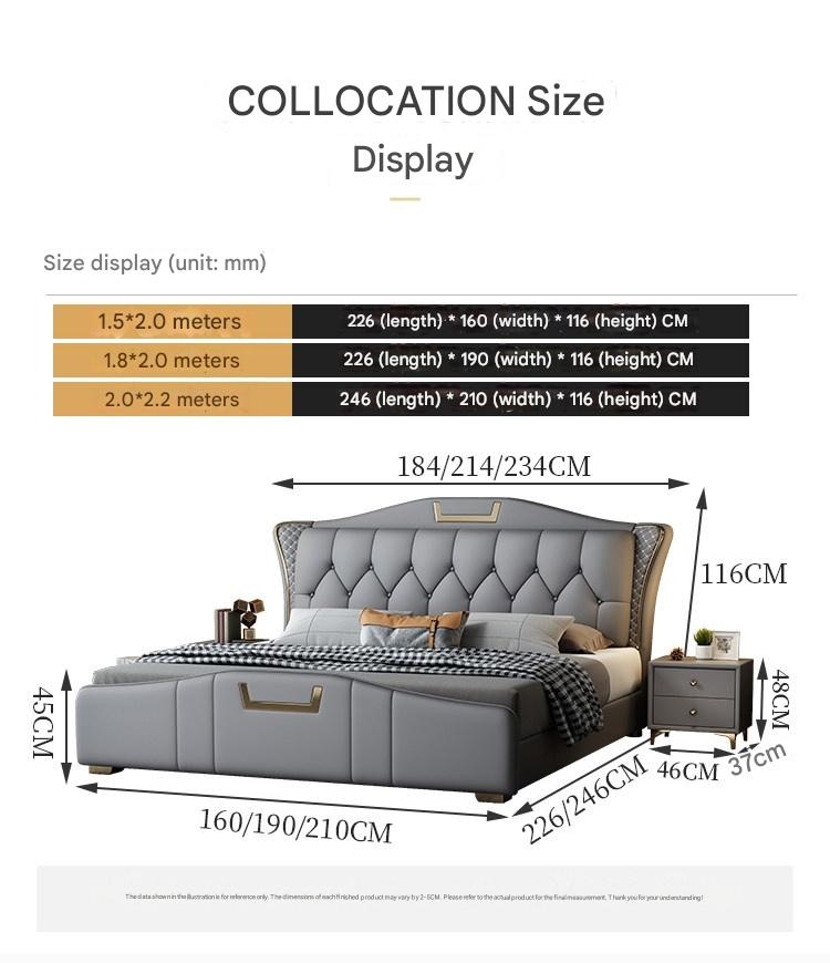 | Color | Custom – Contact Customer Service, Leather Bed + 2 Bedside Tables (Color Optional, Specify When Ordering), Leather Bed + 360° Fully Removable Double-Sided Pocket Spring Mattress (Recommended), Leather Bed + 360° Fully Removable Double-Sided Pocket Spring Mattress + 1 Drawer (Recommended), Leather Bed + 360° Fully Removable Double-Sided Pocket Spring Mattress + 2 Drawers (Recommended), Leather Bed + 5D Latex Mattress (Medium Firm, Skin-Friendly, Breathable), Leather Bed + 5D Latex Mattress + 1 Drawer (Medium Firm, Skin-Friendly, Breathable), Leather Bed + 5D Latex Mattress + 2 Drawers (Medium Firm, Skin-Friendly, Breathable), Leather Bed + 9-Star Velvet Quiet Pocket Spring Mattress (No Interference), Leather Bed + 9-Star Velvet Quiet Pocket Spring Mattress + 1 Drawer (No Interference), Leather Bed + 9-Star Velvet Quiet Pocket Spring Mattress + 2 Drawers (No Interference), Leather Bed + 9-Zone Cloud Feel Dual-Sided Mattress (Reversible), Leather Bed + 9-Zone Cloud Feel Dual-Sided Mattress + 1 Drawer (Reversible), Leather Bed + 9-Zone Cloud Feel Dual-Sided Mattress + 2 Drawers (Reversible), Leather Bed + Bedside Table (Color Optional, Specify When Ordering), Leather Bed + Orthopedic Coconut Palm Mattress (Firm, Lumbar Support Recommended), Leather Bed + Orthopedic Coconut Palm Mattress + 1 Drawer (Firm, Lumbar Support Recommended), Leather Bed + Orthopedic Coconut Palm Mattress + 2 Drawers (Firm, Lumbar Support Recommended), Leather Bed + Silk Pocket Spring Mattress (Skin-Friendly, Breathable, Sleep Recommended), Leather Bed + Silk Pocket Spring Mattress + 1 Drawer (Skin-Friendly, Breathable, Sleep Recommended), Leather Bed + Silk Pocket Spring Mattress + 2 Drawers (Skin-Friendly, Breathable, Sleep Recommended), Leather Bed with Standard Frame & Solid Wood Bedboard |
