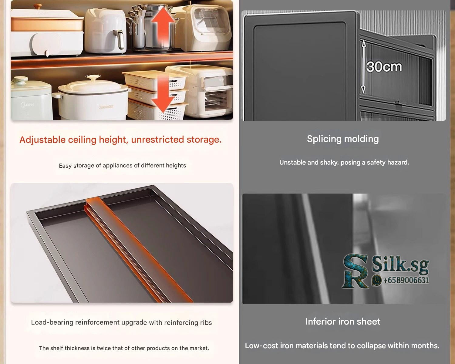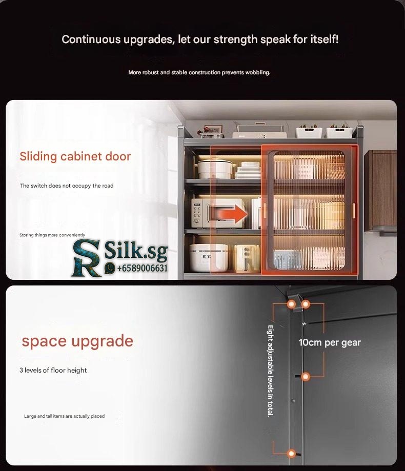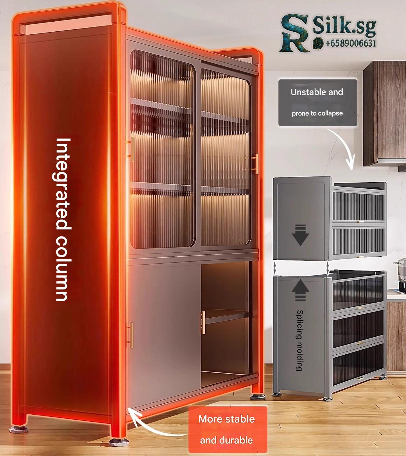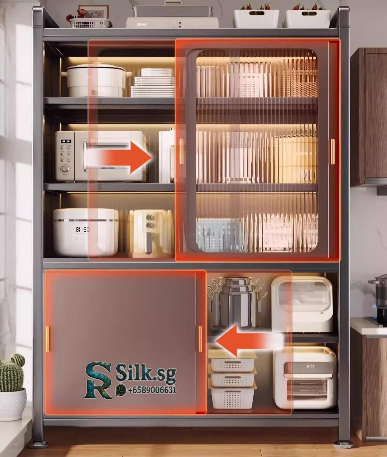 Organize your kitchen effortlessly with this multi-functional storage cabinet featuring sliding doors and multiple layers. Perfect for keeping pots, dishes, and essentials dustproof and tidy. Its sleek design and adjustable height make it a stylish, reliable choice for a clutter-free home.
