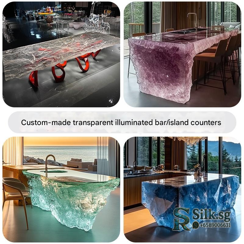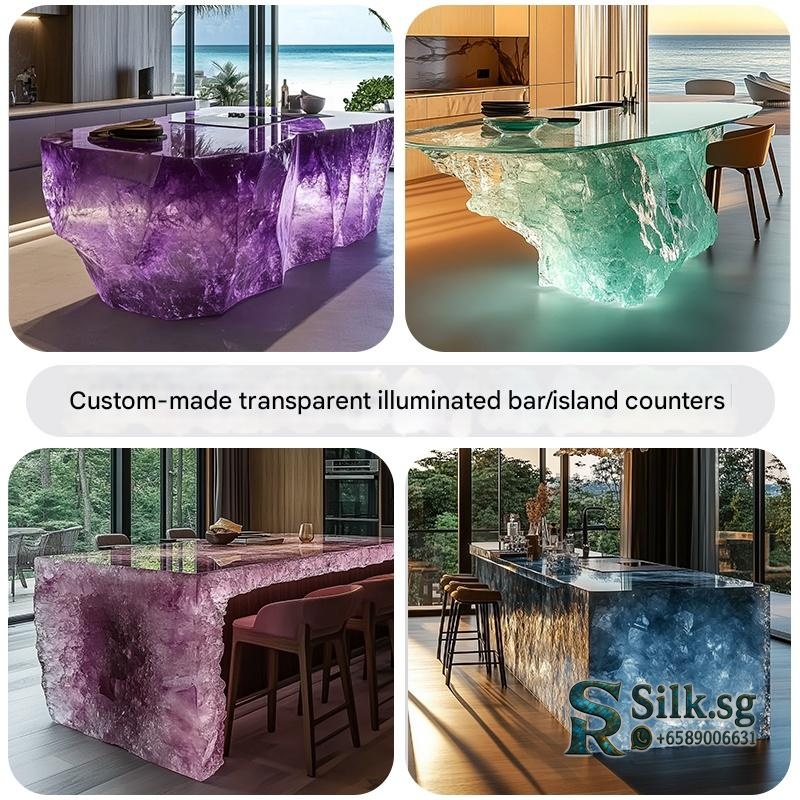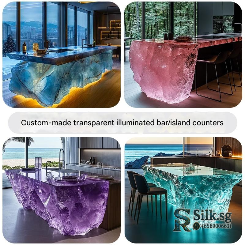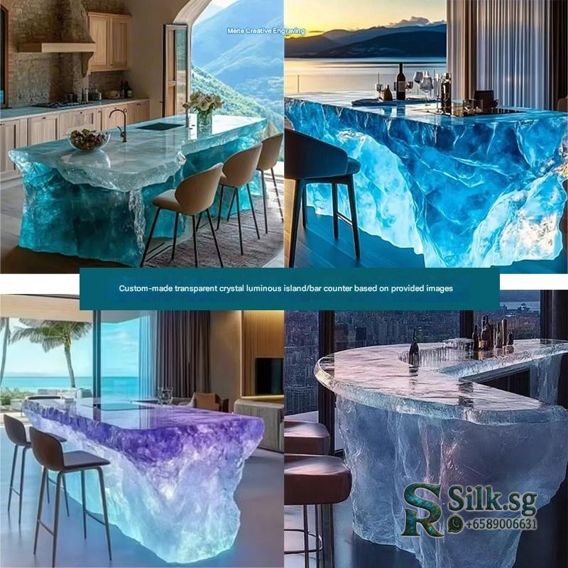 Transform your home bar with this stunning custom resin bar counter, featuring a glowing crystal-like design and integrated lighting. Perfect for entertaining guests, its durable surface and ample storage create a captivating centerpiece. Elevate your space with a truly unique piece of modern art.