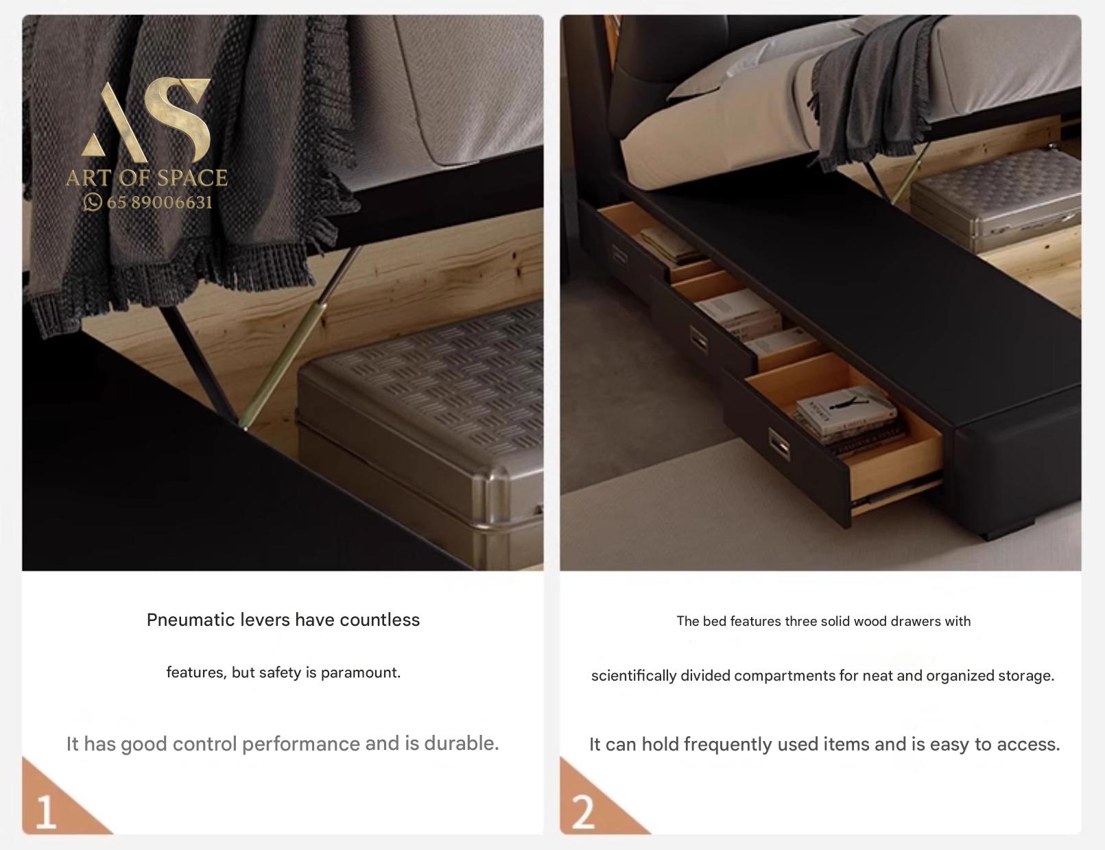Enhance your bedroom with this elegant genuine leather storage bed, offering practical space-saving features and a modern minimalist design. Perfect for small apartments or master bedrooms, its durable build and plush comfort create a cozy, sophisticated retreat you’ll love coming home to.