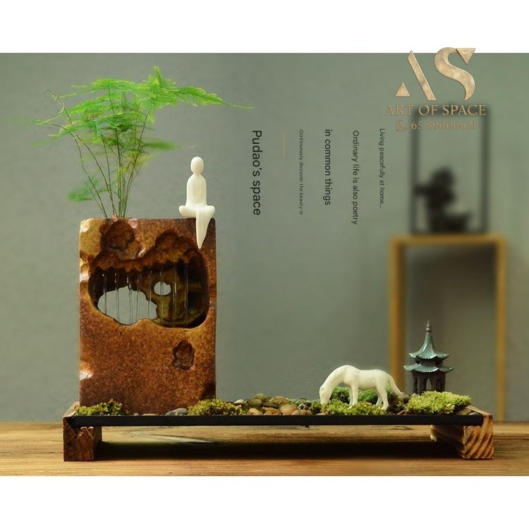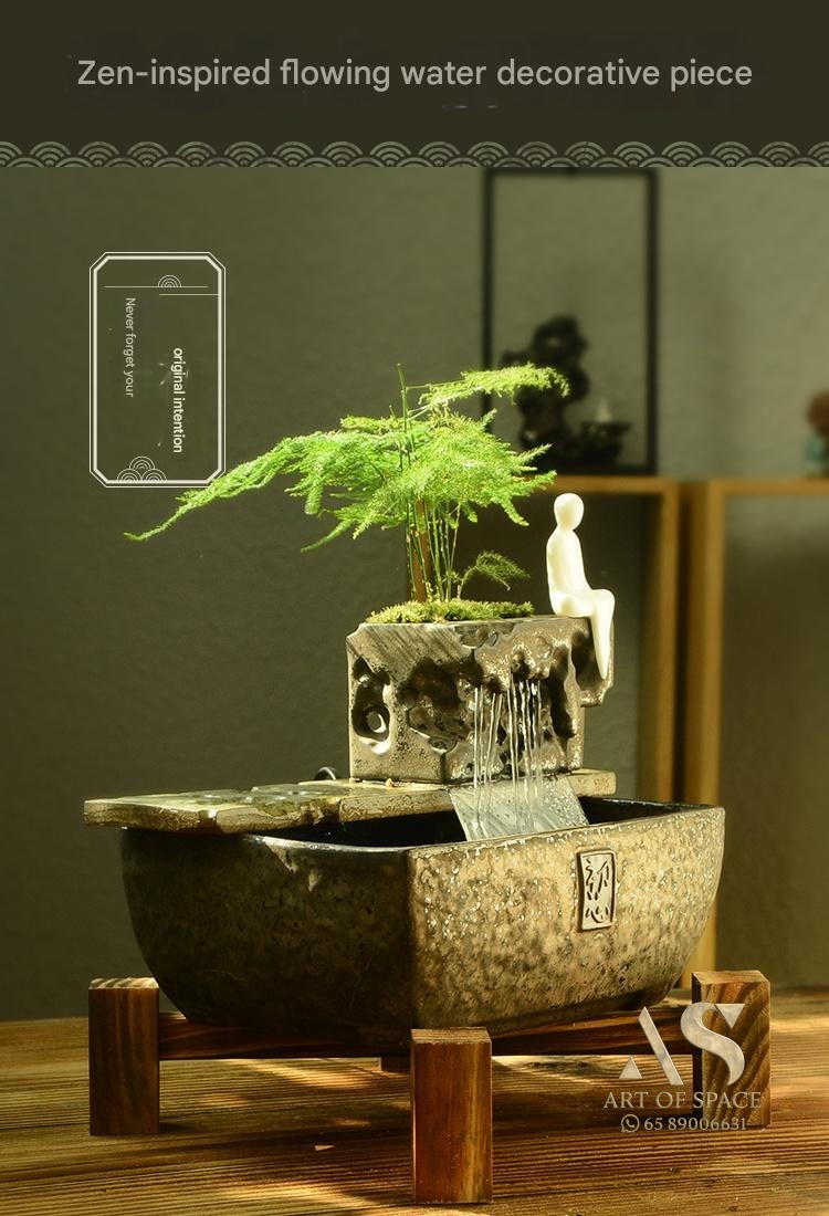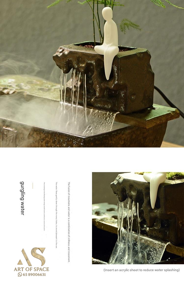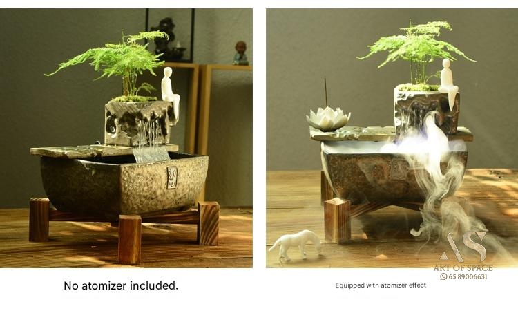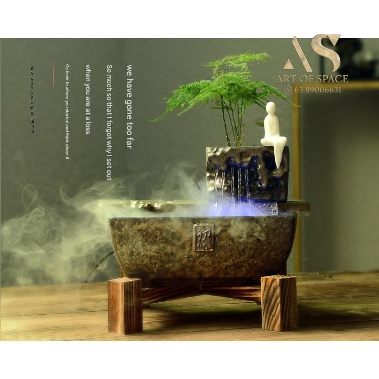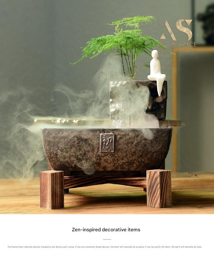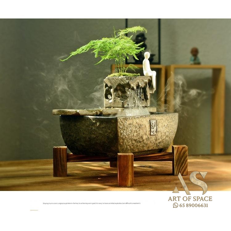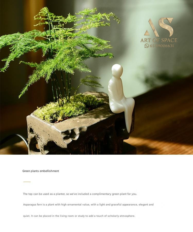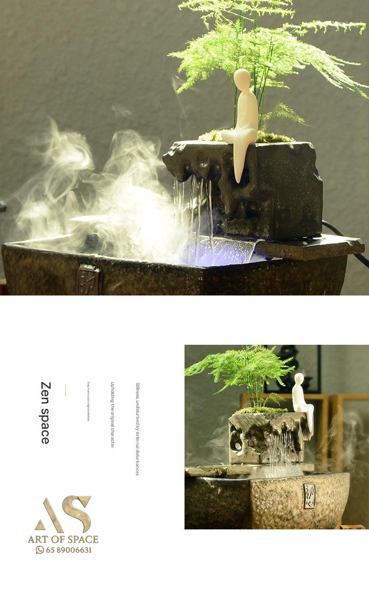Experience the calming presence of a flowing water ornament that humidifies your air and creates a serene Zen atmosphere. Perfect for your desk or tea room, this handmade ceramic rockery features a gentle spray mist. Bring peaceful energy into your living space with this unique miniature landscape.