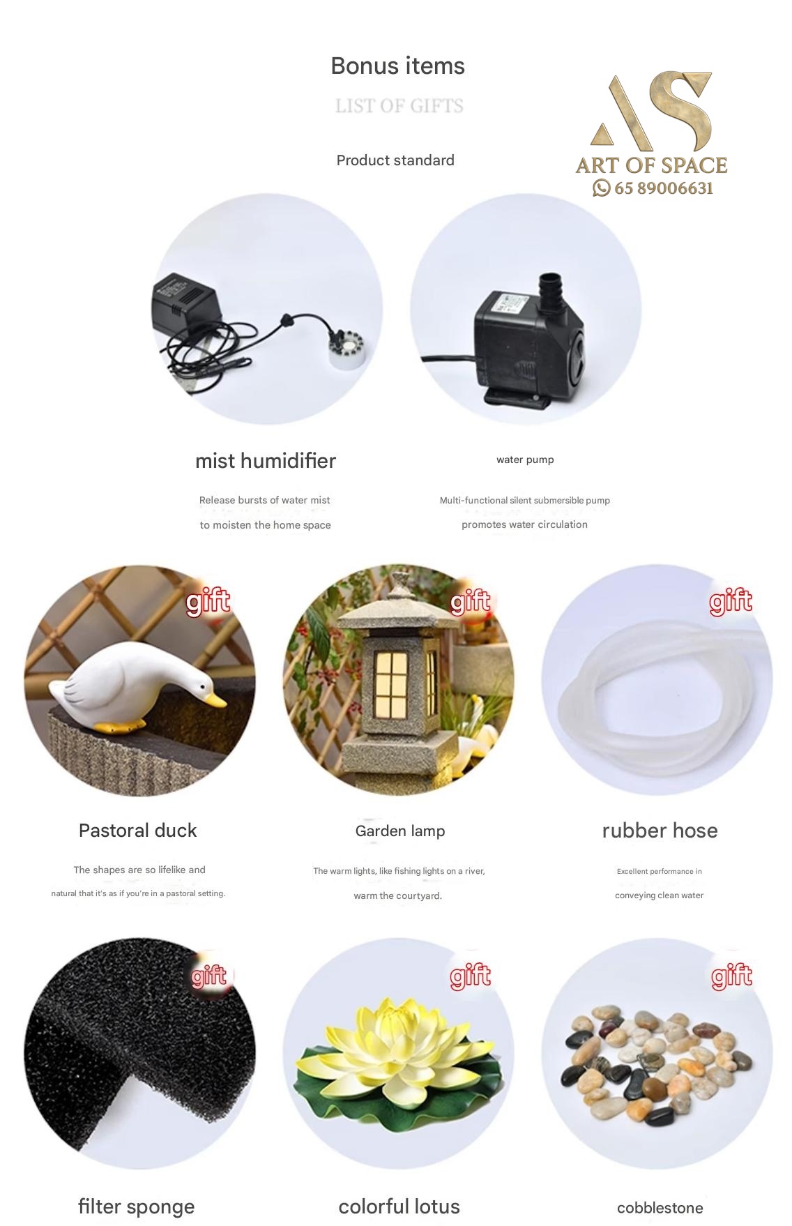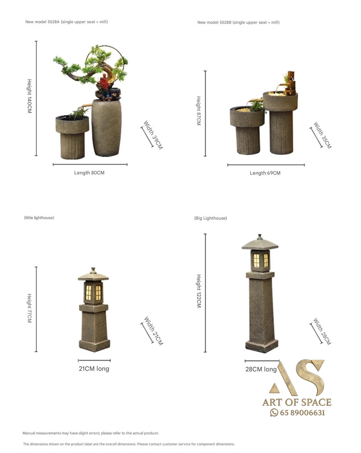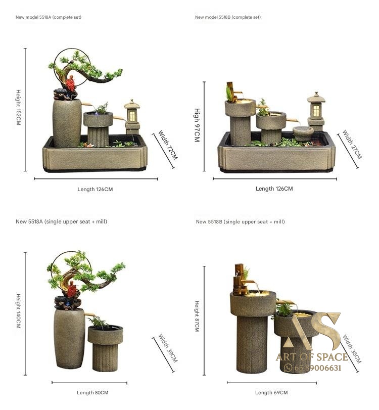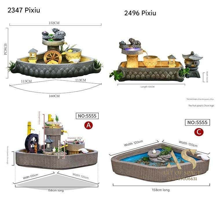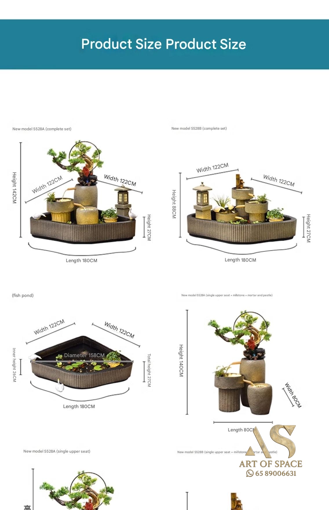 | Model | 0718-1 Taihu Stone Pond, 0718-2 Taihu Stone Pond, 2201 Large Full Set, 2347 Triangle Pixiu, 2496 Right Angle Pixiu, 2558 Taihu Stone Rockery Pond, 5518 Single Pond, 5518A Full Set, 5518A Upper Base with Mill, 5518B Full Set, 5518B Upper Base with Mill, 5528 Single Pond, 5528A Full Set, 5528A Upper Base with Mill & Mortar, 5528B Full Set, 5528B Upper Base with Mill & Mortar, 5555 Full Set, 5555-B Style, 5555-C Single Pond, 6618 Taihu Stone Pond, 6628 Taihu Stone Pond |
