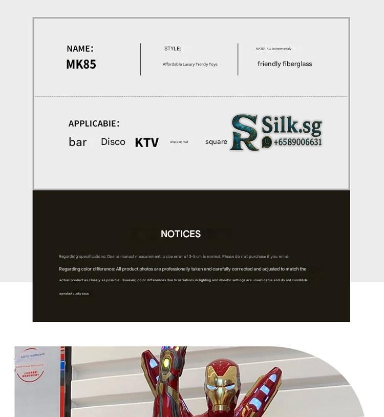 | Model | 1.5m Hulk, 1.88m Hulk, 1.9m MK45, 1.9m MK50, 2.05m MK50 Gen 2, 2.05m Spider-Man, 2.15m Hulk, 2.15m MK85 with Base, 2.1m MK45 Base 110x80x20cm, 2.1m MK45 Round Base, 2.1m MK50 Round Base, 2.1m MK50 Square Base, 2.1m MK7 Glossy, 2.1m MK7 Matte, 2.1m MK7 Upgraded Blue Light, 2.2m Attack Version, Iron Man, MK85 |