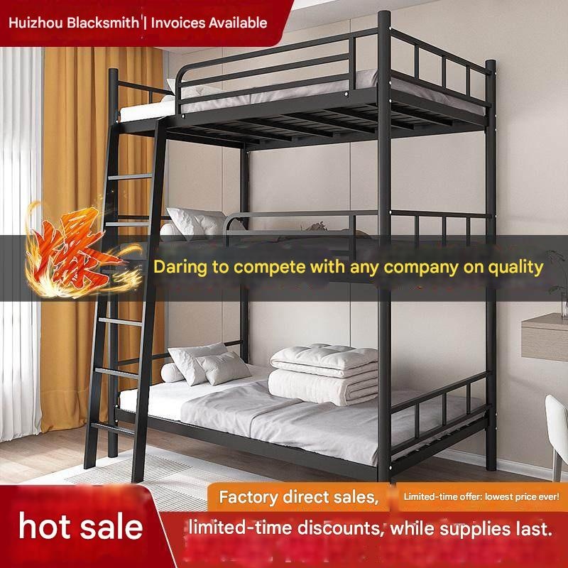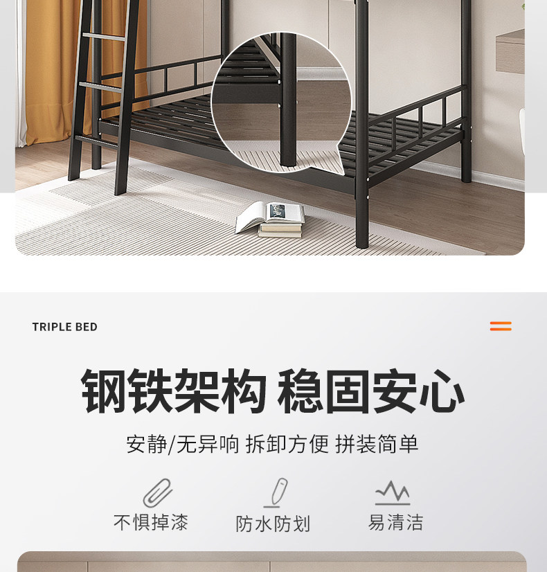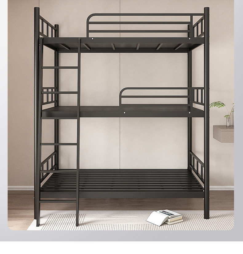 Maximize space with this sturdy three-tier bunk bed, featuring a durable iron frame and a simple modern design. Perfect for student dorms or employee housing, it offers customizable size options to fit your exact needs. Create an efficient and organized sleeping solution today.