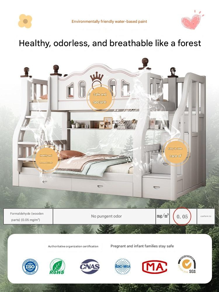 This versatile solid wood bunk bed offers a safe, space-saving solution with a 20-year warranty and eco-friendly finish. Perfect for siblings or a mother-child room, its sturdy design and customizable options create a cozy, lasting retreat. Give your family the comfort and security they deserve.