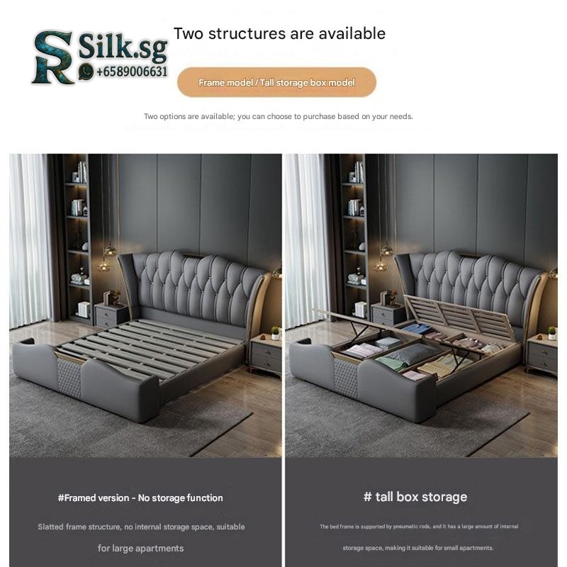Genuine Leather Storage Bed – Modern Minimalist Double Bed with Soft B