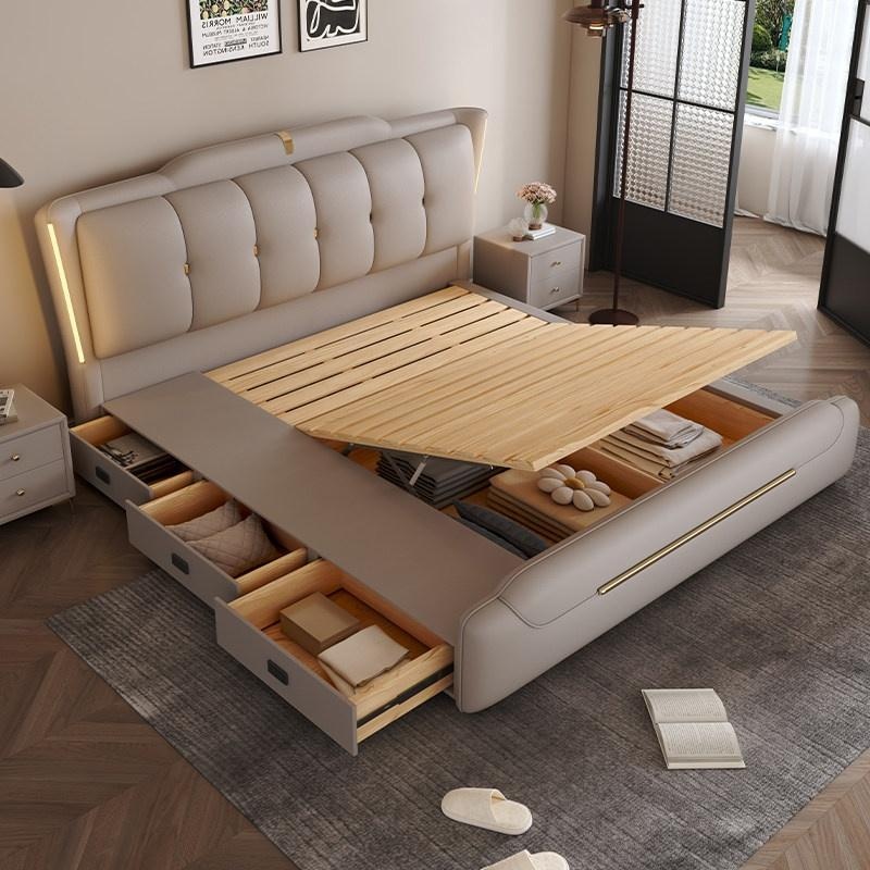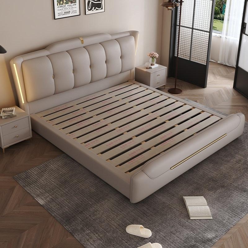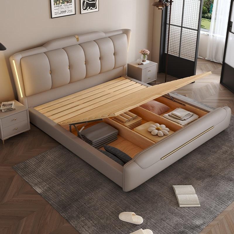 Genuine Leather Storage Bed – Modern Minimalist Double Bed with Soft B