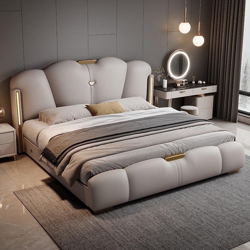 Genuine Leather Storage Bed – Modern Minimalist Double Bed with Soft B