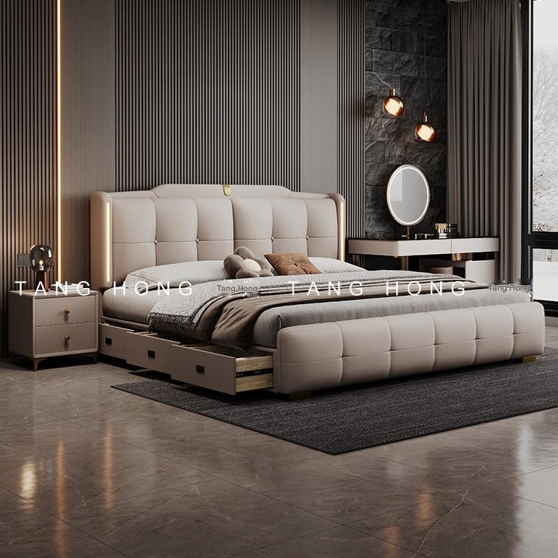 Genuine Leather Storage Bed – Modern Minimalist Double Bed with Soft B
