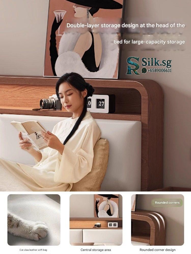 Nordic Genuine Leather Bed – Modern Minimalist Master Bedroom Frame wi