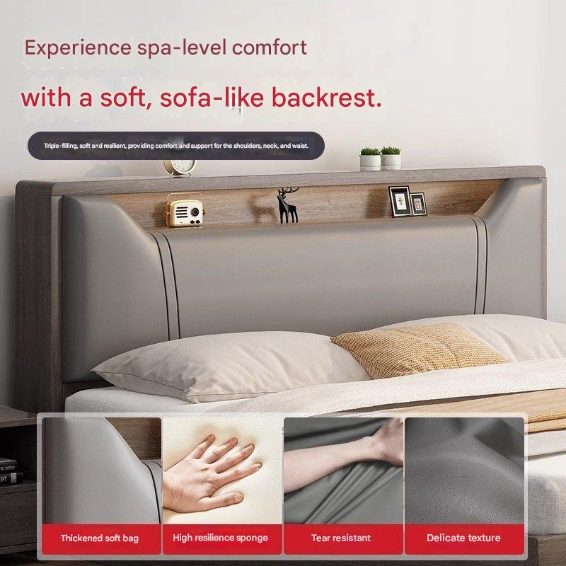 Maximize your space with this solid wood bed frame featuring built-in storage and a soft backrest for ultimate comfort. Perfect for master bedrooms or rental rooms, its minimalist design brings timeless style. Transform your room into a serene and organized retreat today.