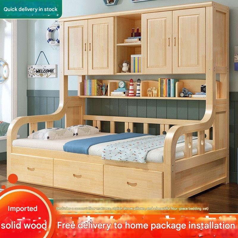 Shuangzhen – Nordic Solid Wood Storage Bed with Bookshelf & Wardrobe