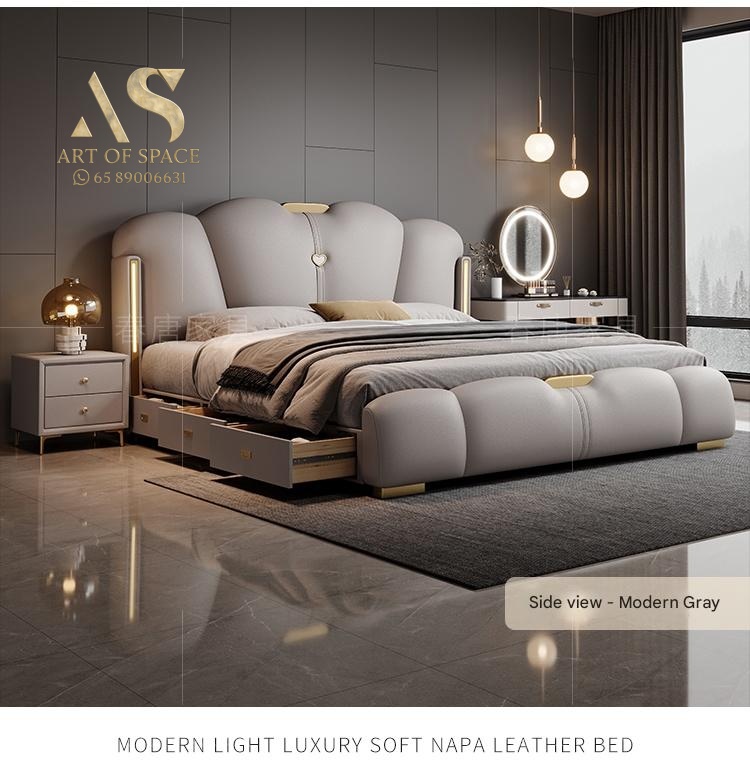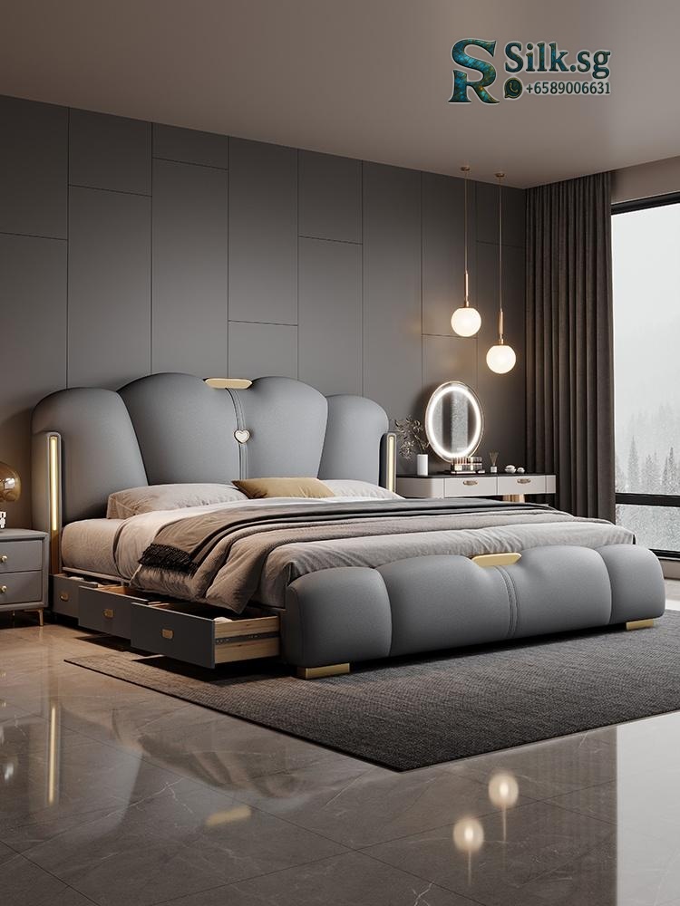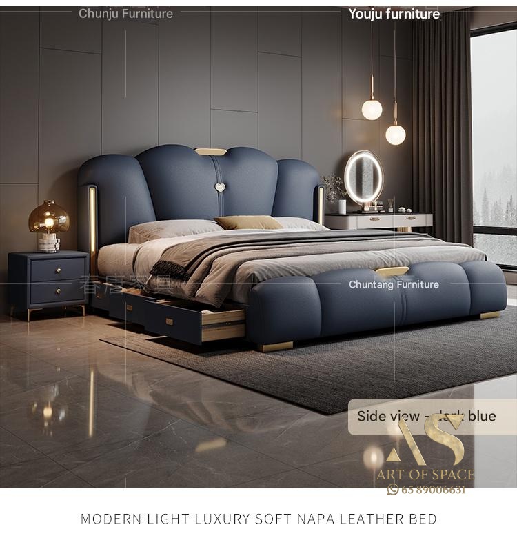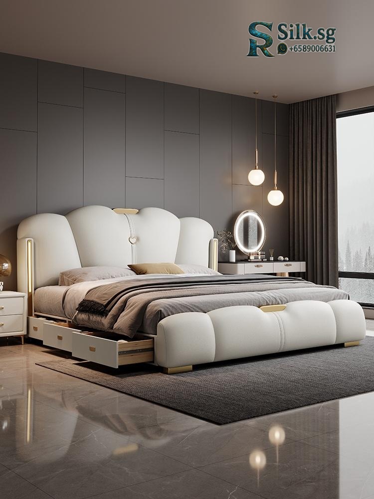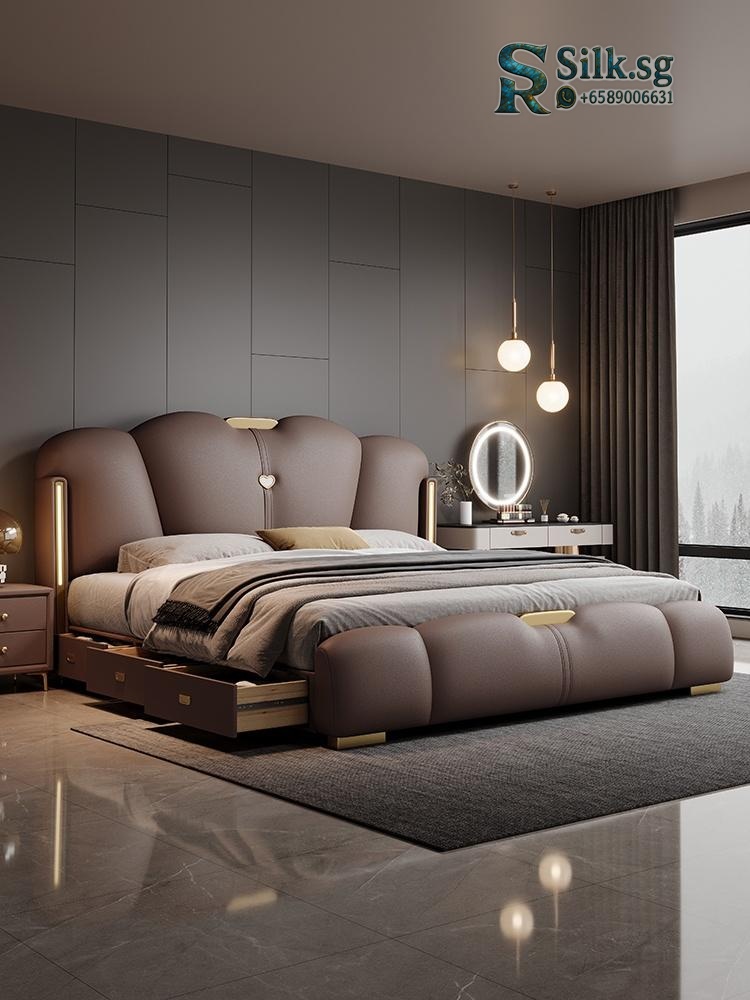 Experience modern elegance and exceptional comfort with this genuine leather minimalist master bedroom bed, perfect for relaxation and stylish living. Its durable design and customizable options make it ideal for creating a cozy, luxurious retreat at home.