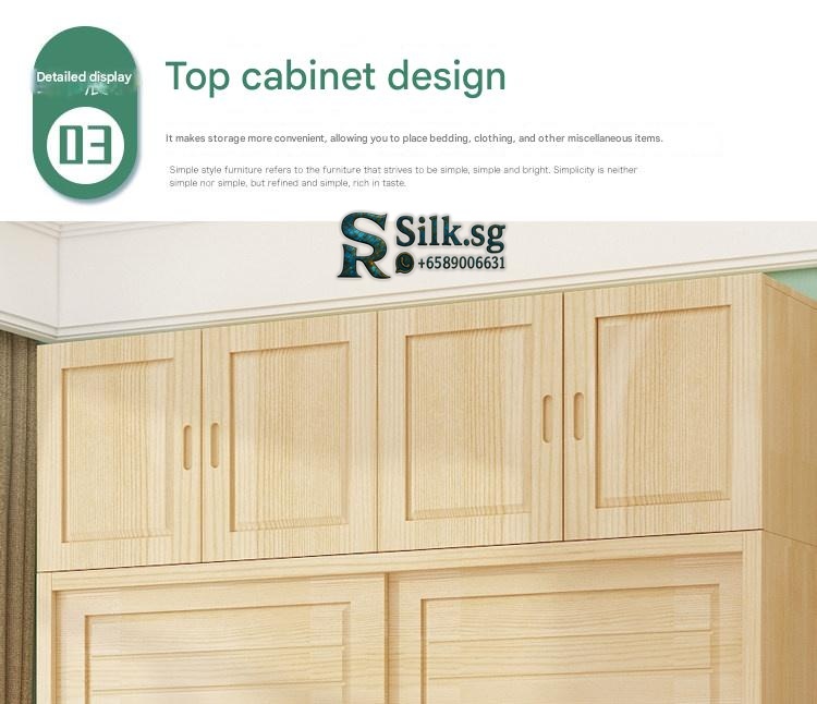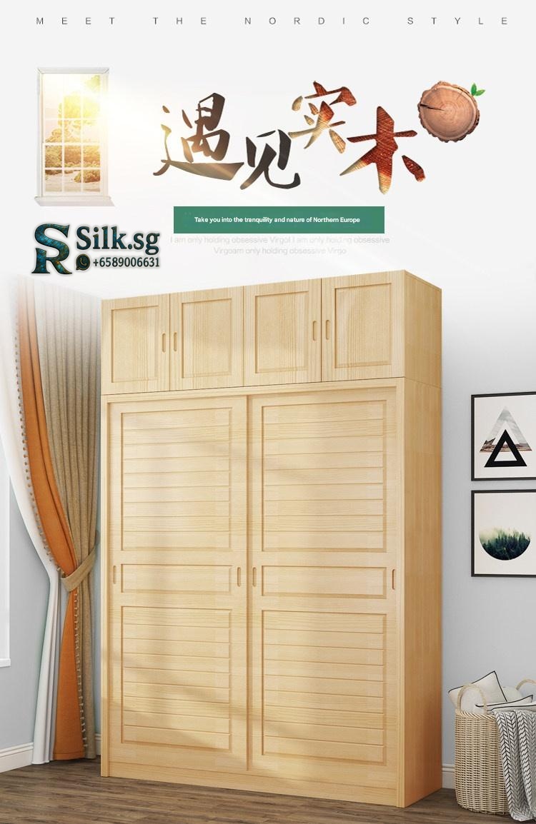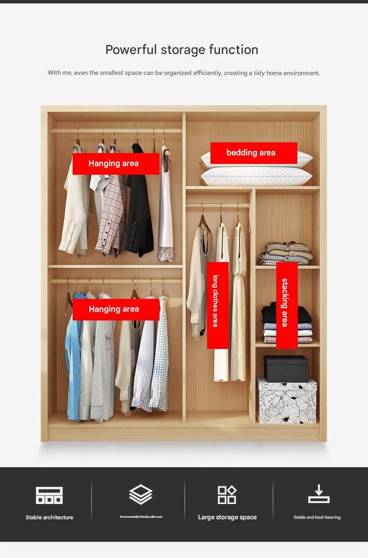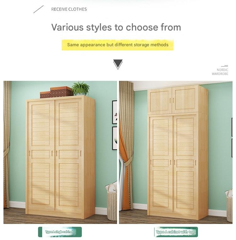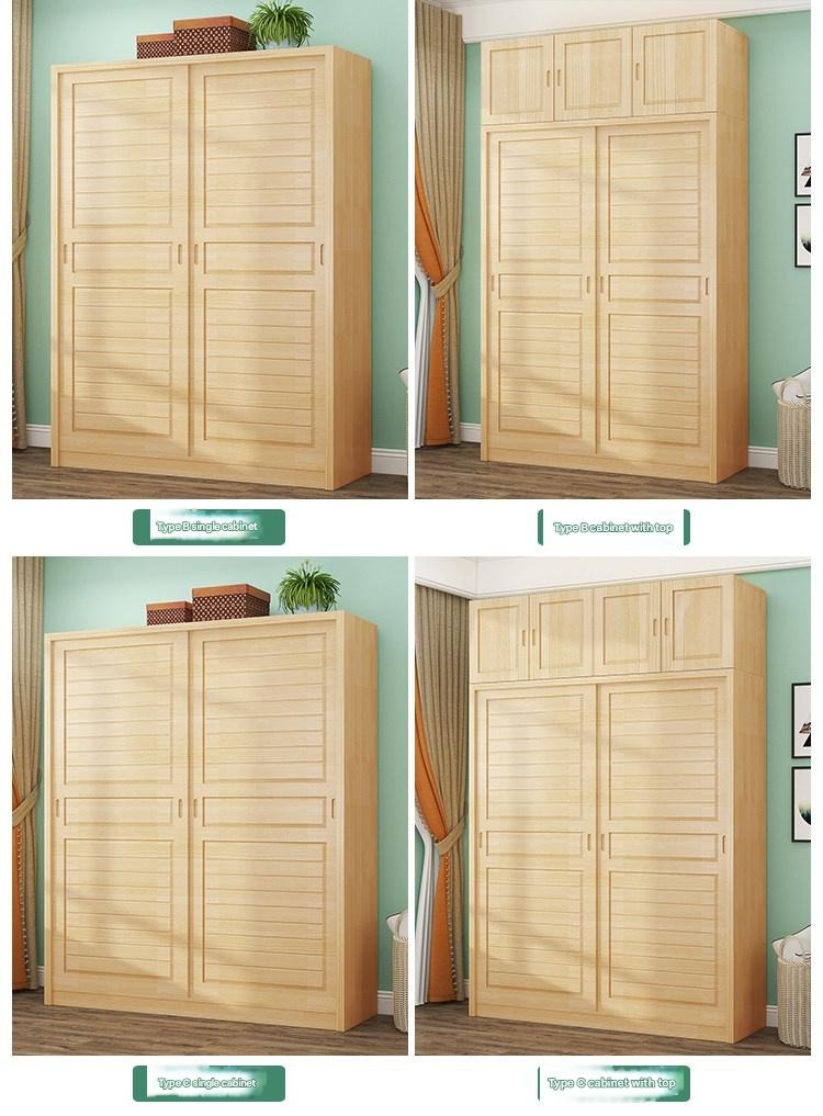 Nordic Style Solid Wood Wardrobe with Sliding Doors – Multi-Compartment Storage Cabinet for Bedroom This wardrobe features a minimalist Nordic design with space-saving push-pull sliding doors. Constructed from eco-friendly New Zealand pine solid wood, it offers multiple storage compartments including hanging rods for clothes, shelves for folded items, and a dedicated bedding section. Available in light wood finish with optional white paint, it includes a sturdy wooden hanging rod and comes in configurations with or without a top cabinet for versatile bedroom organization. Fixed options: Doors: 2-door