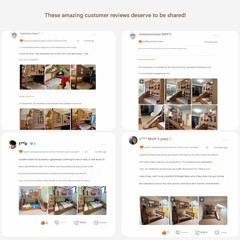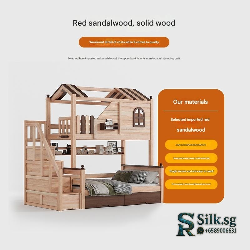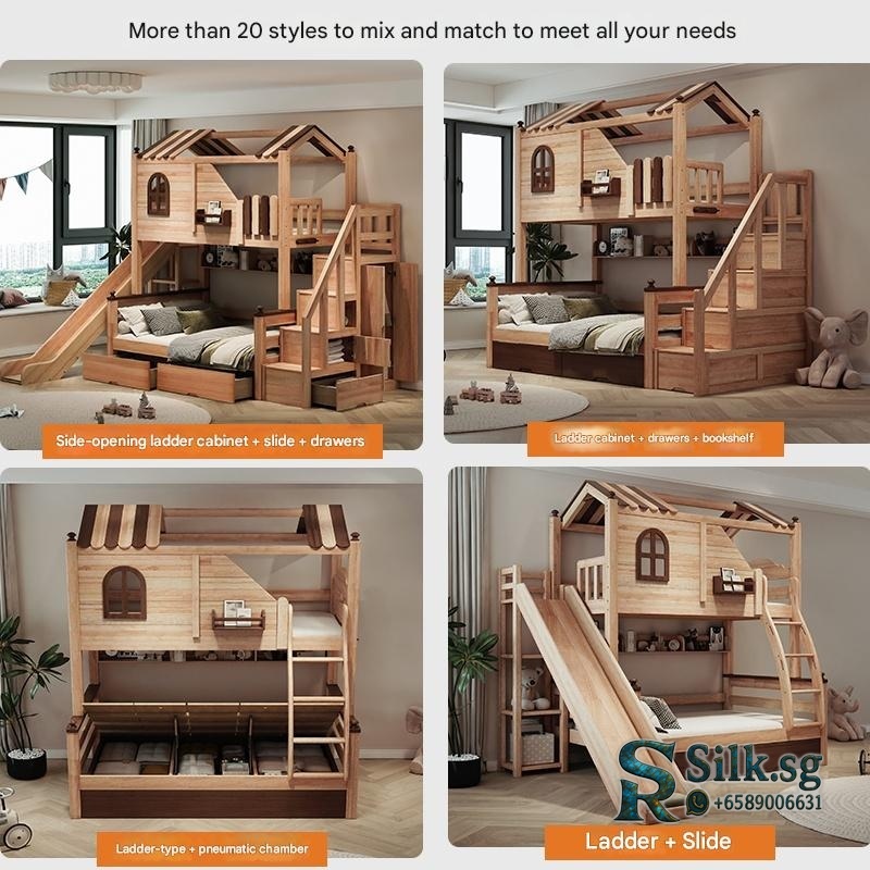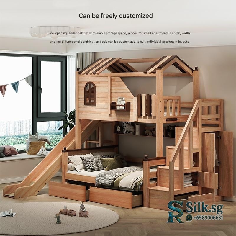This Solid Wood Double-Decker Childrens Bed is a customizable treehouse-style bunk bed. It is constructed from solid wood, specifically red sandalwood and paulownia wood, finished with wood wax oil or water-based paint. The overall height is 2500mm, with bed width options of 1200mm, 1350mm, 1500mm, and 1800mm, all with a 2000mm length. It features a 78cm high safety guardrail and has a load capacity of 500kg. Key customizable elements include the ladder type (slanted, straight, step, or integrated ladder cabinet) and the addition of functional components like a slide, storage drawers, pneumatic lift boxes, or bookshelves. The design includes storage space and is available in multiple configurations, such as front ladder, side-opening ladder cabinet, or slide combinations. Installation tools and a video are provided. Fixed options: Set: More options