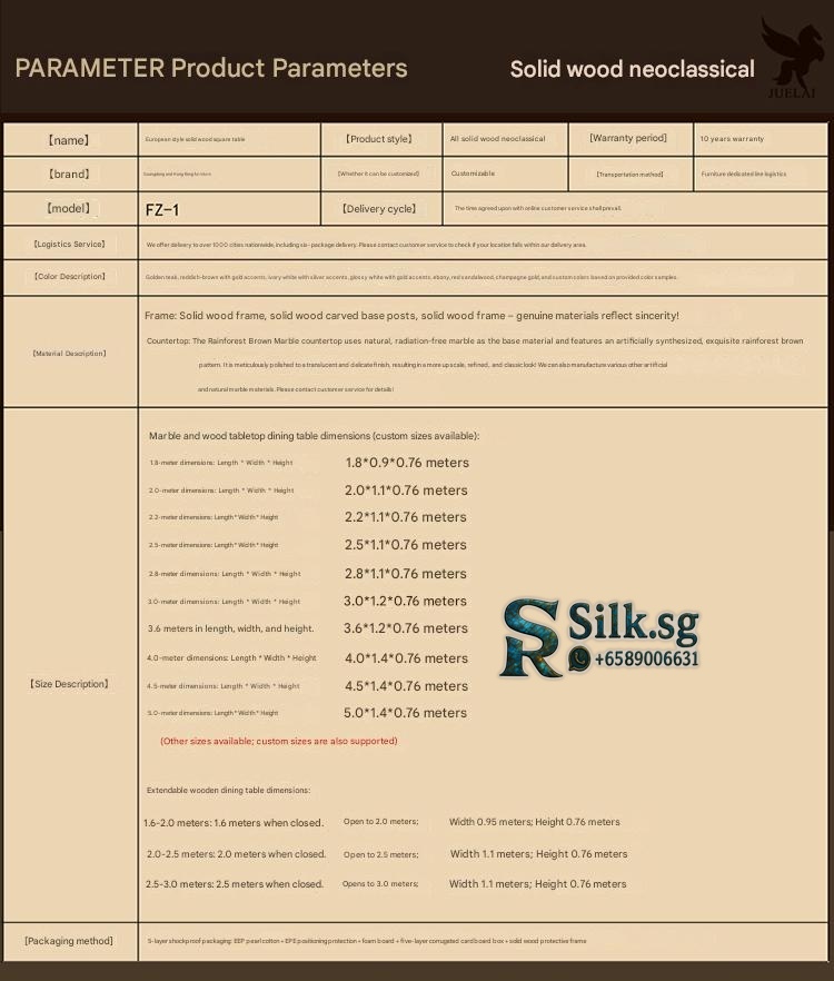 | Model | 1.8m Solid Wood Frame with Artificial Stone, Seats 8, 1.8m Solid Wood Frame with Natural Stone, Seats 8, 1.8m Solid Wood Frame with Wood Top, Seats 8, 2.0-2.5m Extendable Wood Top Table, Seats 8-10, 2.0m Solid Wood Frame with Artificial Stone, Seats 8, 2.0m Solid Wood Frame with Natural Stone, Seats 8, 2.0m Solid Wood Frame with Wood Top, Seats 8, 2.2m Solid Wood Frame with Artificial Stone, Seats 8-10, 2.2m Solid Wood Frame with Natural Stone, Seats 8-10, 2.2m Solid Wood Frame with Wood Top, Seats 8-10, 2.5-3.0m Extendable Wood Top Table, Seats 10-12, 2.5m Solid Wood Frame with Artificial Stone, Seats 10, 2.5m Solid Wood Frame with Natural Stone, Seats 10, 2.5m Solid Wood Frame with Wood Top, Seats 10, 2.8m Solid Wood Frame with Artificial Stone, Seats 10-12, 2.8m Solid Wood Frame with Natural Stone, Seats 10-12, 2.8m Solid Wood Frame with Wood Top, Seats 10-12, 3.0m Solid Wood Frame with Artificial Stone, Seats 12, 3.0m Solid Wood Frame with Natural Stone, Seats 12, 3.0m Solid Wood Frame with Wood Top, Seats 12, 3.6m Solid Wood Frame with Artificial Stone, Seats 14, 3.6m Solid Wood Frame with Natural Stone, Seats 14, 3.6m Solid Wood Frame with Wood Top, Seats 14, 4.5m+ Custom Size, Consult Designer for Price |