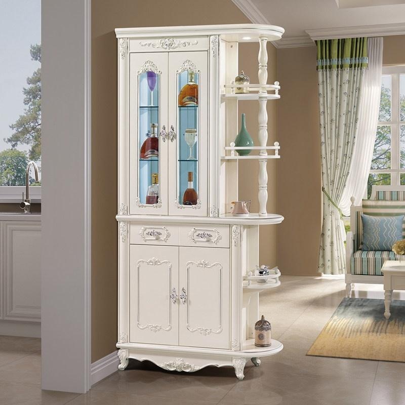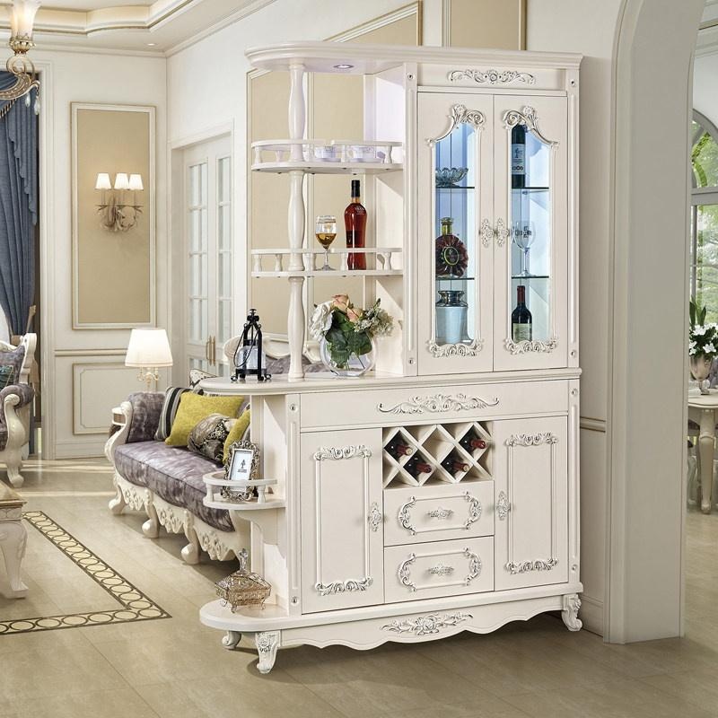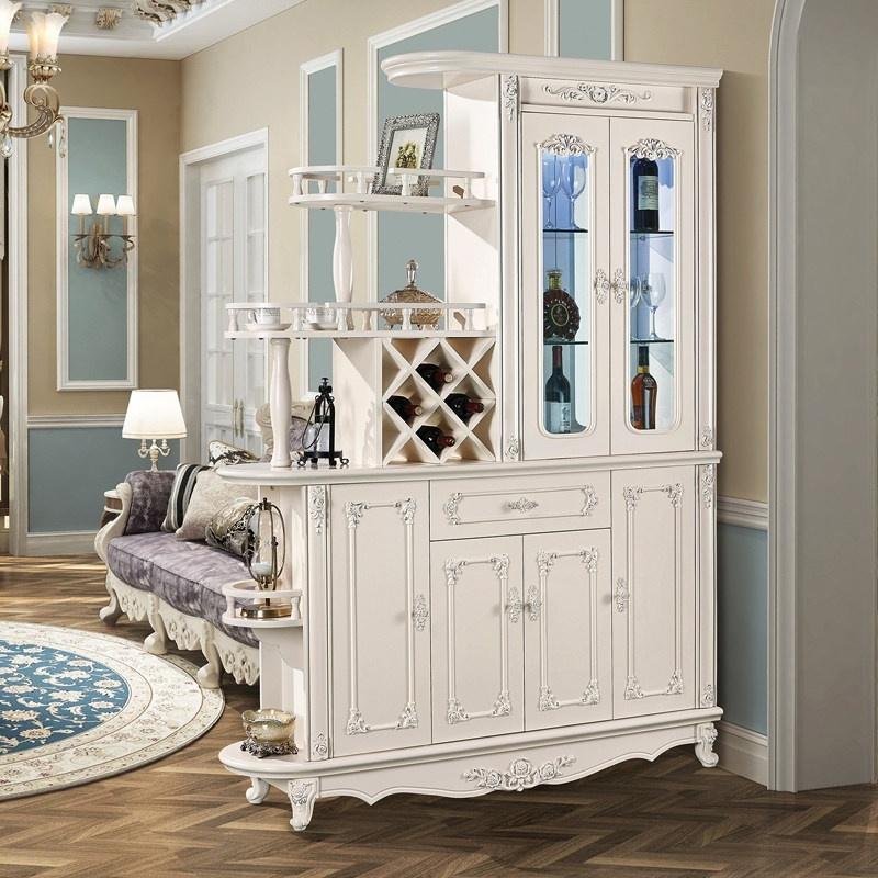 The Bairuite B612# European Style Cabinet is a multi-functional piece for entryways or living rooms. It is constructed from E1-grade MDF/fiberboard with a white baking paint finish and ornate carvings. Dimensions are approximately 2100mm (H) x 1360-1500mm (W) x 385-405mm (D), with a gross weight of 120kg. The frame structure includes a glass-enclosed upper section with interior lighting, three-tier open shelving with a wine glass holder, and a lower compartment with diamond-shaped racks for multiple wine bottles. It features two cabinet doors and one drawer with silver handles, all on three-stage damping buffer rails. The package includes all components for assembly, which is required. Available in several ivory white variants (e.g., 620#, 695#), it serves as a partition, display, and storage cabinet. Fixed options: Installation: Pre-assembled | Structure: Frame Structure