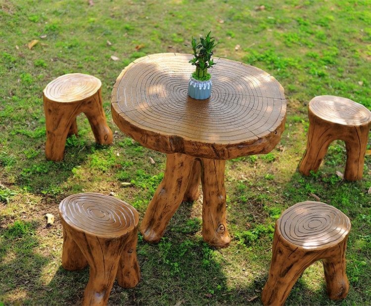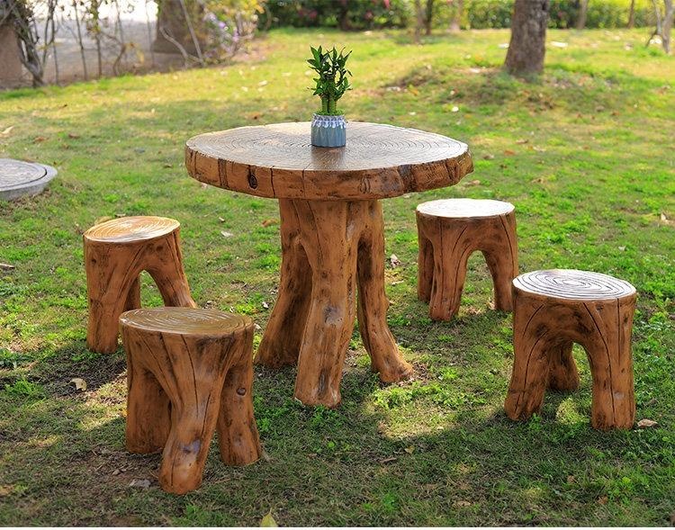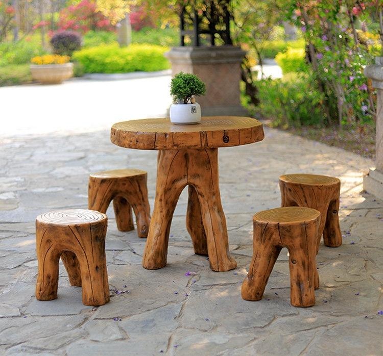 Rustic outdoor wooden furniture set featuring a natural tree trunk design. Includes a round table with visible growth rings and four matching stools, perfect for garden, patio, or poolside use. Handcrafted from solid wood with a durable, weather-resistant finish.