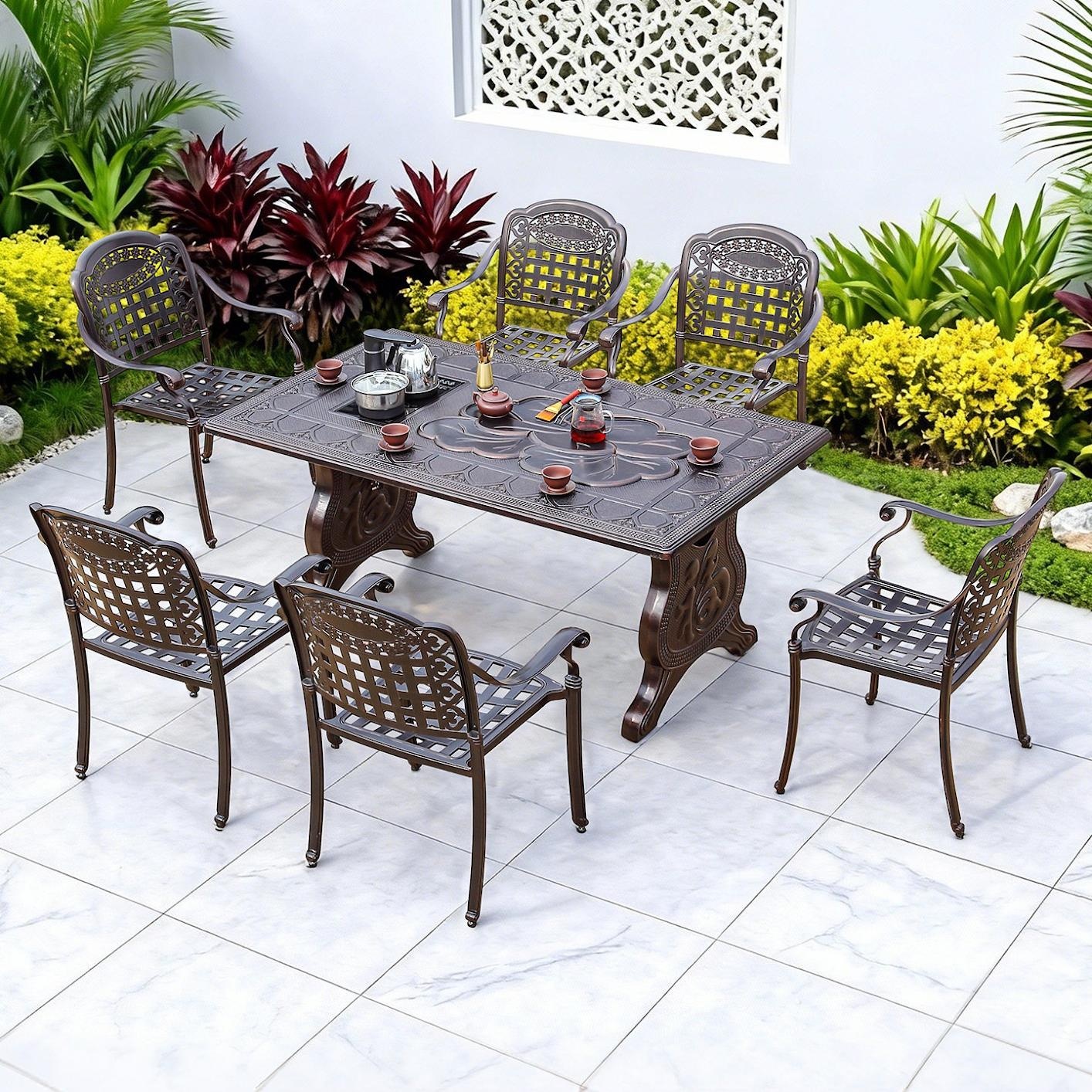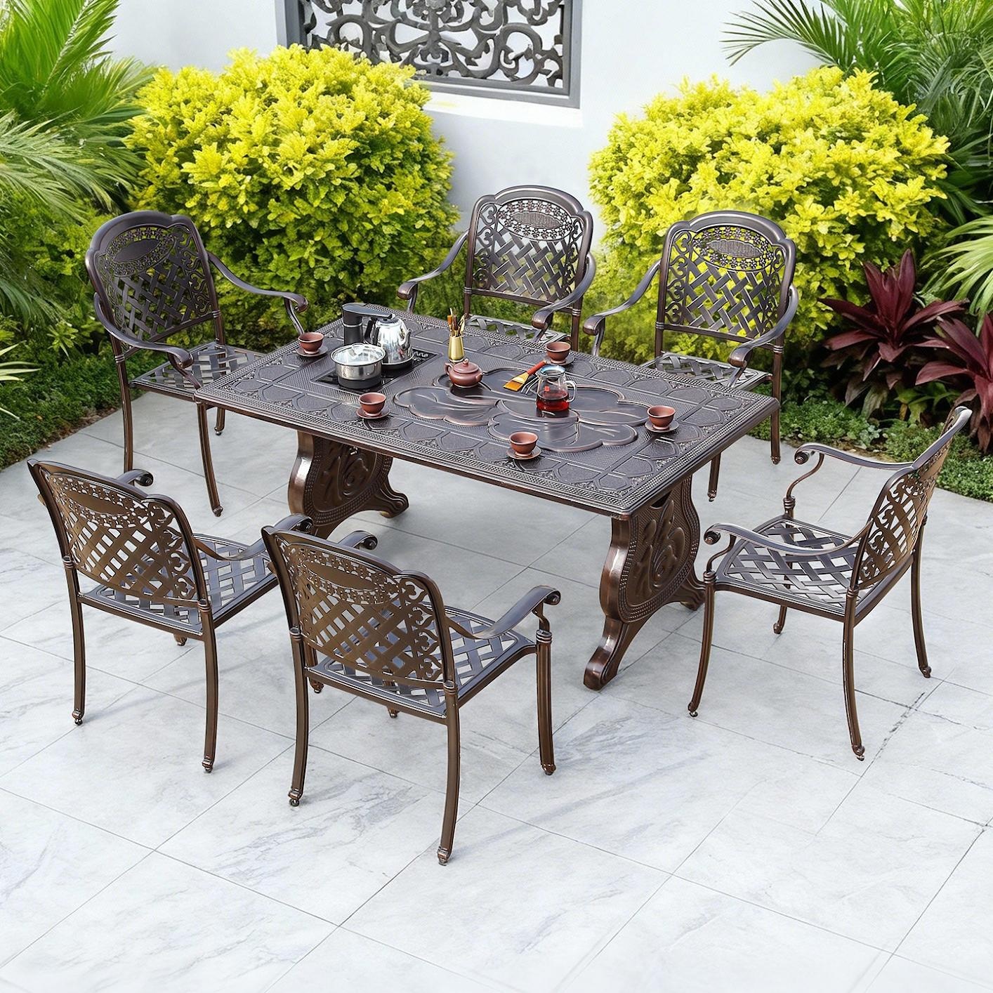 Enjoy elegant outdoor leisure with this durable cast aluminum tea table set. Its waterproof and sunproof design ensures lasting beauty, perfect for courtyard gatherings or villa terraces. Complete with chairs for a full BBQ-ready combination, it invites you to create cherished moments in style.