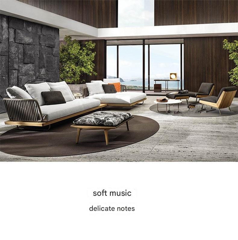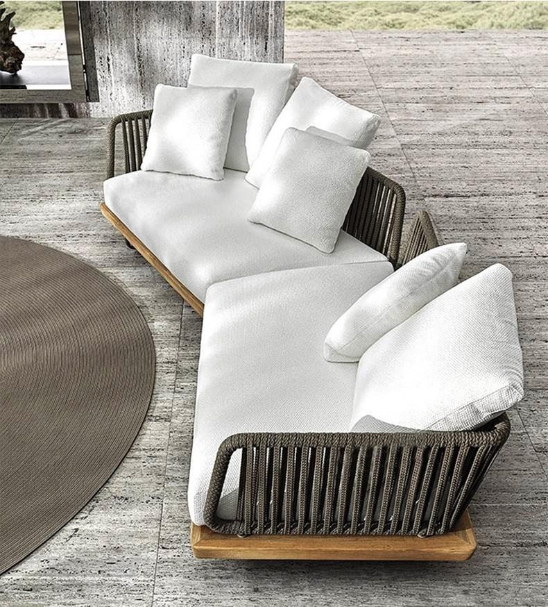 Modern outdoor modular sofa set with woven rattan armrests, wooden frames, and fabric cushions. Features L-shaped configurations, chaise lounges, and matching chairs. Includes stone-top coffee tables and decorative plants for a contemporary patio or poolside lounge. Fixed options: Set: Set
