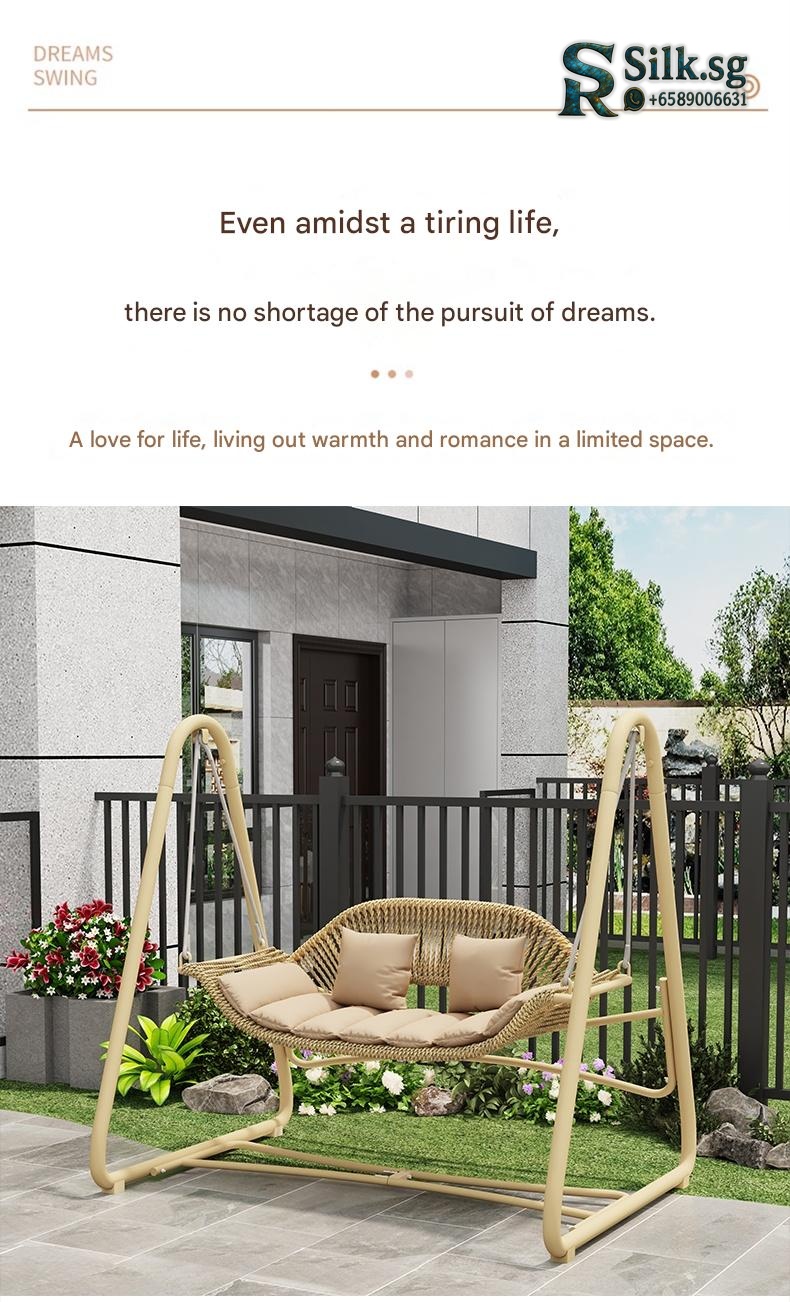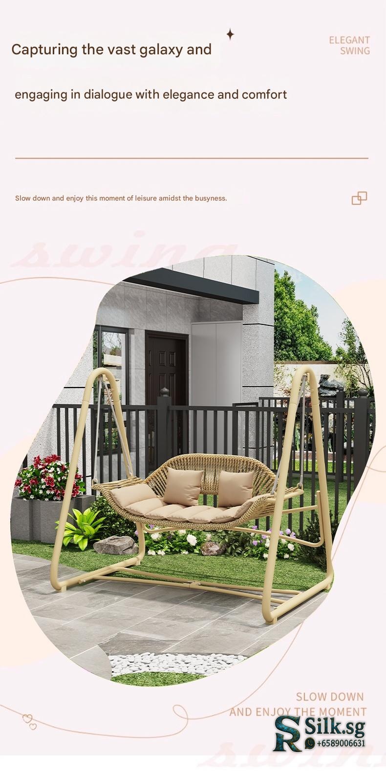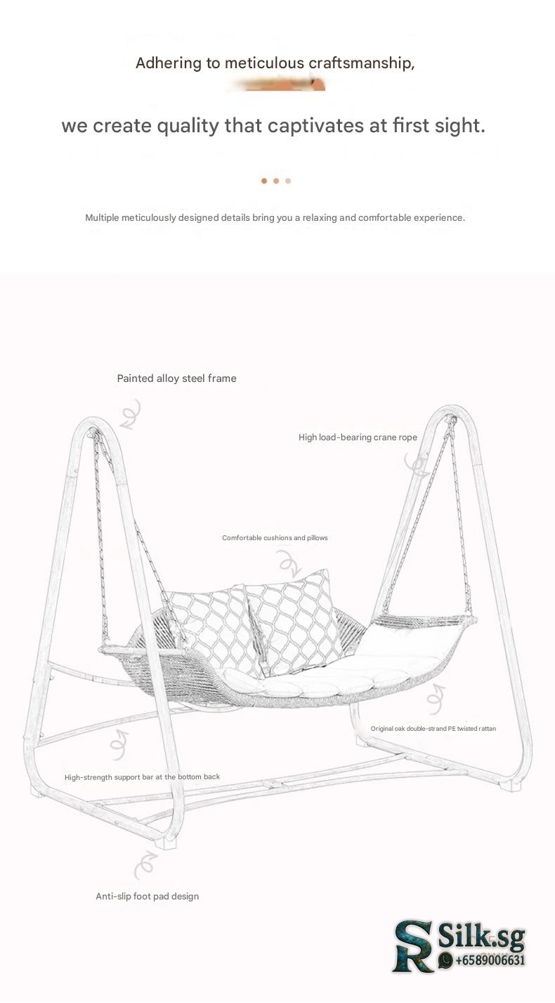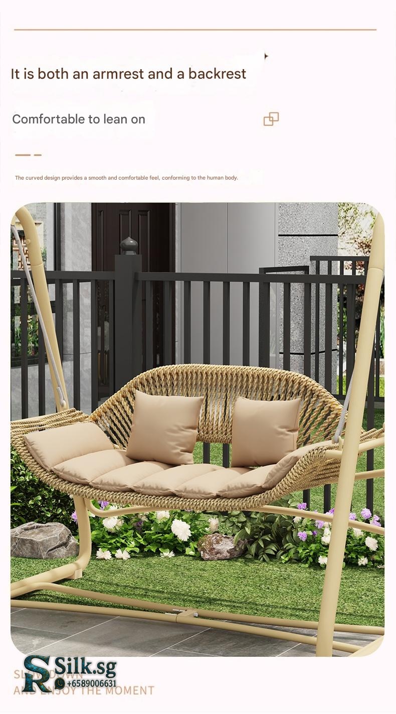 Relax and unwind in our outdoor swing chair, perfect for creating a cozy oasis in your garden or balcony. Designed for comfort and durability, it brings a soothing breeze and a touch of style to your outdoor space. Transform your free time into a serene retreat today.