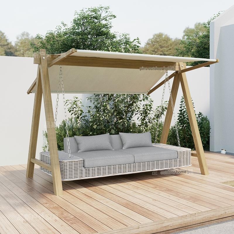 Outdoor double-seater swing bed with a wooden A-frame, wicker-style PE rattan seat, and gray fabric cushions. Features a beige canvas canopy for shade, stainless steel chain suspension, and a 300kg weight capacity. Perfect for patio or garden relaxation.