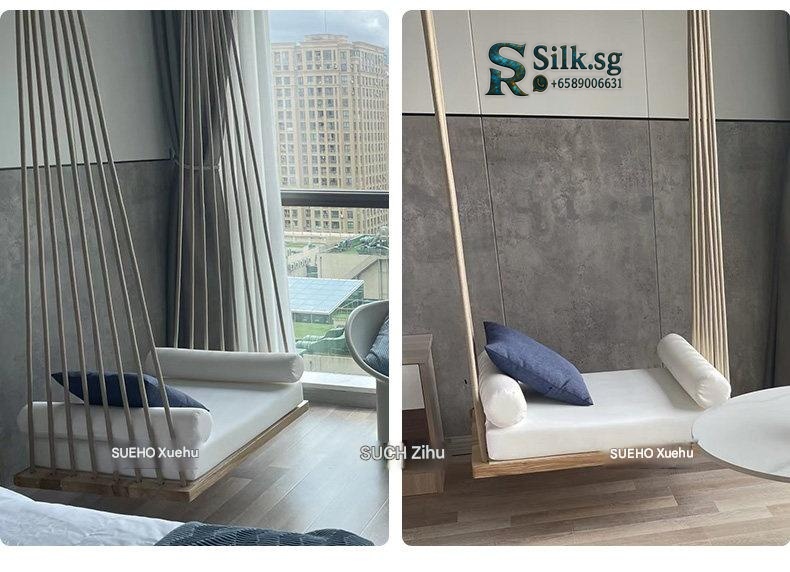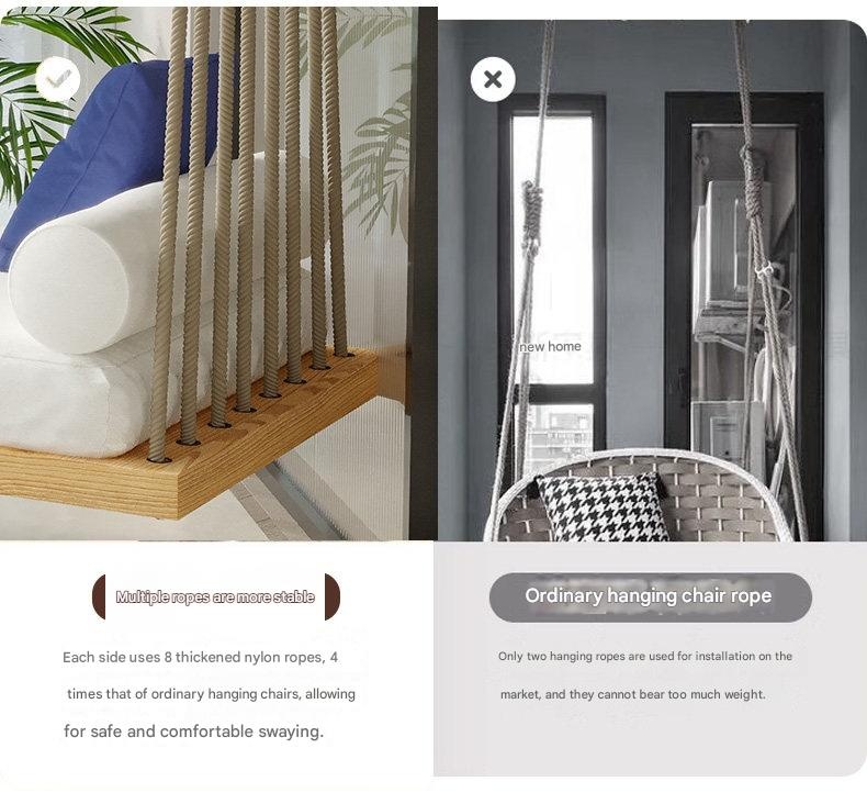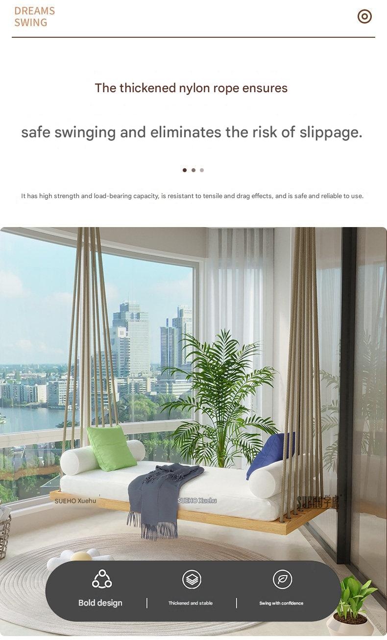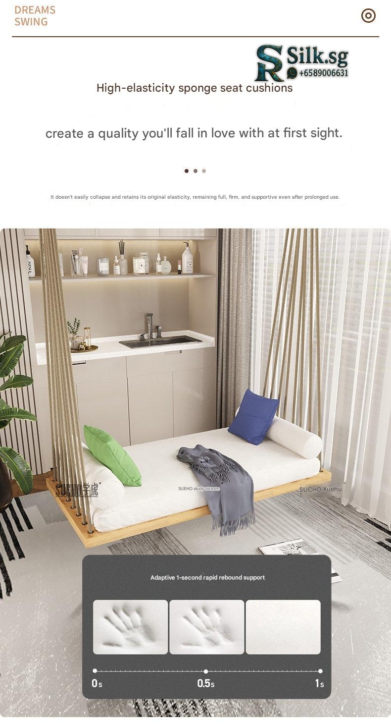 Modern hanging swing bed with a durable white waxwood frame, high-resilience foam cushions, and a multi-rope suspension system. Features adjustable height and includes decorative pillows, perfect for indoor relaxation in living rooms or balconies.