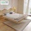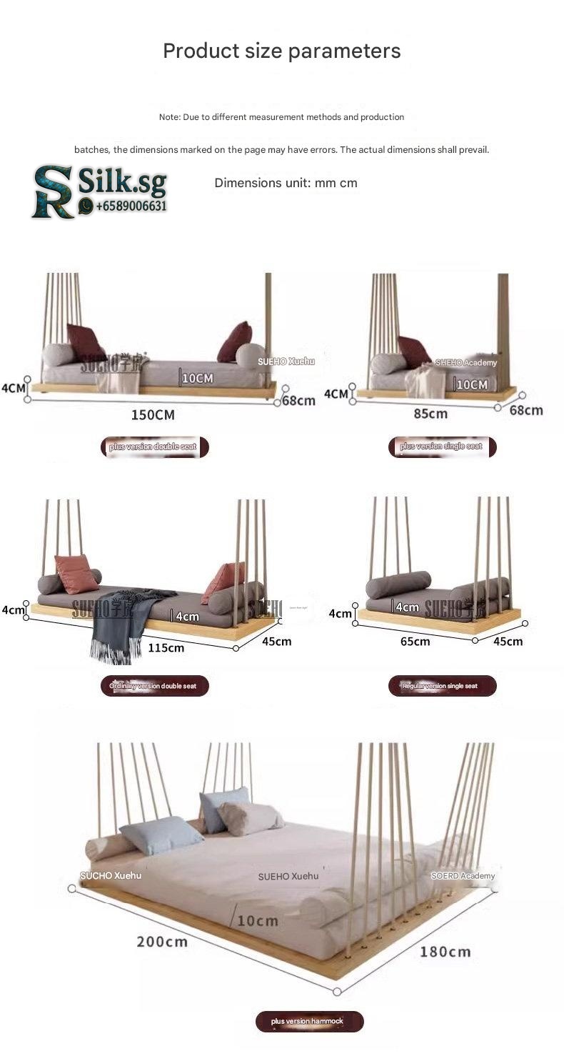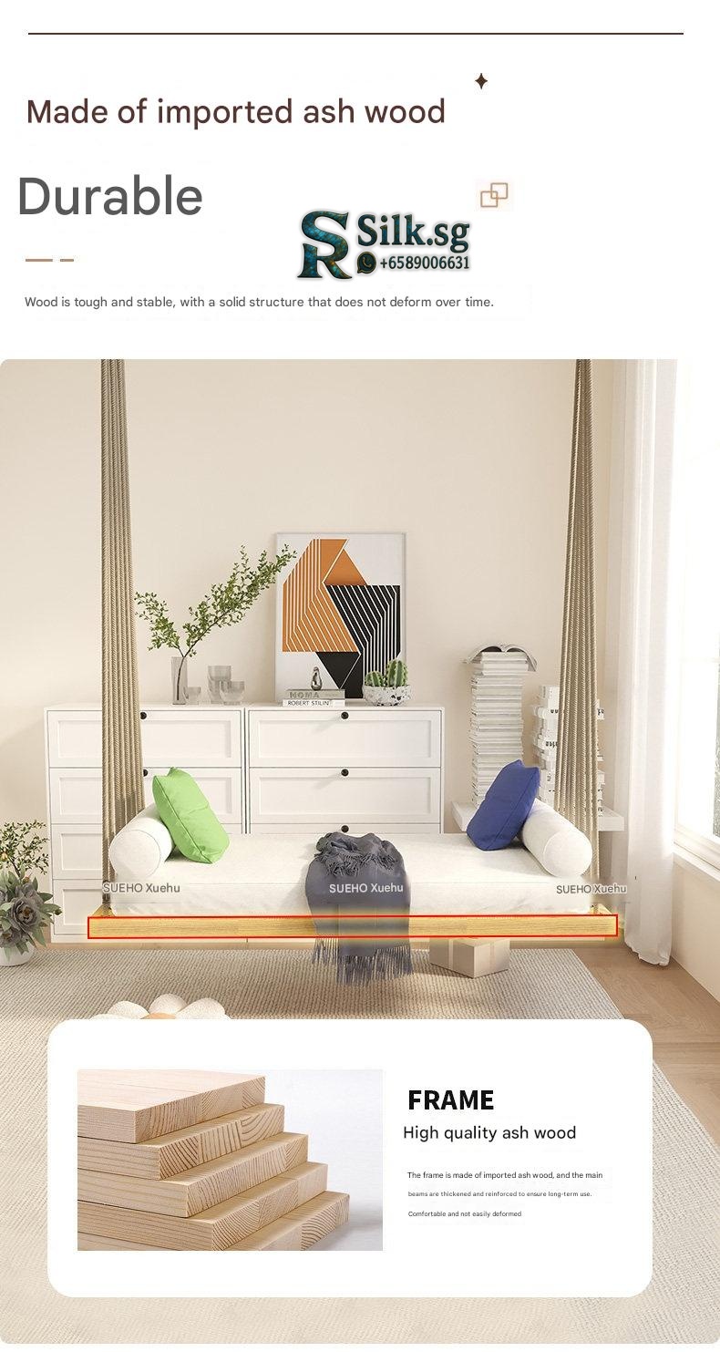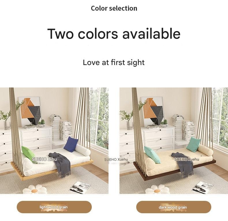 Modern hanging swing bed with a durable white waxwood frame, high-resilience foam cushions, and a multi-rope suspension system. Features adjustable height and includes decorative pillows, perfect for indoor relaxation in living rooms or balconies.