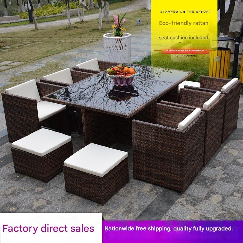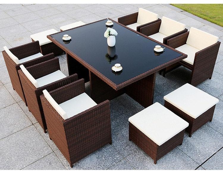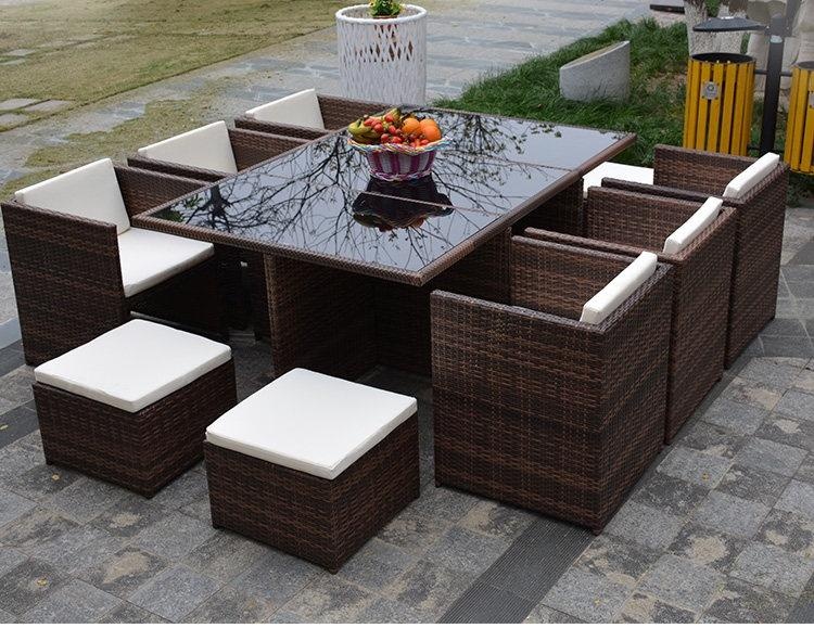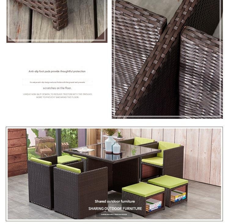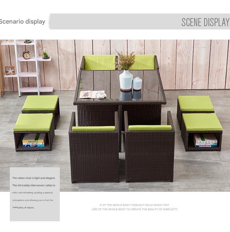 Outdoor rattan dining set with glass-top table, 6 chairs, and 2 ottomans. Features wicker-style construction, green fabric cushions, and anti-slip leg pads. Expandable table options available for 4-10 people. Customizable colors and fabrics.
