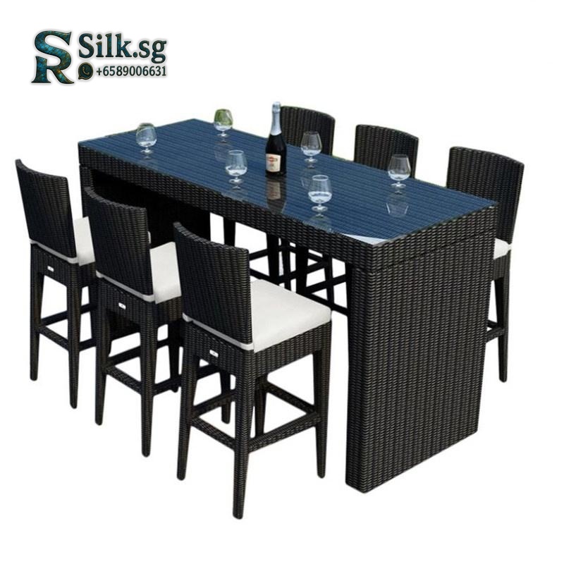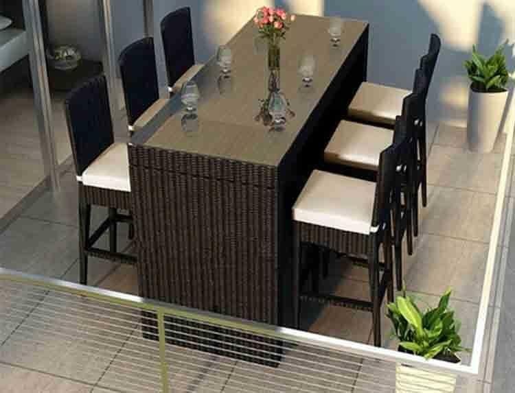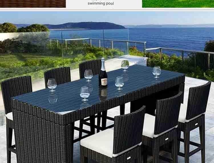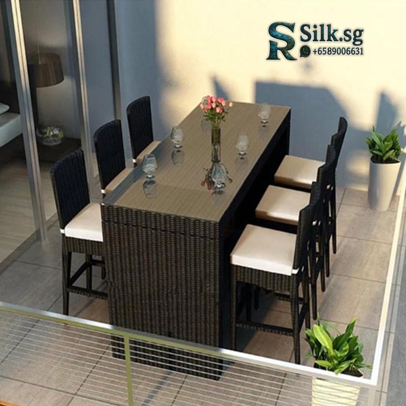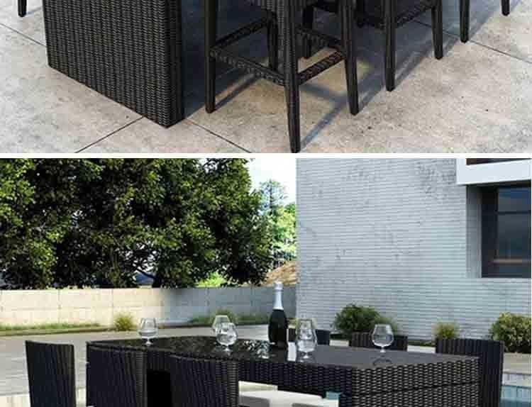Modern outdoor wicker bar set with glass-top table and cushioned high-back chairs. Crafted from durable, eco-friendly PE rattan, this movable iron frame set is UV-resistant and easy to clean. Perfect for patio, garden, or poolside dining. Available in multiple size configurations.