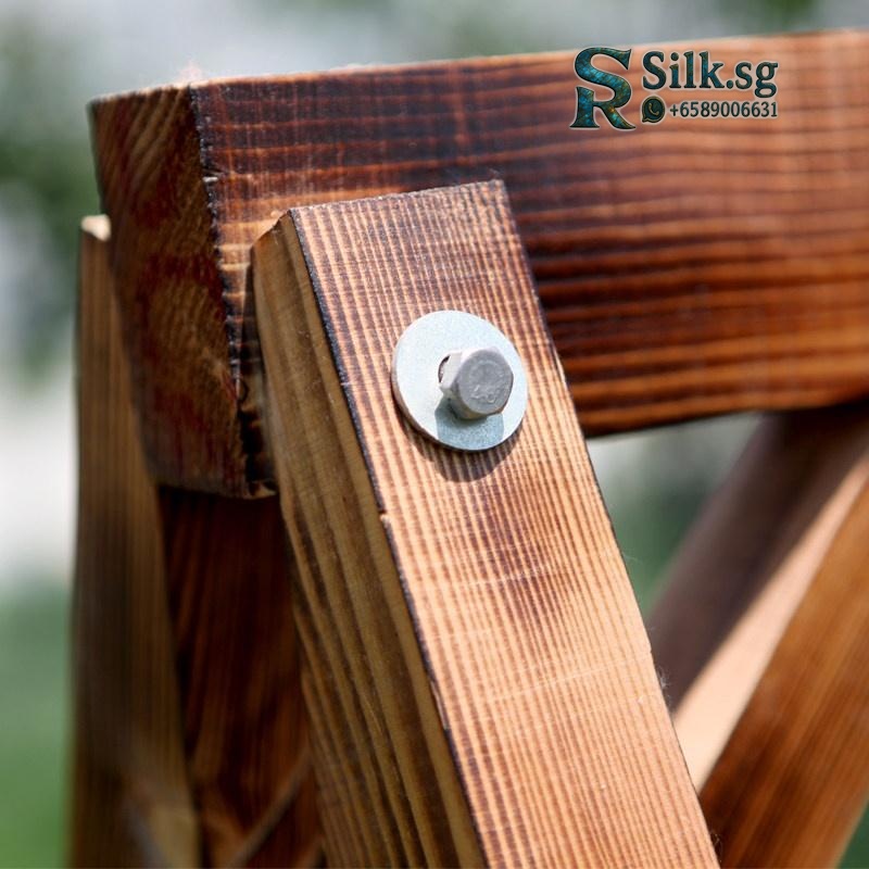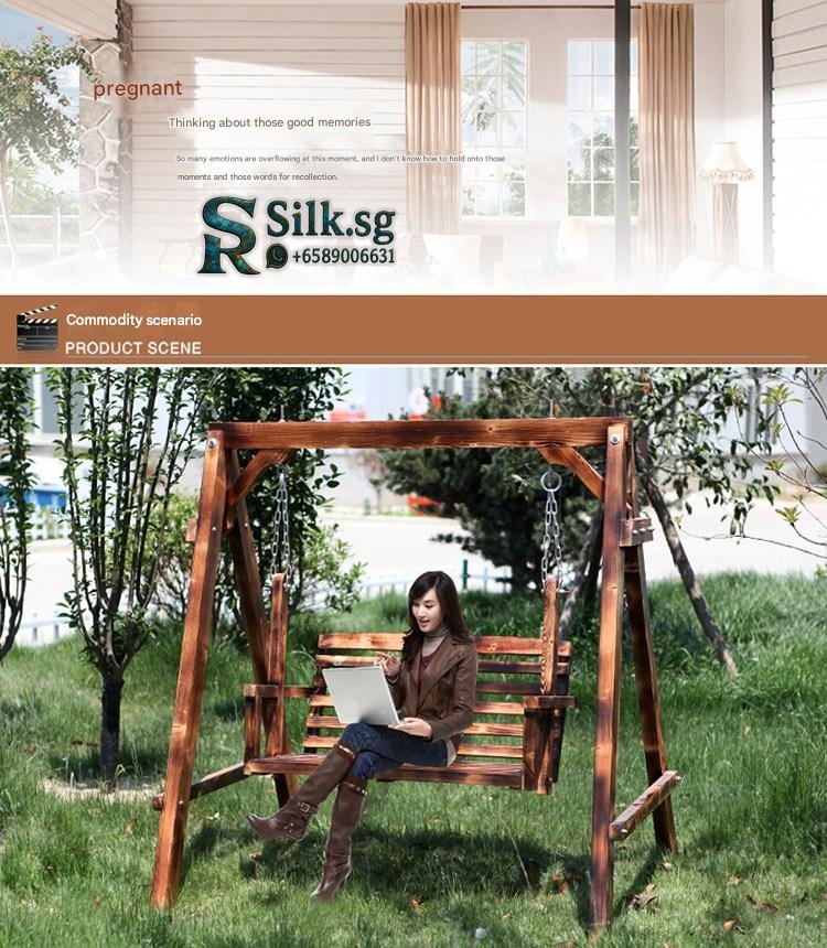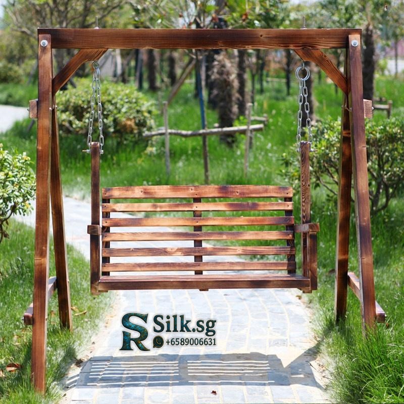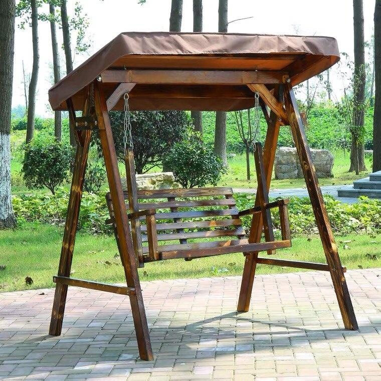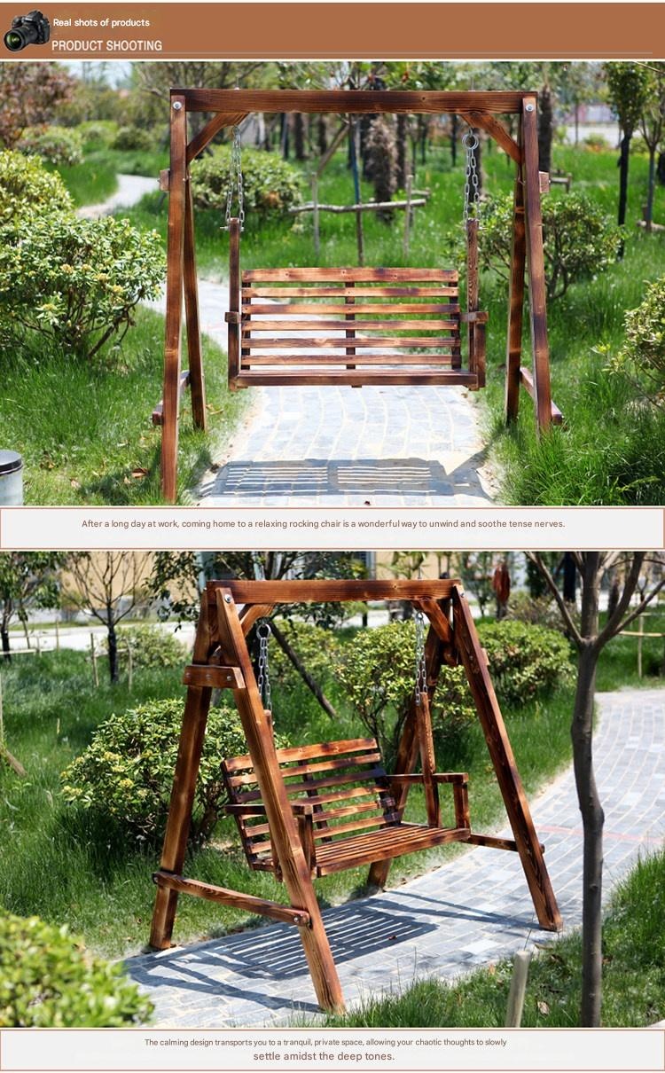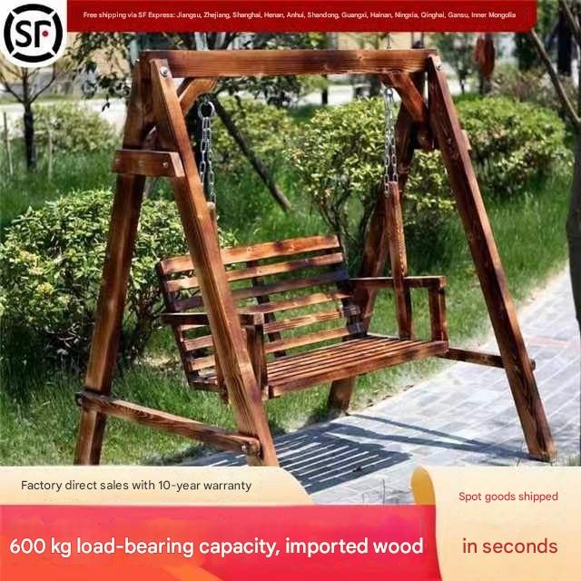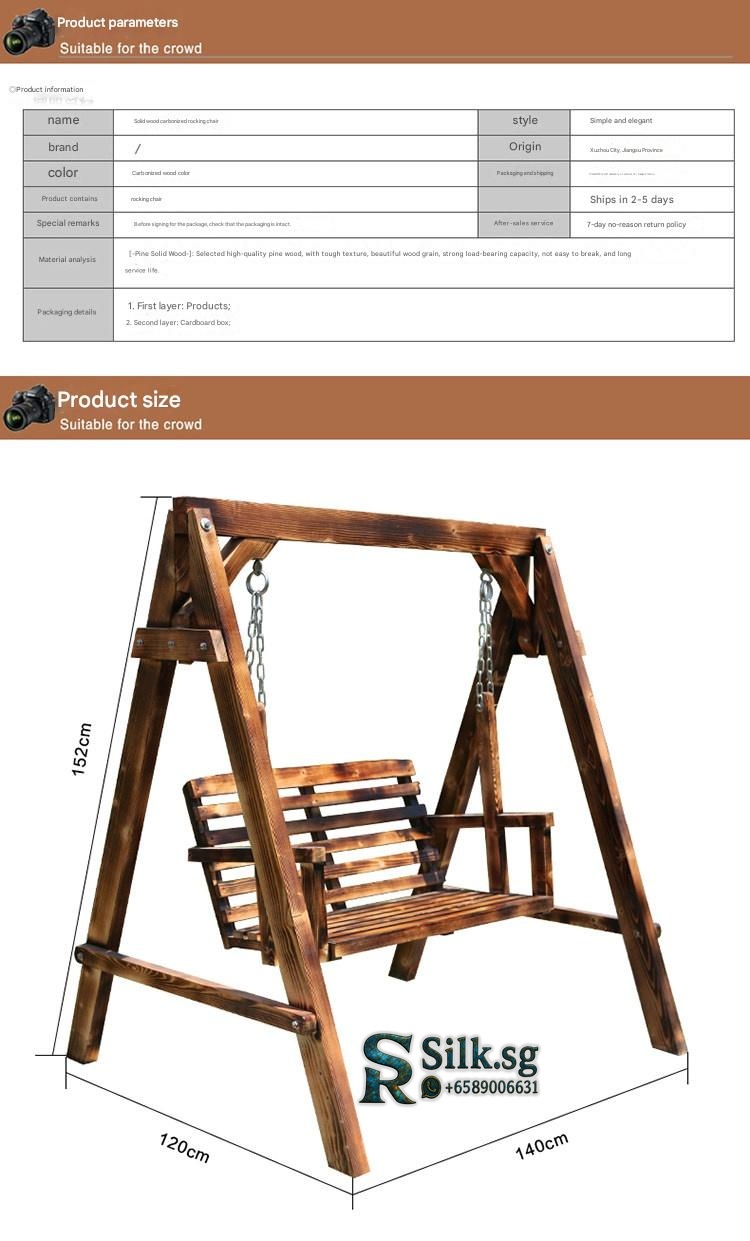 XTT Solid Wood Outdoor Swing Chair. Constructed from 100% solid Russian Scots pine with a carbonized, anti-corrosion finish for durability. A-frame dimensions are approximately 162cm H x 140cm W x 120cm D. Features a two-person slatted seat and backrest suspended by stainless steel chains, with a rated weight capacity of 300 kg. Designed for outdoor use on patios, in gardens, or on balconies. Assembly is required; an installation manual is provided. Variants may include different wood finishes and the option of an attached canopy for shade.