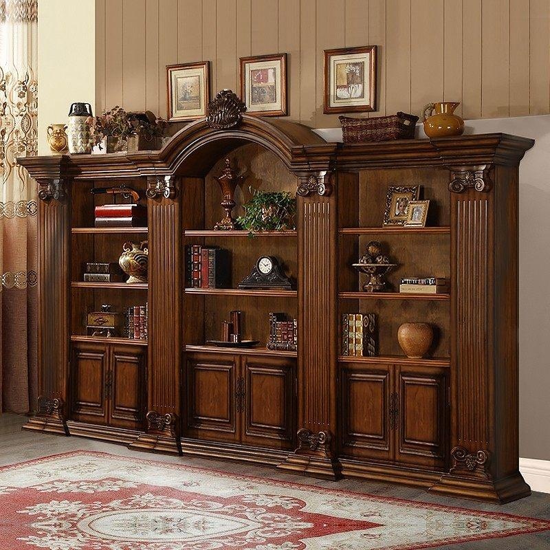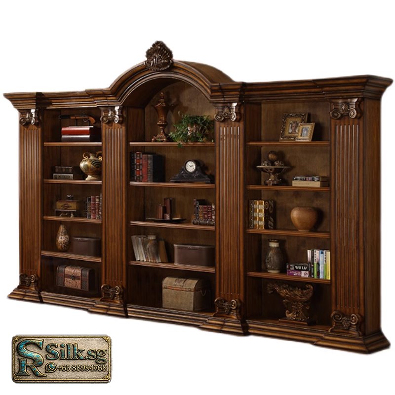 Classical solid wood bookcase with ornate hand-carved details, featuring multiple shelves and glass-paneled cabinet doors. Customizable in size, finish, and configuration. Includes full-service delivery, installation, and a 3-year warranty.