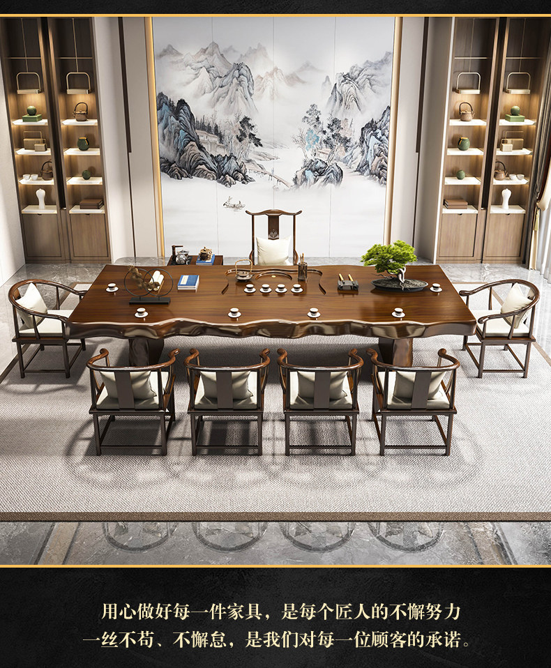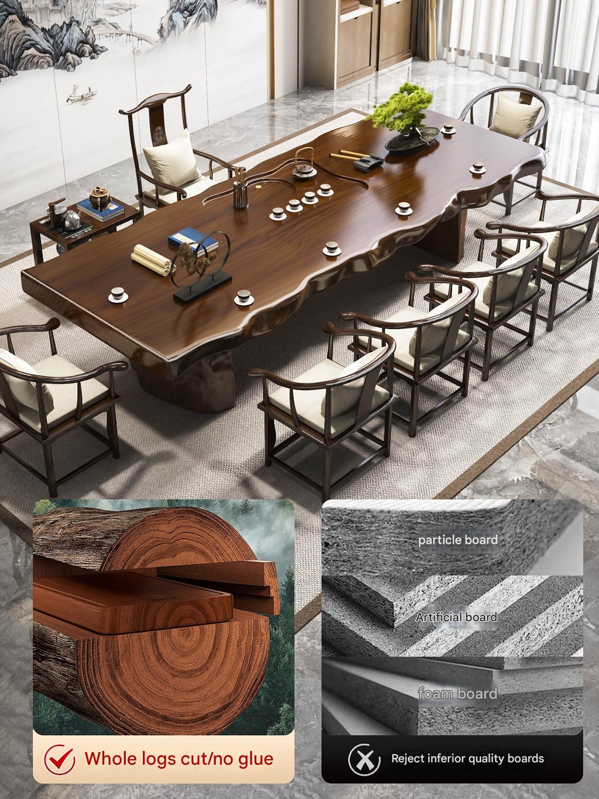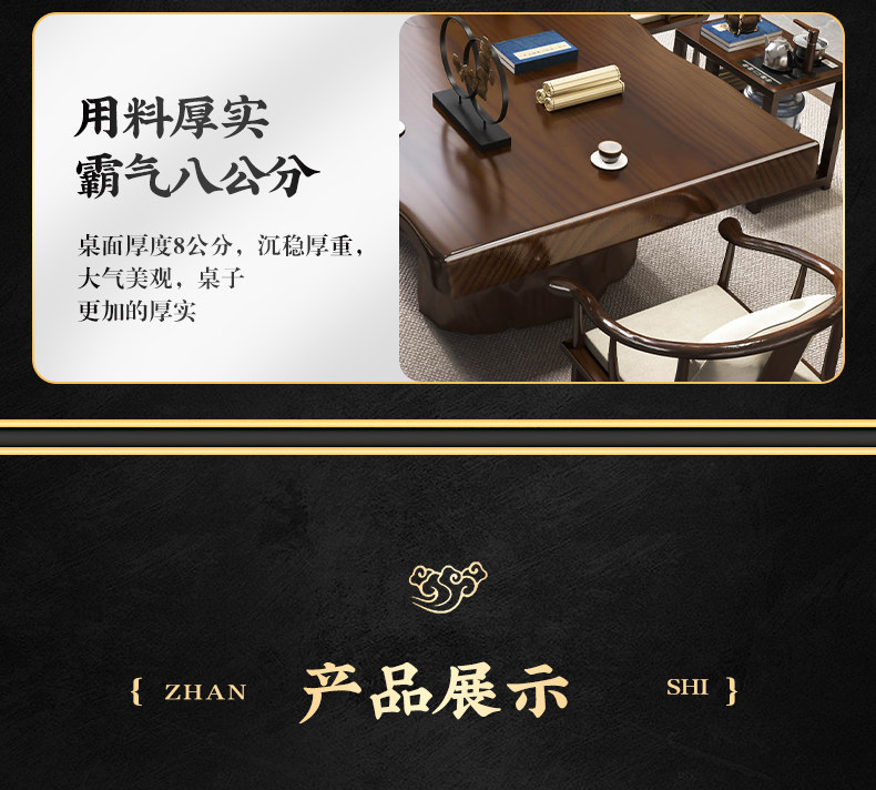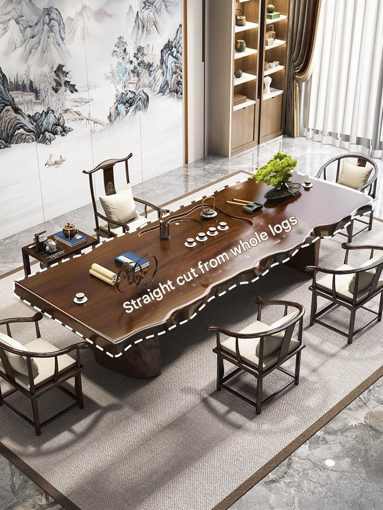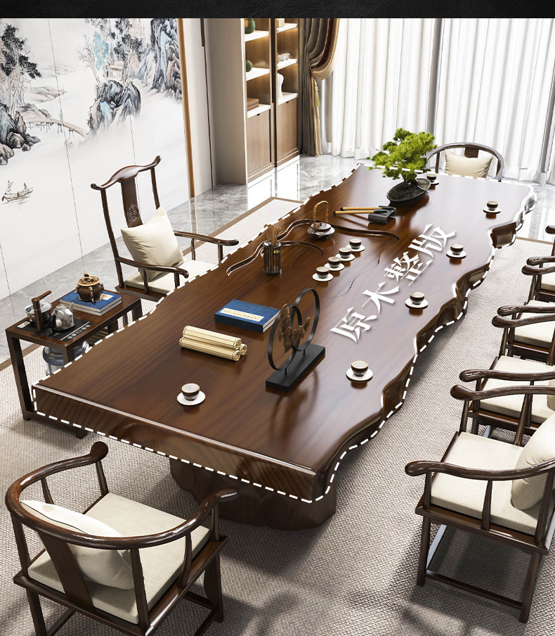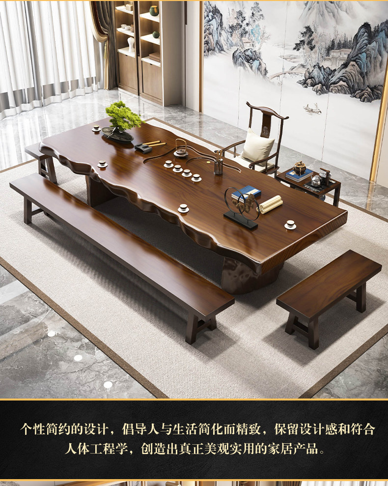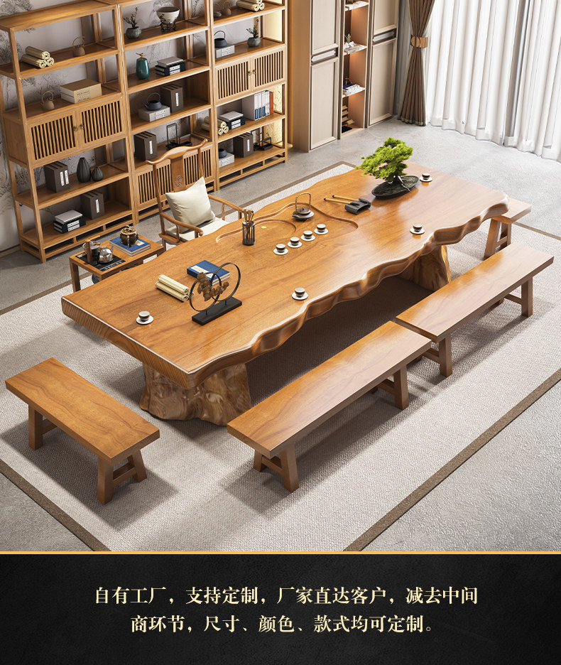 Traditional Chinese-style solid wood tea table set with natural live edge design, customizable dimensions (120-300cm length), and matching benches. Handcrafted from high-quality wood with 8cm thick tabletops, this modern中式 furniture features slatted cabinet shelving units and includes a complete tea service. Perfect for living rooms or study areas, offering 3-year warranty with multiple finish and layout variations.