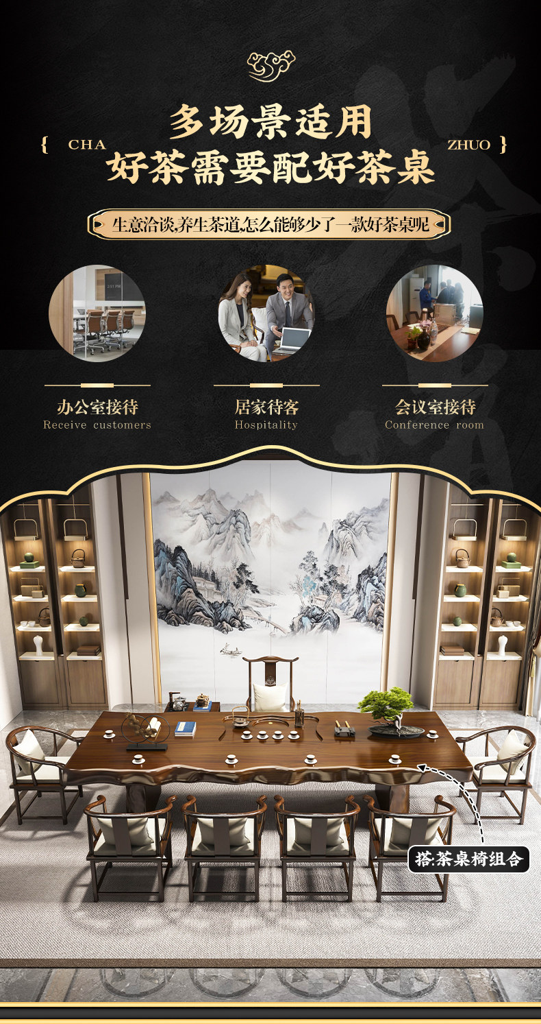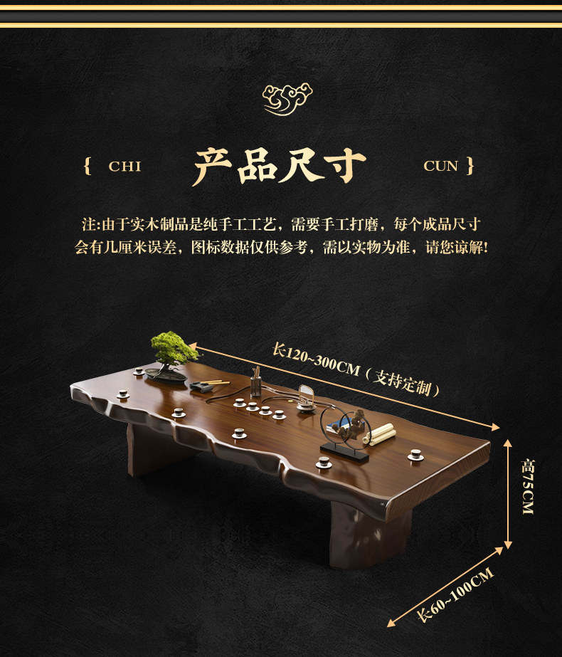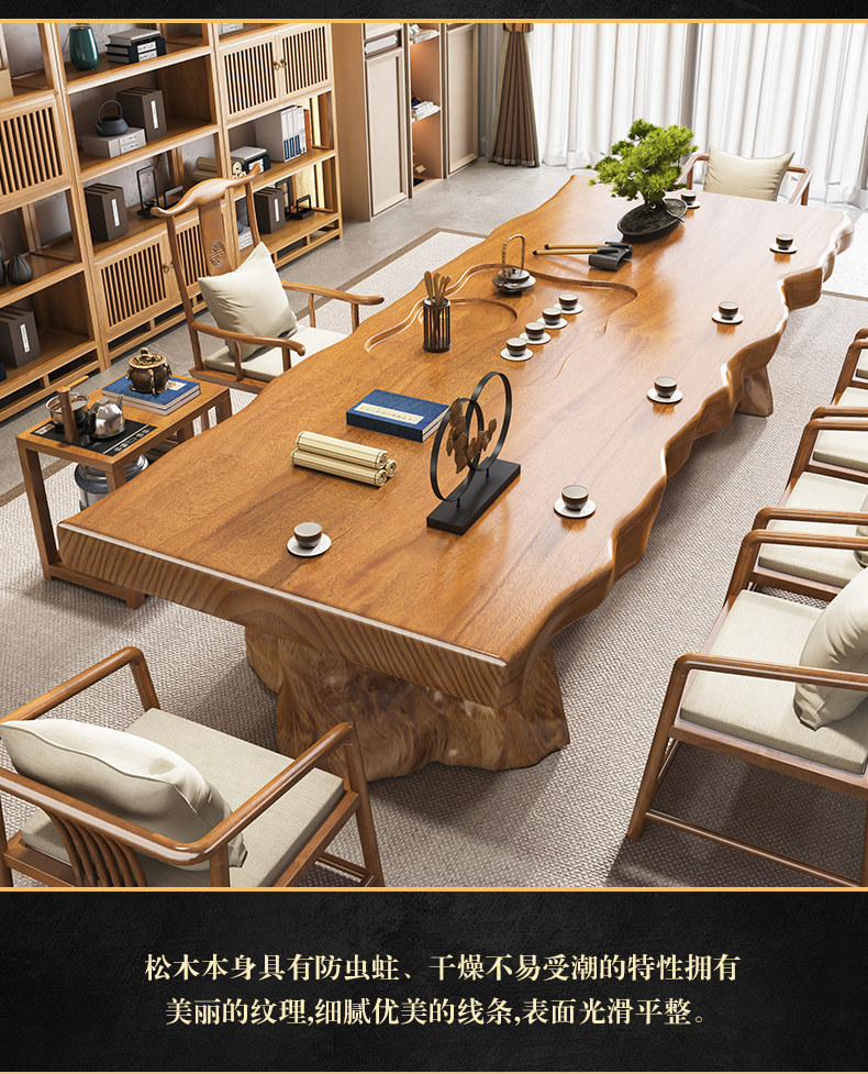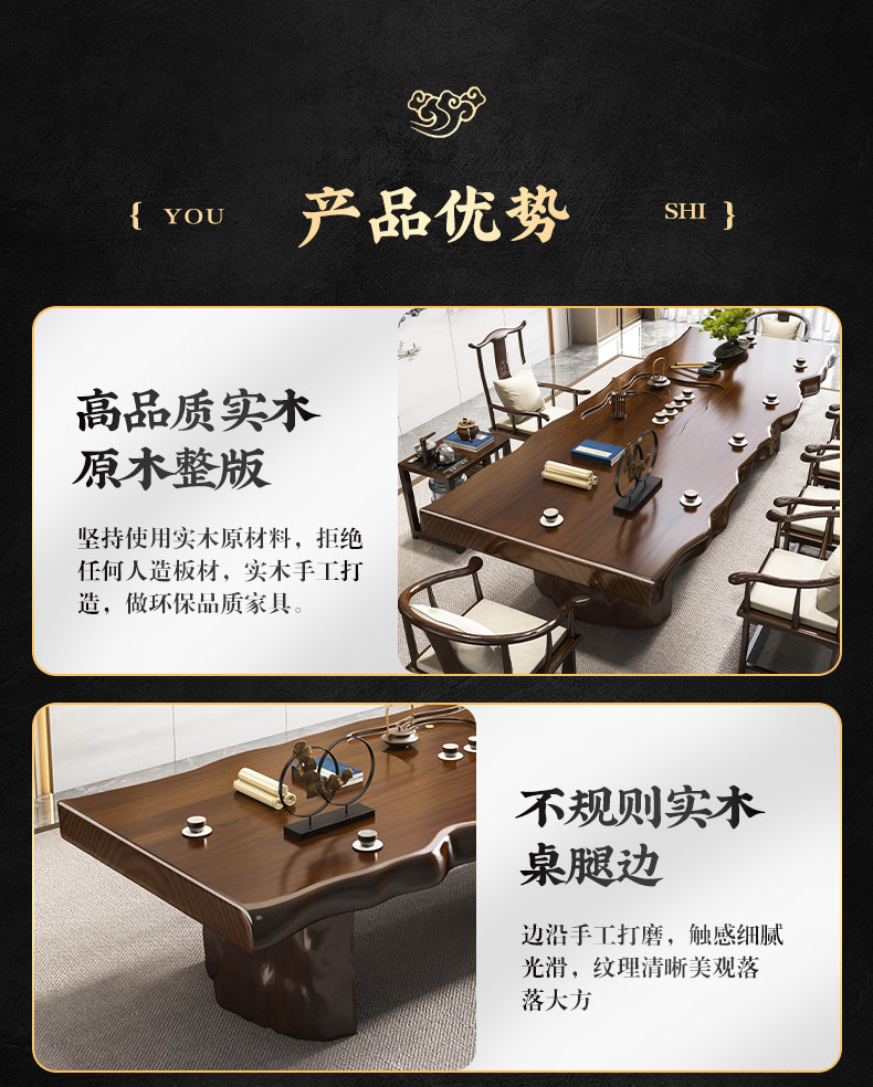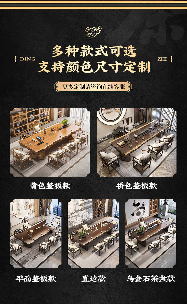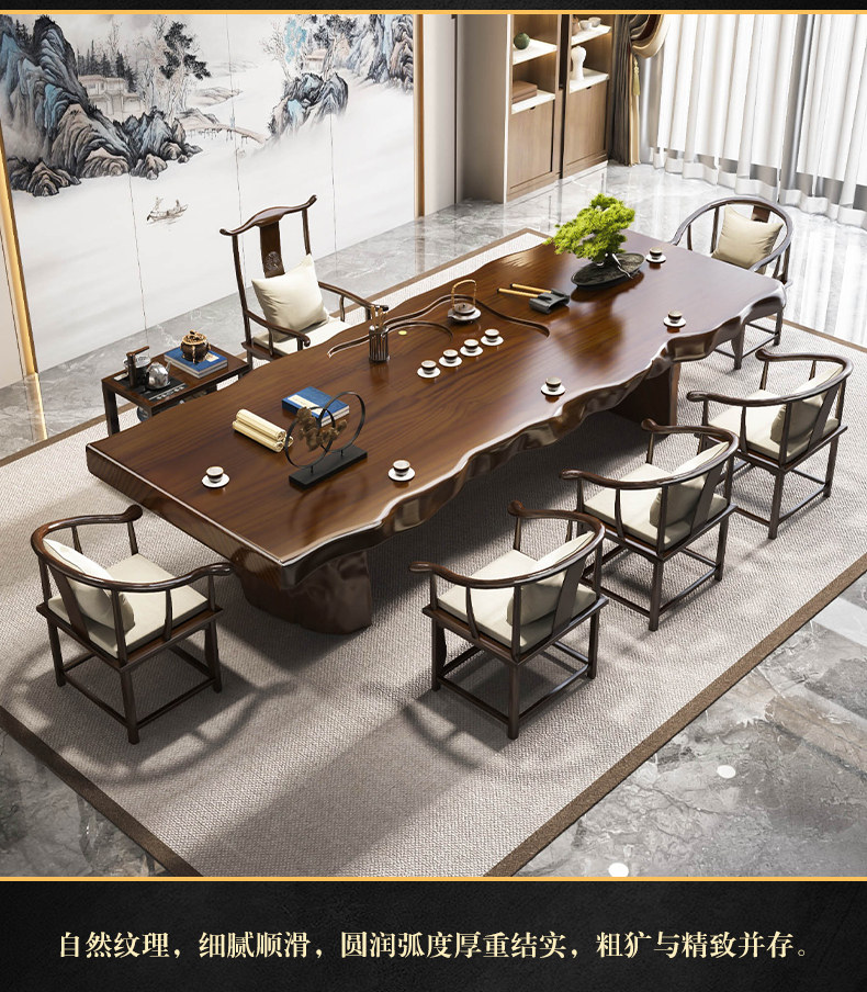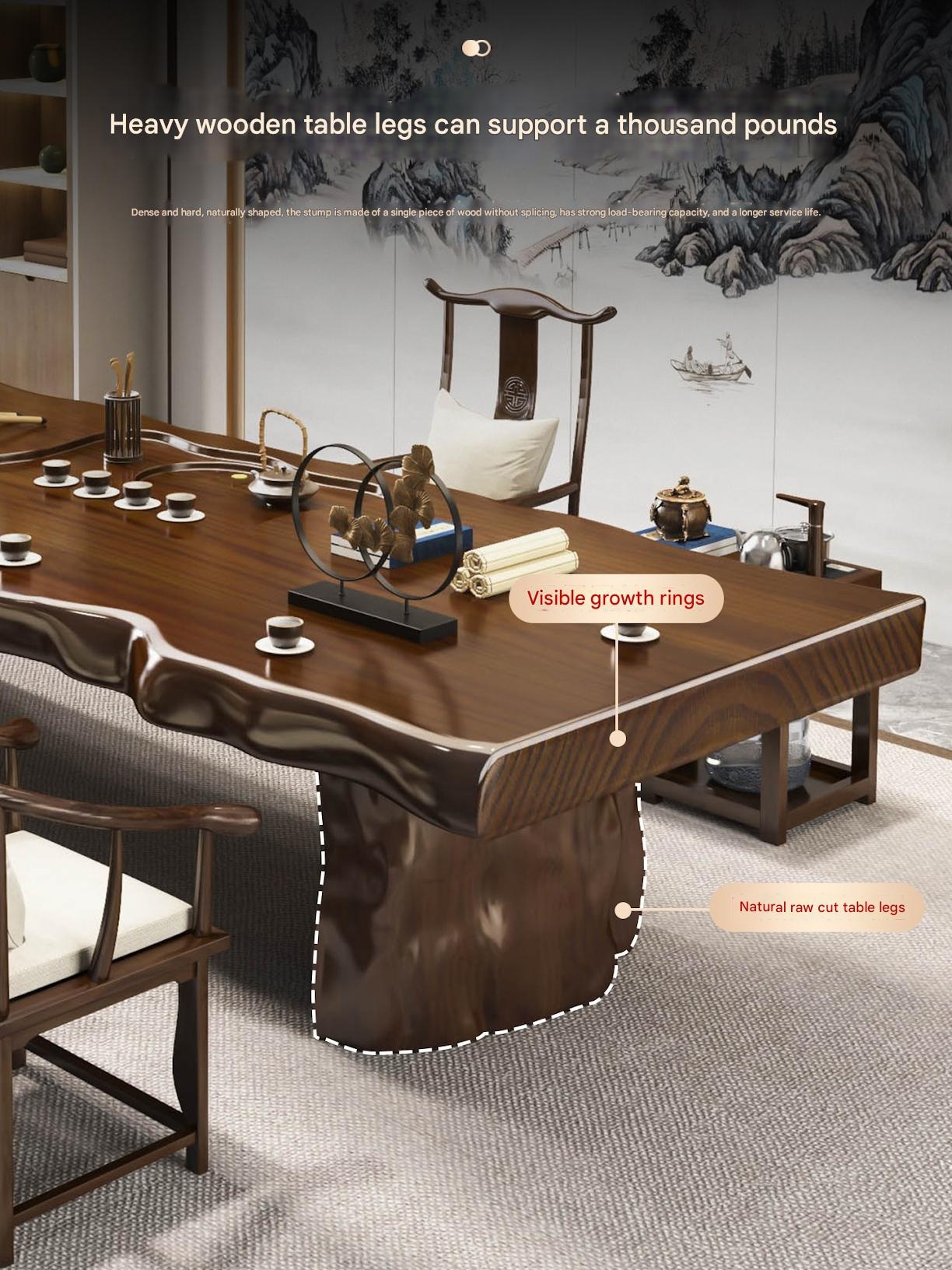 Traditional Chinese-style solid wood tea table set with natural live edge design, customizable dimensions (120-300cm length), and matching benches. Handcrafted from high-quality wood with 8cm thick tabletops, this modern中式 furniture features slatted cabinet shelving units and includes a complete tea service. Perfect for living rooms or study areas, offering 3-year warranty with multiple finish and layout variations.
