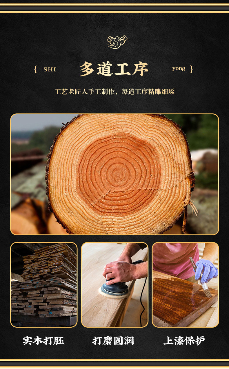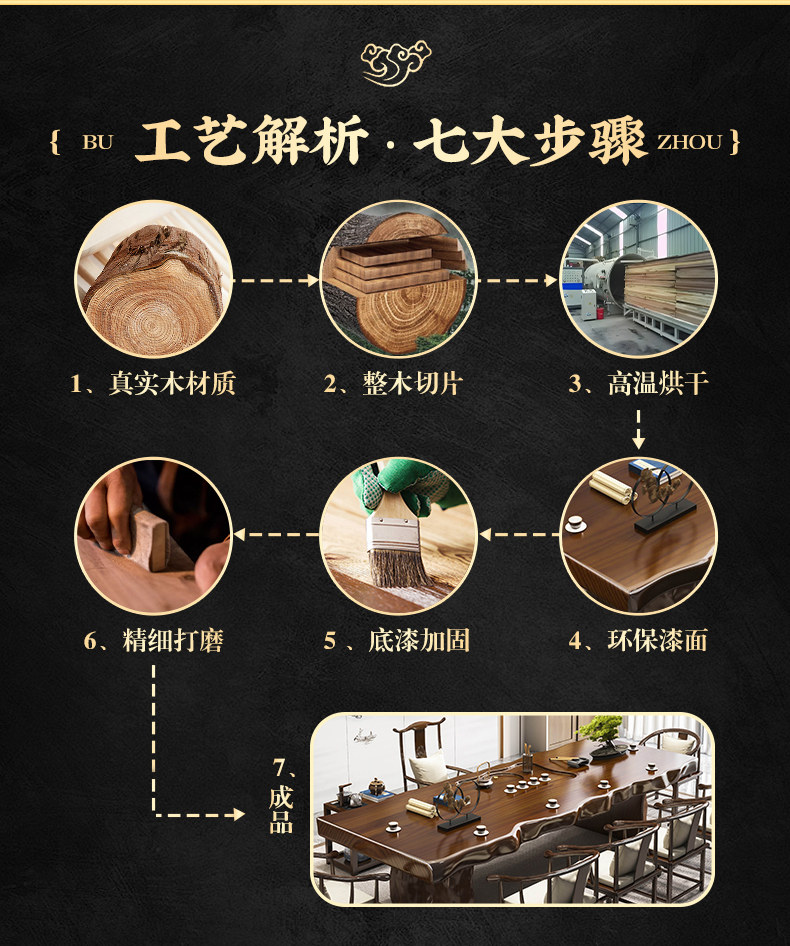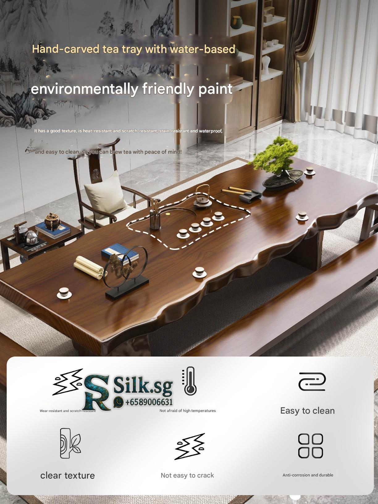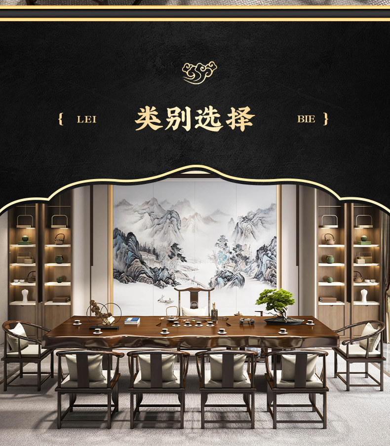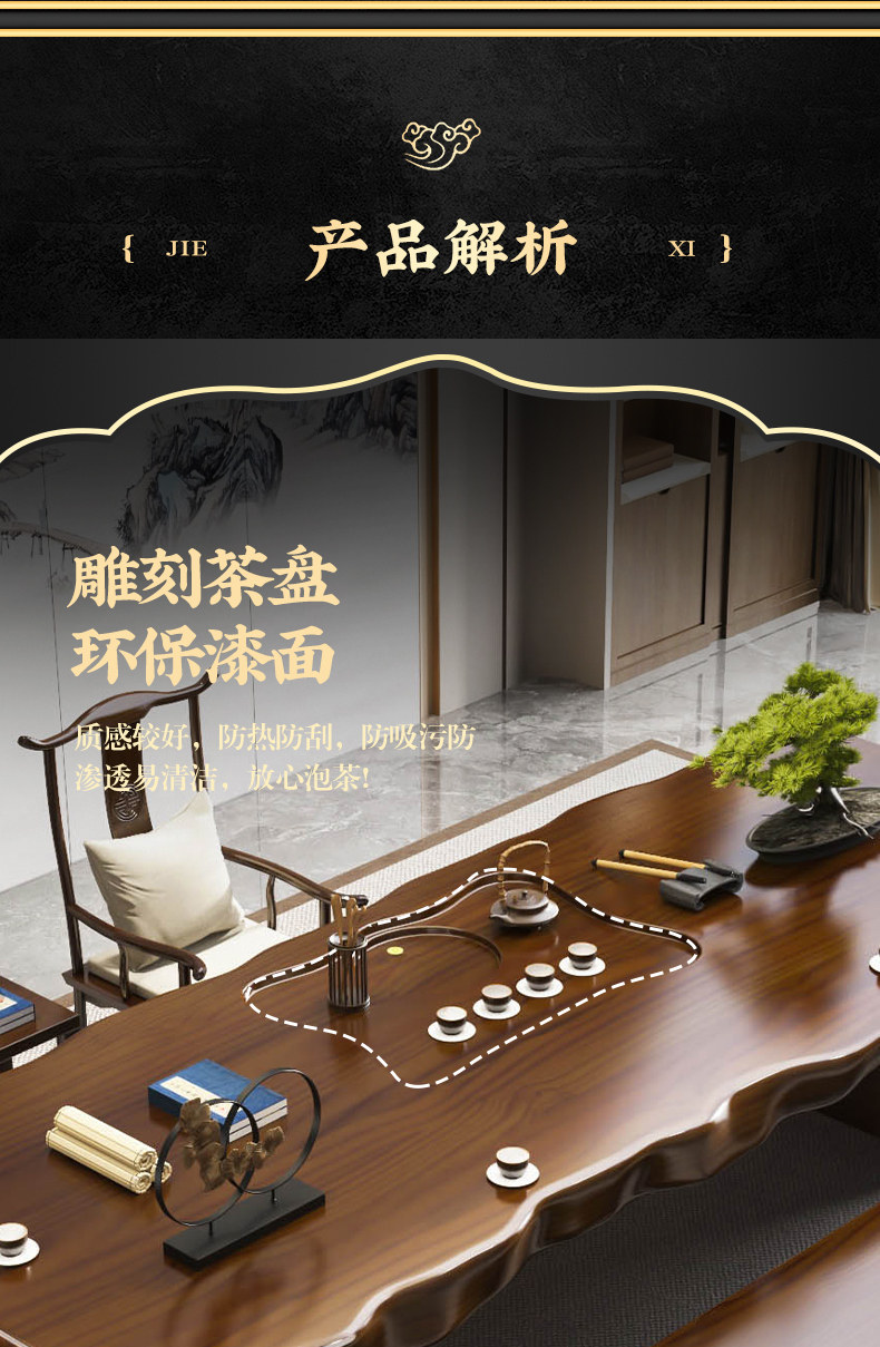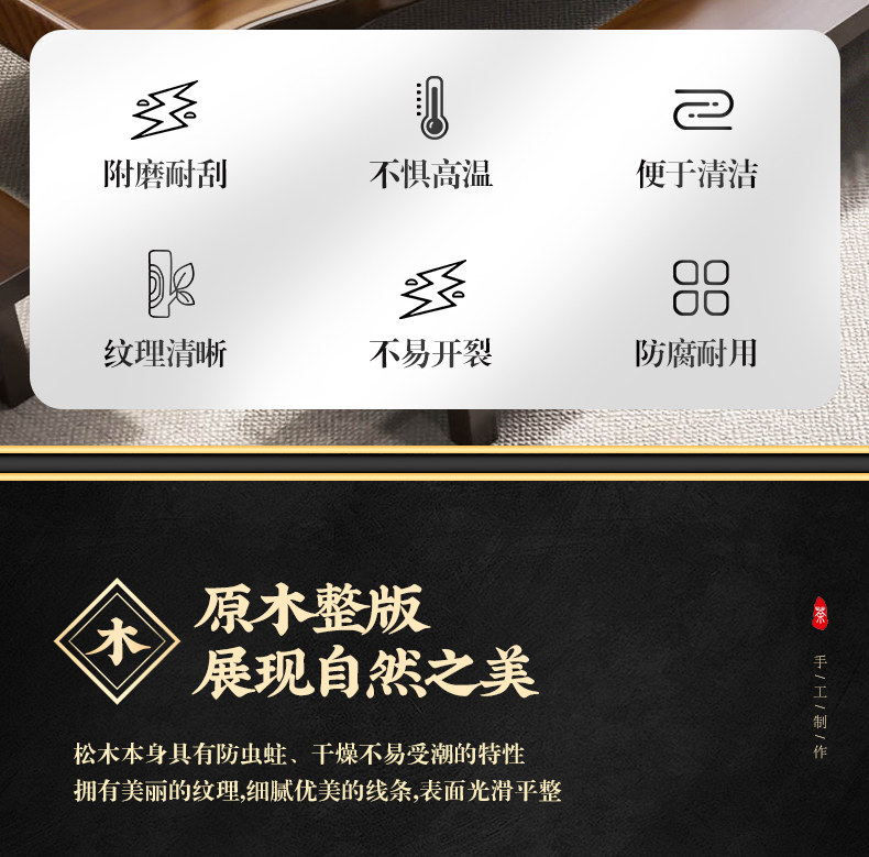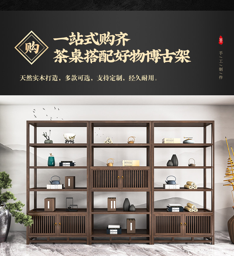 Traditional Chinese-style solid wood tea table set with natural live edge design, customizable dimensions (120-300cm length), and matching benches. Handcrafted from high-quality wood with 8cm thick tabletops, this modern中式 furniture features slatted cabinet shelving units and includes a complete tea service. Perfect for living rooms or study areas, offering 3-year warranty with multiple finish and layout variations.
