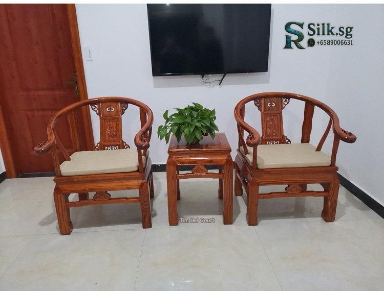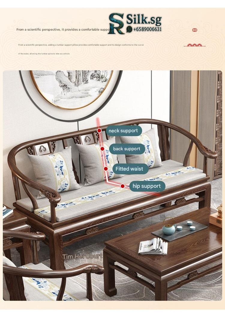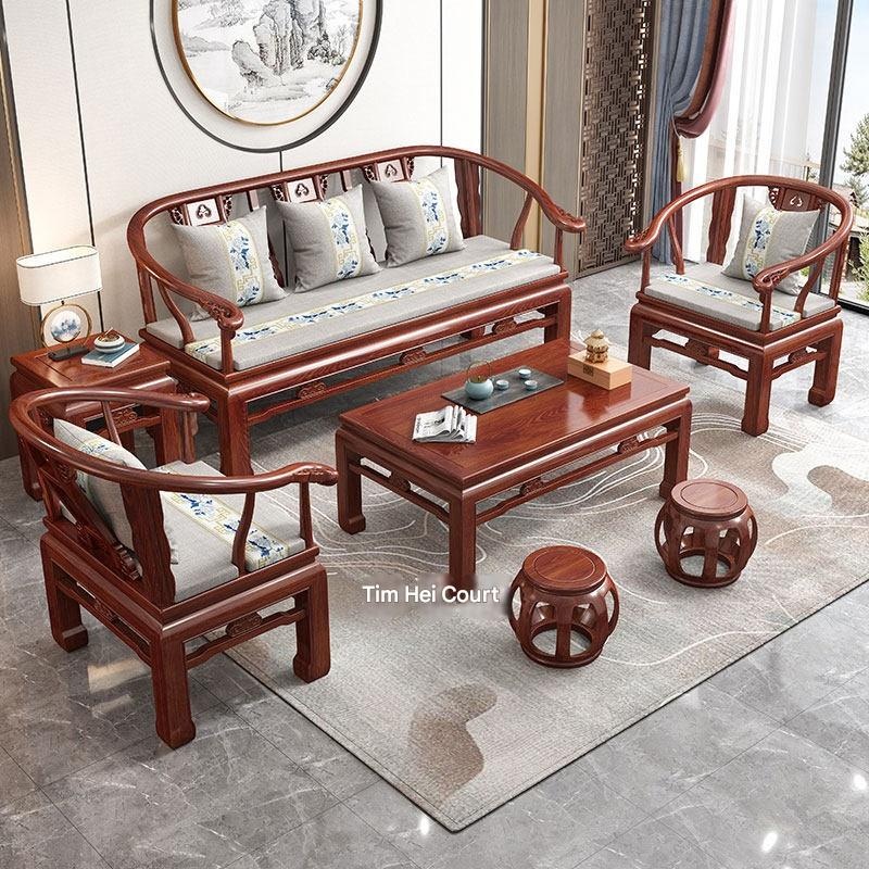 Traditional Chinese-style solid wood living room furniture set, featuring a sofa, armchairs, coffee table, and side table with carved details and light beige cushions. Handcrafted from natural wood with detailed dimensions provided. Fixed options: Set: Set