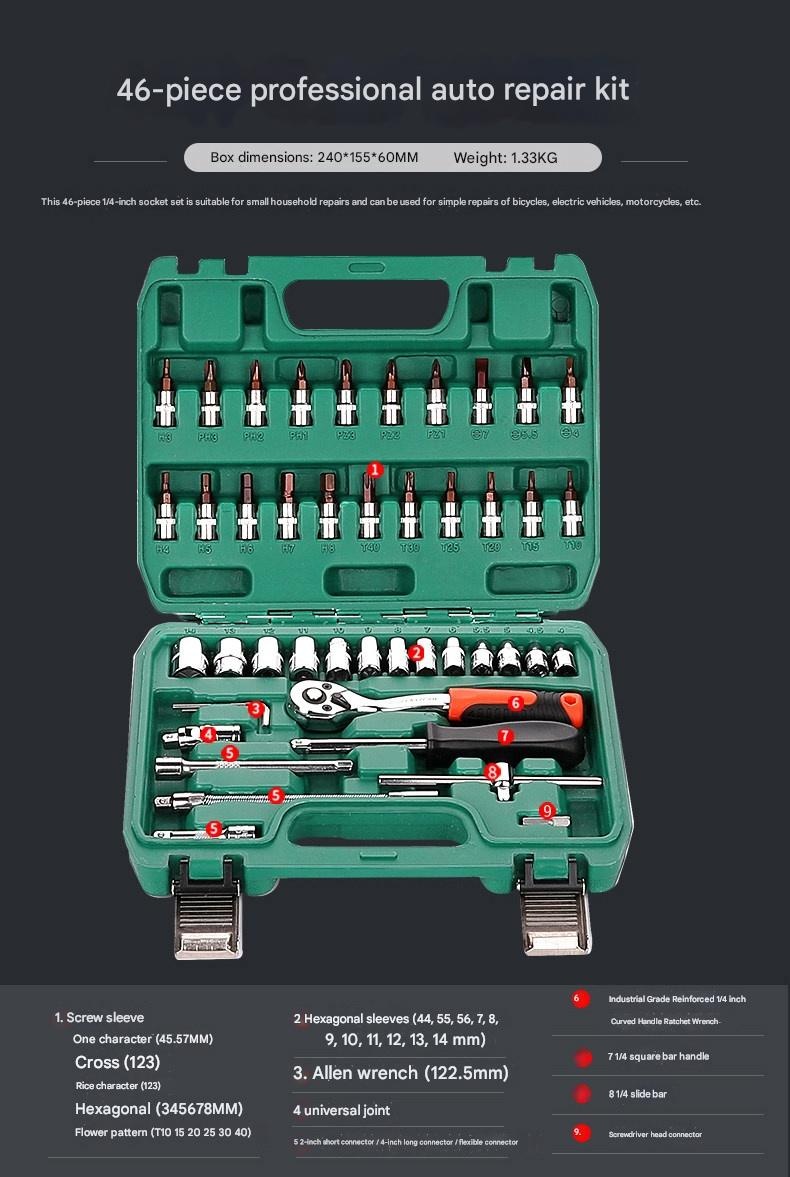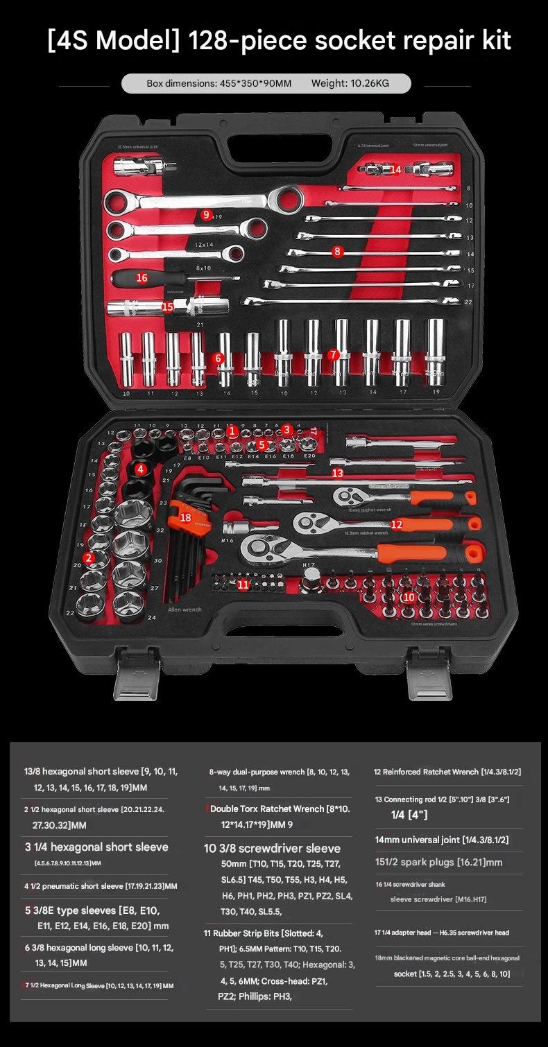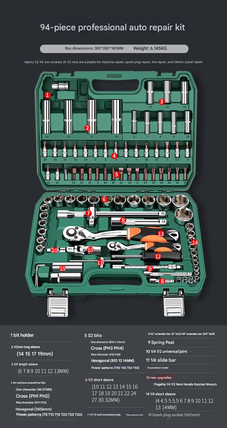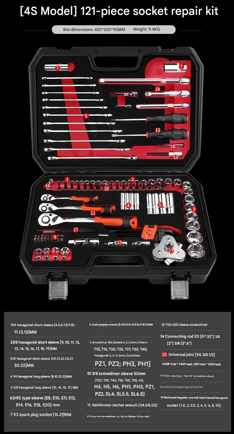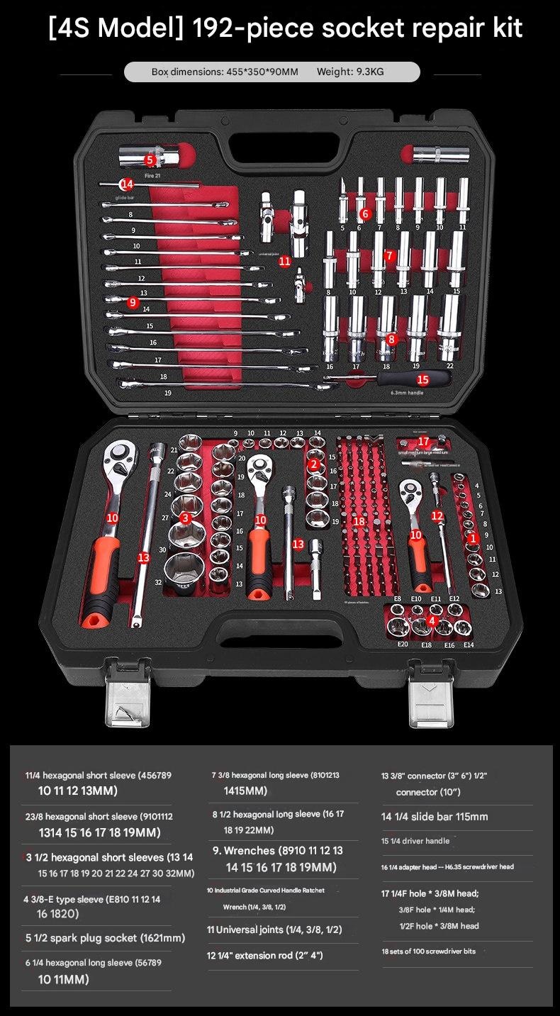 | Set | 4S Anti-Drop 210-Piece Set + 600N·m Electric Impact Wrench, 4S Anti-Drop 255-Piece Set + 850N·m Electric Impact Wrench, 4S Anti-Drop 72-Tooth Bent Handle 128-Piece Set, 4S Anti-Drop 72-Tooth Bent Handle 192-Piece Set, 4S Anti-Drop 72-Tooth Bent Handle 210-Piece Set, 4S Anti-Drop 72-Tooth Bent Handle 255-Piece Set, 4S Anti-Drop 72-Tooth Bent Handle 98-Piece Set, 5x Effort-Saving 90-Tooth X-Type Wrench 162-Piece Auto Repair Set, 72-Tooth Bent Handle Auto Repair 108-Piece Set, 72-Tooth Bent Handle Auto Repair 121-Piece Set, 72-Tooth Bent Handle Auto Repair 150-Piece Set, 72-Tooth Bent Handle Auto Repair 32-Piece Set, 72-Tooth Bent Handle Auto Repair 37-Piece Set, 72-Tooth Bent Handle Auto Repair 44-Piece Set, 72-Tooth Bent Handle Auto Repair 46-Piece Set, 72-Tooth Bent Handle Auto Repair 47-Piece Set, 72-Tooth Bent Handle Auto Repair 53-Piece Set, 72-Tooth Bent Handle Auto Repair 61-Piece Set, 72-Tooth Bent Handle Auto Repair 82-Piece Set, 72-Tooth Bent Handle Auto Repair 94-Piece Set, Detachable Quick-Release Wrench Rack Mobile Repair 128-Piece Set, Enhanced Straight Handle 46-Piece Set, Enhanced Straight Handle 62-Piece Set, Multi-Spec Straight Handle 48-Piece Set, Professional 72-Tooth Bent Handle Auto Repair 100-Piece Set, Professional 72-Tooth Bent Handle Auto Repair 45-Piece Set, Professional 72-Tooth Bent Handle Auto Repair 70-Piece Set, S2 Straight Handle 46-Piece Set, S2 Straight Handle 49-Piece Set, Straight Handle 46-Piece Set, Straight Handle 46-Piece Set 1, Straight Handle 47-Piece Set with Adjustable Wrench, Straight Handle 55-Piece Set, Straight Handle 56-Piece Set, Upgraded 72-Tooth Bent Handle Auto Repair 108-Piece Set, Upgraded 72-Tooth Bent Handle Auto Repair 121-Piece Set, Upgraded 72-Tooth Bent Handle Auto Repair 150-Piece Set, Upgraded 72-Tooth Bent Handle Auto Repair 172-Piece Set, Upgraded 72-Tooth Bent Handle Auto Repair 216-Piece Set, Upgraded 72-Tooth Bent Handle Auto Repair 32-Piece Set, Upgraded 72-Tooth Bent Handle Auto Repair 37-Piece Set, Upgraded 72-Tooth Bent Handle Auto Repair 44-Piece Set, Upgraded 72-Tooth Bent Handle Auto Repair 46-Piece Set, Upgraded 72-Tooth Bent Handle Auto Repair 47-Piece Set, Upgraded 72-Tooth Bent Handle Auto Repair 53-Piece Set, Upgraded 72-Tooth Bent Handle Auto Repair 61-Piece Set, Upgraded 72-Tooth Bent Handle Auto Repair 82-Piece Set, Upgraded 72-Tooth Bent Handle Auto Repair 94-Piece Set, Upgraded Ratchet 72-Tooth Bent Handle Auto Repair 37-Piece Set |
