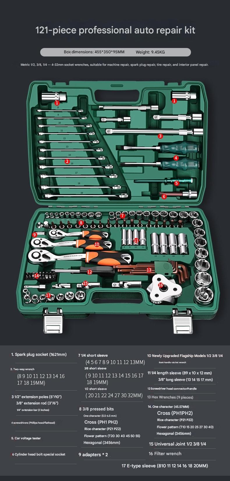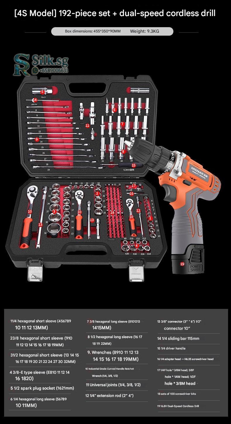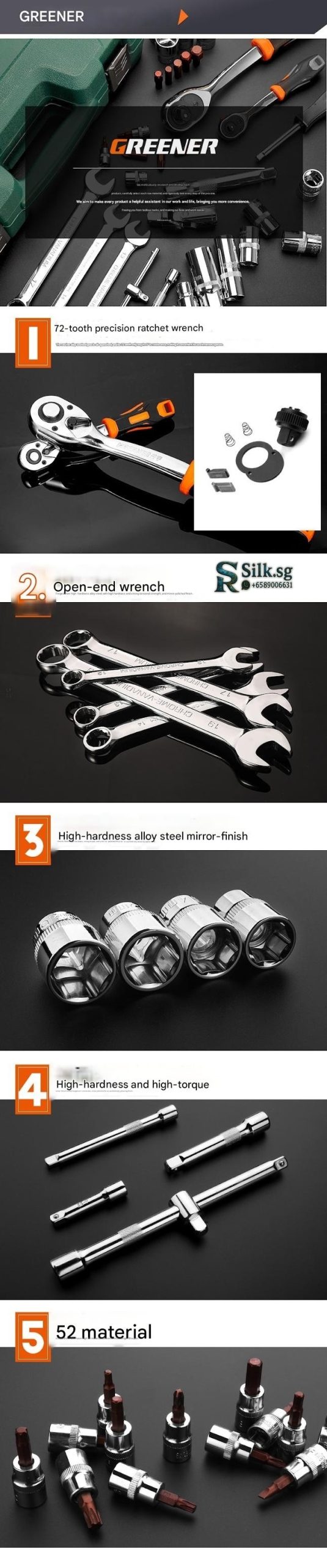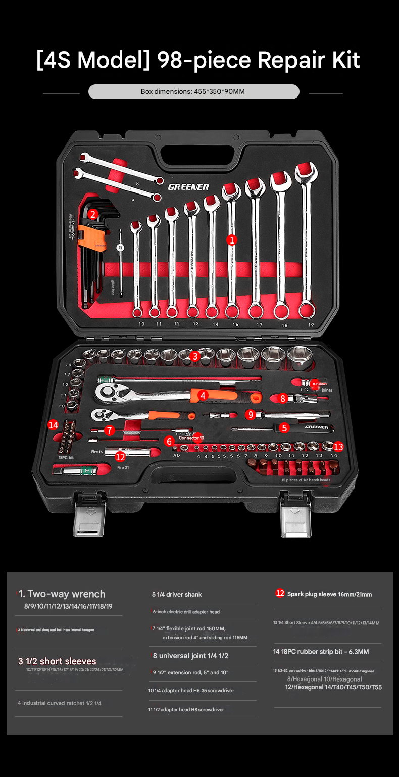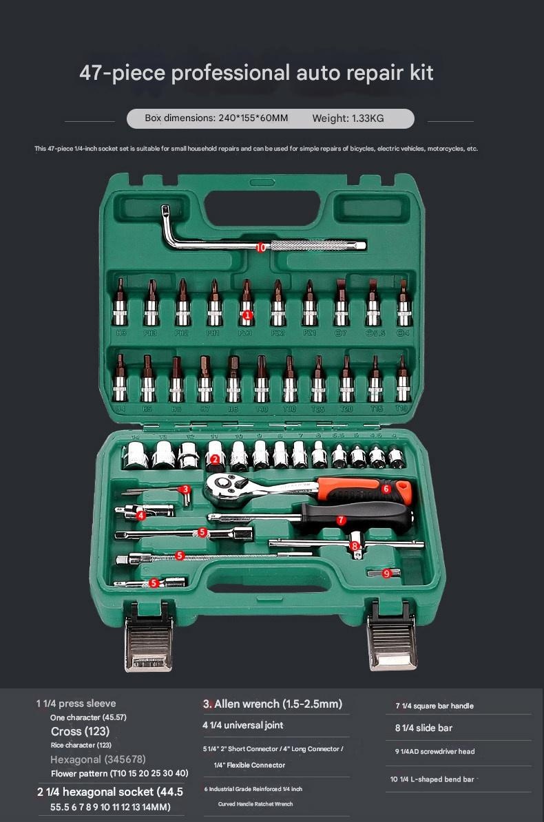 | Set | 4S Anti-Drop 210-Piece Set + 600N·m Electric Impact Wrench, 4S Anti-Drop 255-Piece Set + 850N·m Electric Impact Wrench, 4S Anti-Drop 72-Tooth Bent Handle 128-Piece Set, 4S Anti-Drop 72-Tooth Bent Handle 192-Piece Set, 4S Anti-Drop 72-Tooth Bent Handle 210-Piece Set, 4S Anti-Drop 72-Tooth Bent Handle 255-Piece Set, 4S Anti-Drop 72-Tooth Bent Handle 98-Piece Set, 5x Effort-Saving 90-Tooth X-Type Wrench 162-Piece Auto Repair Set, 72-Tooth Bent Handle Auto Repair 108-Piece Set, 72-Tooth Bent Handle Auto Repair 121-Piece Set, 72-Tooth Bent Handle Auto Repair 150-Piece Set, 72-Tooth Bent Handle Auto Repair 32-Piece Set, 72-Tooth Bent Handle Auto Repair 37-Piece Set, 72-Tooth Bent Handle Auto Repair 44-Piece Set, 72-Tooth Bent Handle Auto Repair 46-Piece Set, 72-Tooth Bent Handle Auto Repair 47-Piece Set, 72-Tooth Bent Handle Auto Repair 53-Piece Set, 72-Tooth Bent Handle Auto Repair 61-Piece Set, 72-Tooth Bent Handle Auto Repair 82-Piece Set, 72-Tooth Bent Handle Auto Repair 94-Piece Set, Detachable Quick-Release Wrench Rack Mobile Repair 128-Piece Set, Enhanced Straight Handle 46-Piece Set, Enhanced Straight Handle 62-Piece Set, Multi-Spec Straight Handle 48-Piece Set, Professional 72-Tooth Bent Handle Auto Repair 100-Piece Set, Professional 72-Tooth Bent Handle Auto Repair 45-Piece Set, Professional 72-Tooth Bent Handle Auto Repair 70-Piece Set, S2 Straight Handle 46-Piece Set, S2 Straight Handle 49-Piece Set, Straight Handle 46-Piece Set, Straight Handle 46-Piece Set 1, Straight Handle 47-Piece Set with Adjustable Wrench, Straight Handle 55-Piece Set, Straight Handle 56-Piece Set, Upgraded 72-Tooth Bent Handle Auto Repair 108-Piece Set, Upgraded 72-Tooth Bent Handle Auto Repair 121-Piece Set, Upgraded 72-Tooth Bent Handle Auto Repair 150-Piece Set, Upgraded 72-Tooth Bent Handle Auto Repair 172-Piece Set, Upgraded 72-Tooth Bent Handle Auto Repair 216-Piece Set, Upgraded 72-Tooth Bent Handle Auto Repair 32-Piece Set, Upgraded 72-Tooth Bent Handle Auto Repair 37-Piece Set, Upgraded 72-Tooth Bent Handle Auto Repair 44-Piece Set, Upgraded 72-Tooth Bent Handle Auto Repair 46-Piece Set, Upgraded 72-Tooth Bent Handle Auto Repair 47-Piece Set, Upgraded 72-Tooth Bent Handle Auto Repair 53-Piece Set, Upgraded 72-Tooth Bent Handle Auto Repair 61-Piece Set, Upgraded 72-Tooth Bent Handle Auto Repair 82-Piece Set, Upgraded 72-Tooth Bent Handle Auto Repair 94-Piece Set, Upgraded Ratchet 72-Tooth Bent Handle Auto Repair 37-Piece Set |