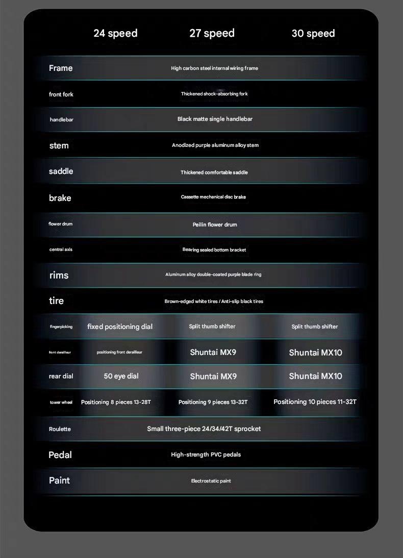 | Gears | 24-Speed, 27-Speed, 30-Speed |